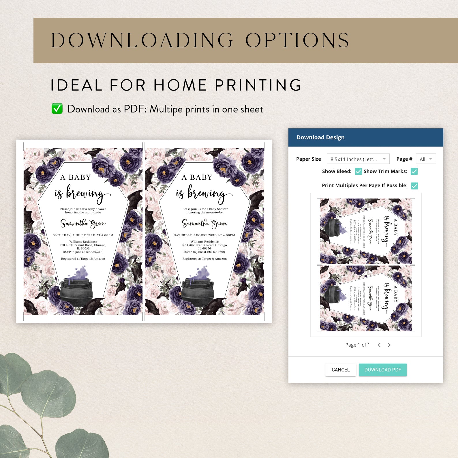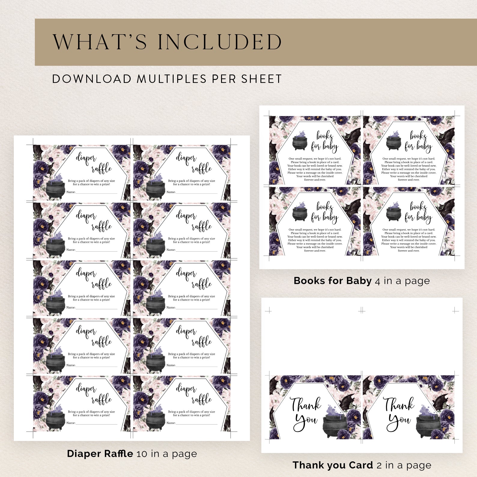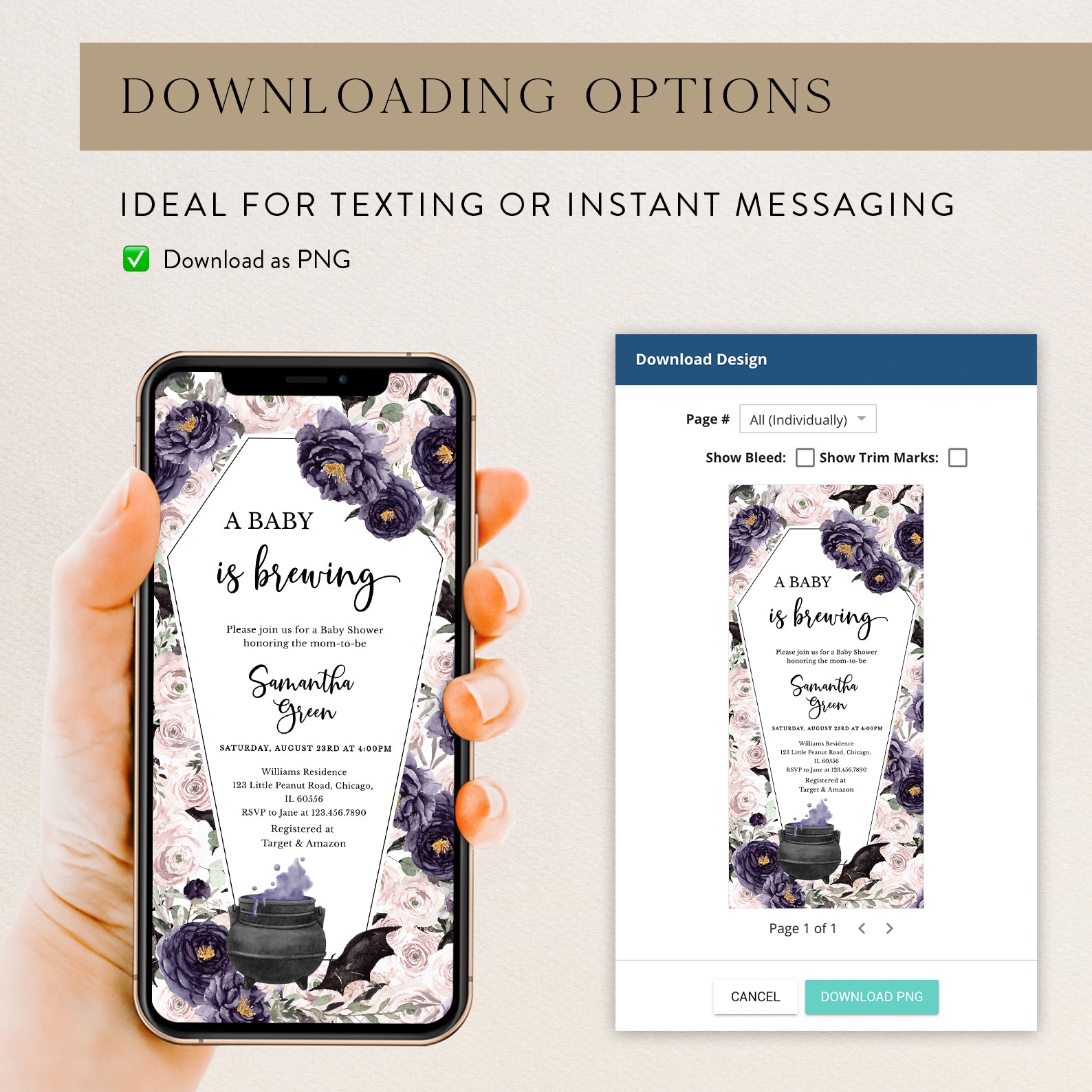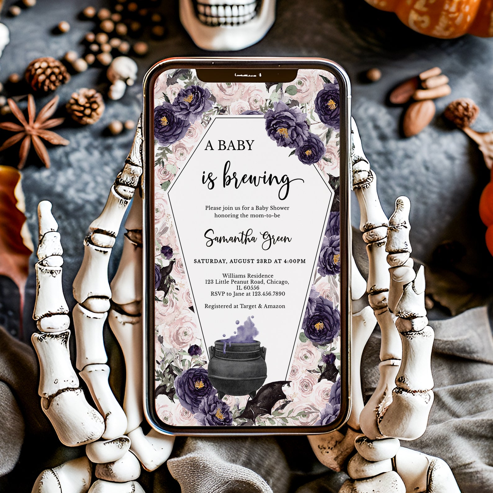 Celebrate your little one with our 'A Baby is Brewing' invitation bundle! This enchanting set includes: Invitation: Coffin-shaped design with a whimsical cauldron, playful bats, and watercolor roses. Mobile Invitation: A digital version perfect for on-the-go sharing. Diaper Raffle Card: Match your theme and encourage guests to bring diapers for a chance to win. Books for Baby Card: Request cherished books with a coordinating card. Thank You Card: Show your appreciation with a matching thank you card. Set the tone for a magical baby shower with this charming bundle!
