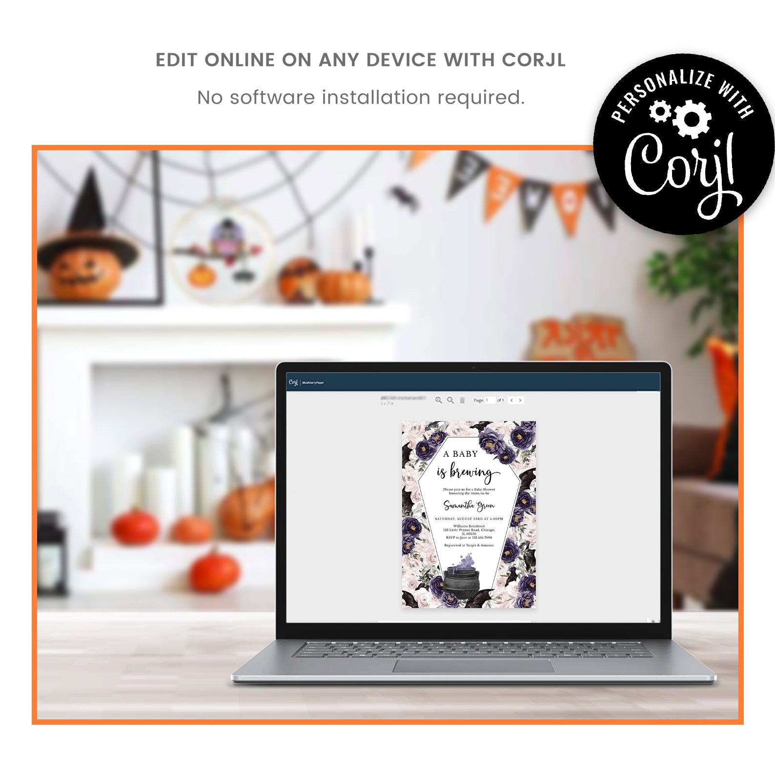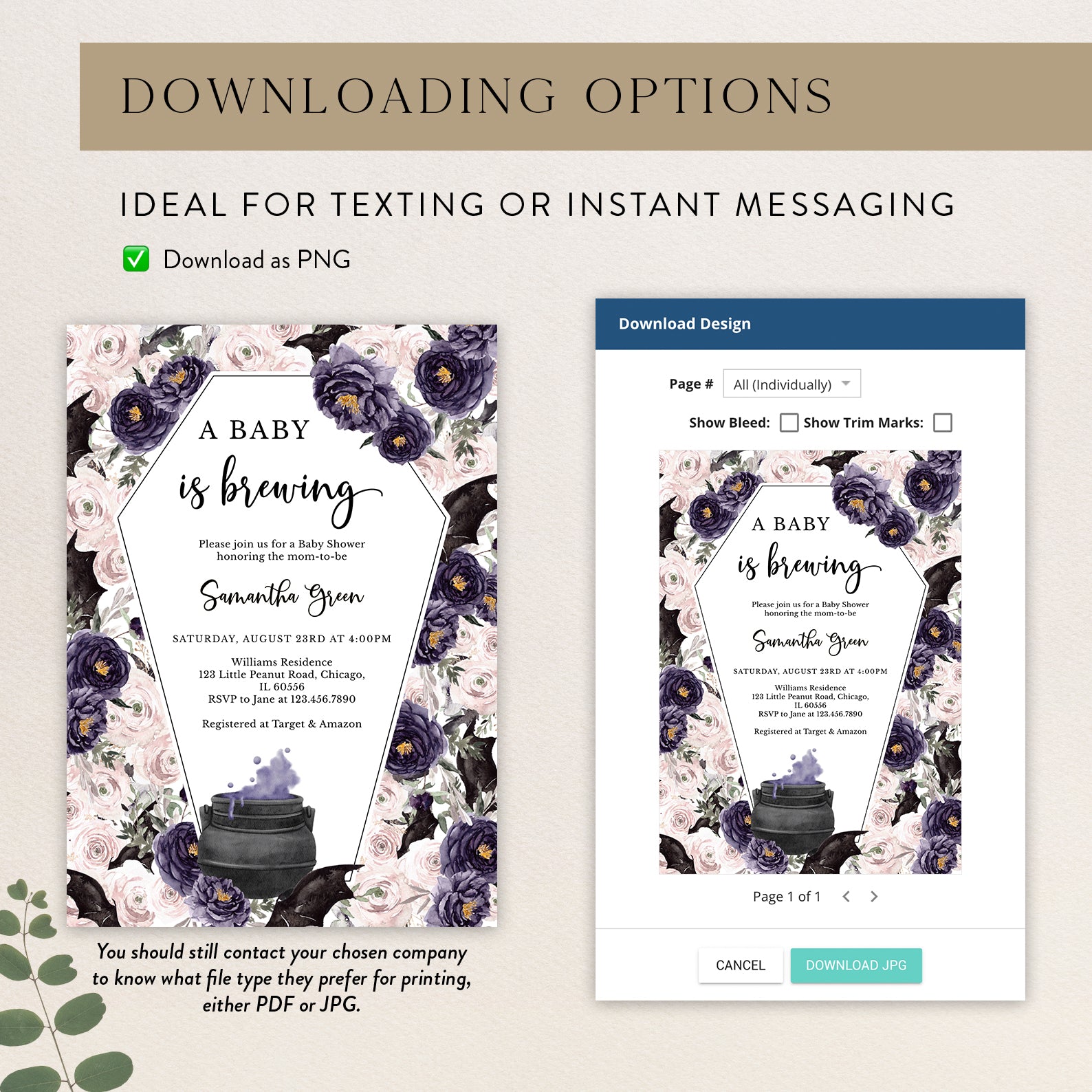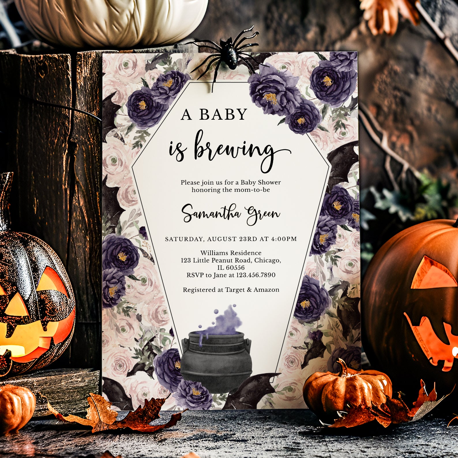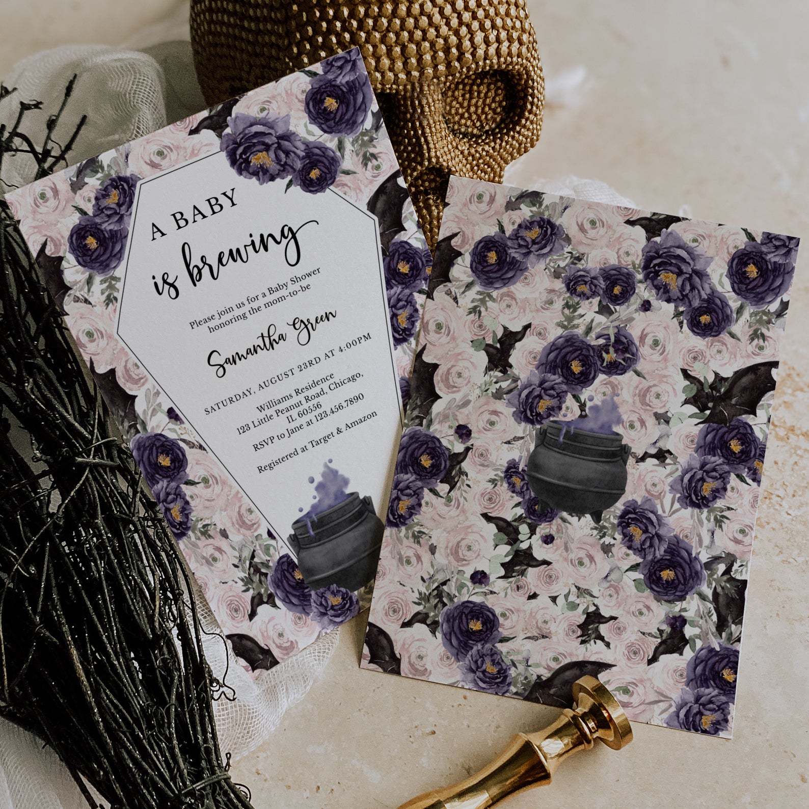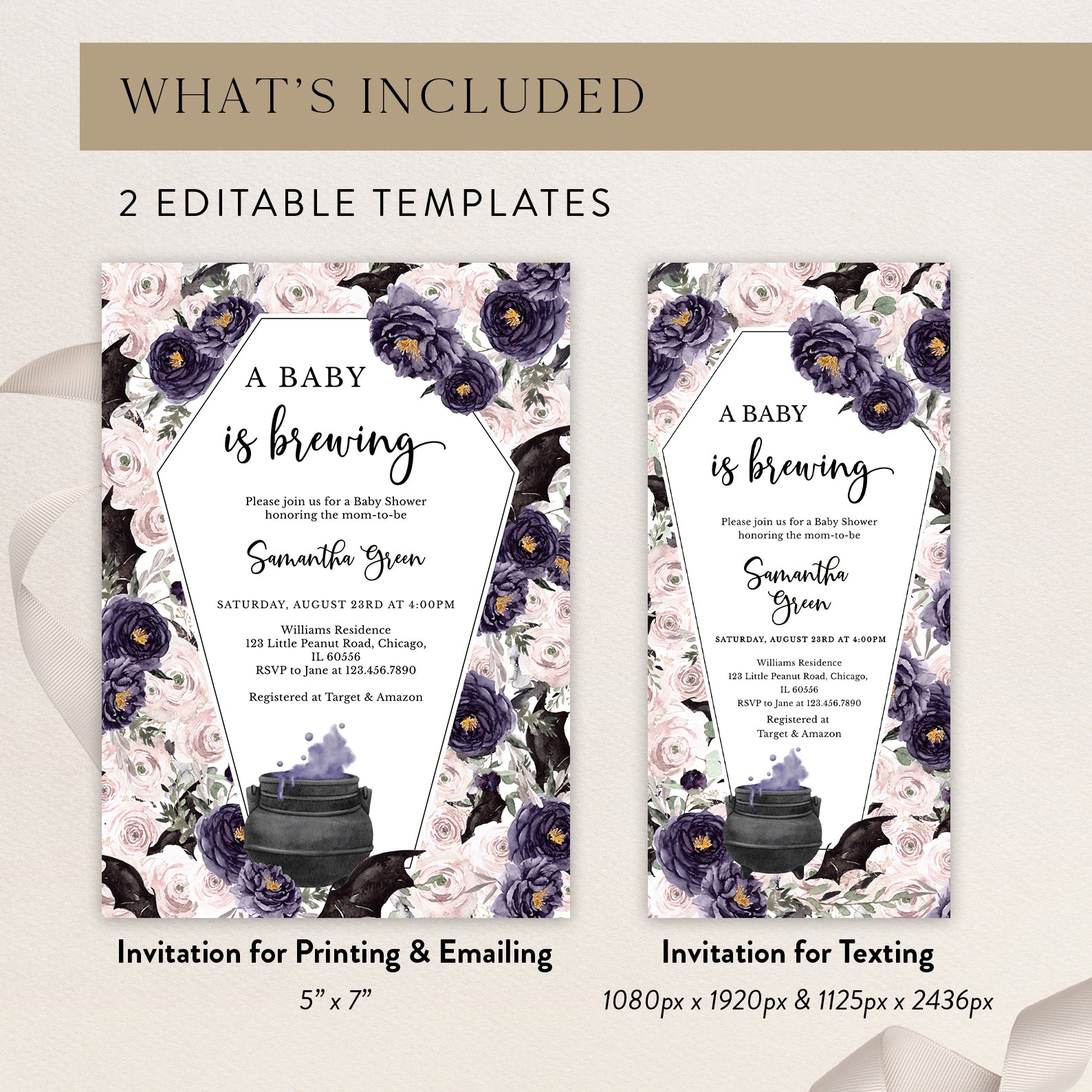 - Purchase this Coffin-Shaped Baby Invite Bundle: Cauldron, Bats & Rosewater Roses template
