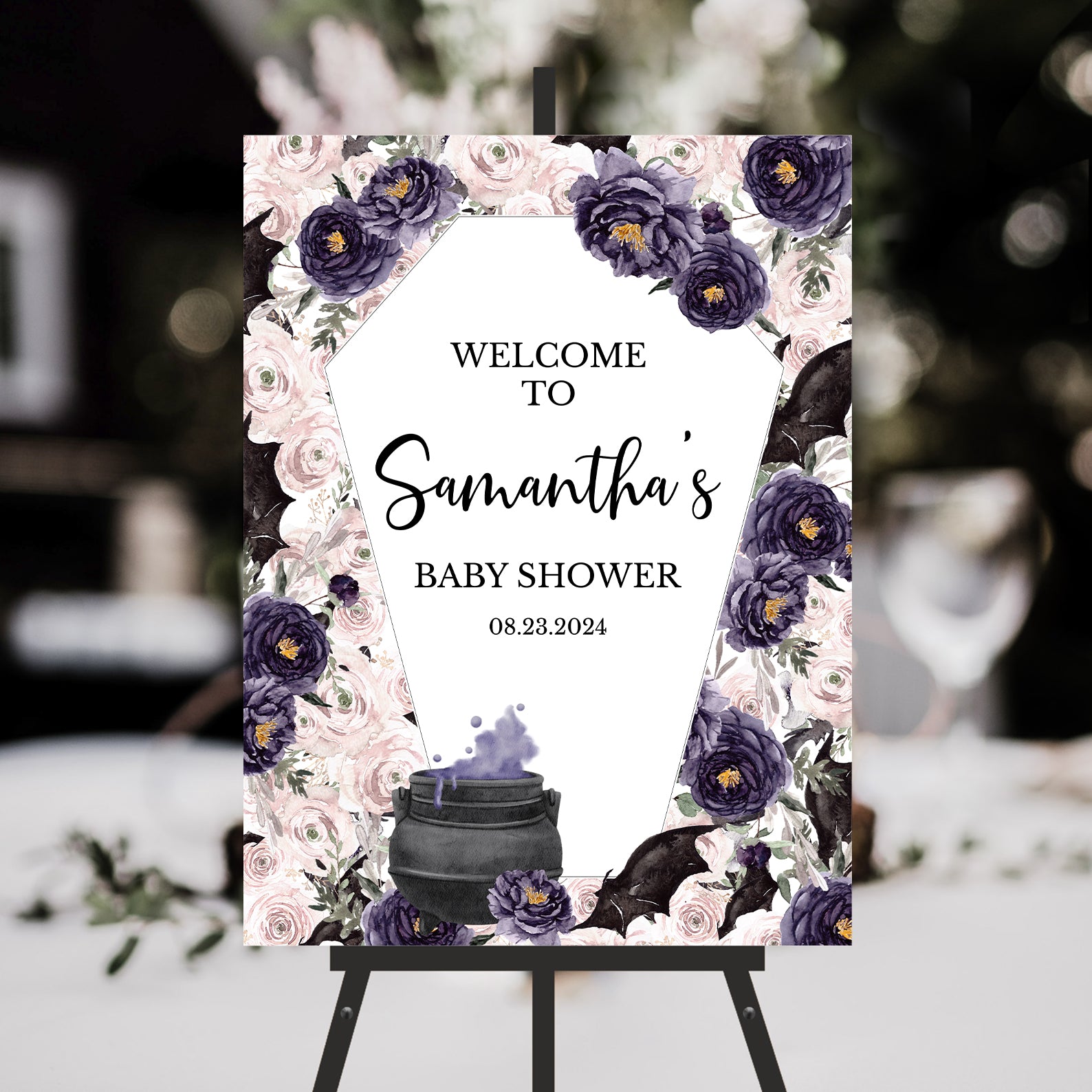 - Purchase this Coffin-Shaped Baby Welcome Sign: Cauldron, Bats & Rosewater Roses template