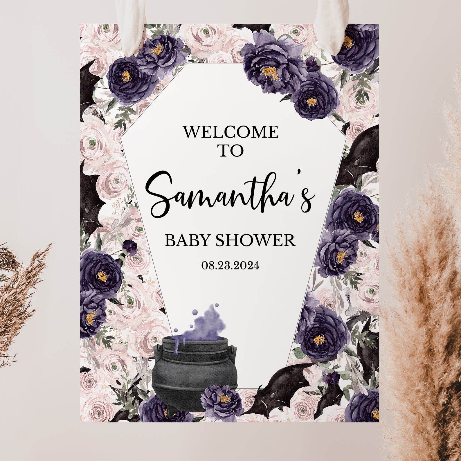 Welcome your guests with our enchanting 'A Baby is Brewing' welcome sign! This whimsical design features a unique coffin shape with a cauldron bubbling with vibrant purple potion and surrounded by playful bats. The backdrop is adorned with delicate watercolor roses in shades of purple and rosewater pink, creating a magical atmosphere perfect for your baby shower. Set the tone for a memorable celebration with this charming and spellbinding welcome sign!