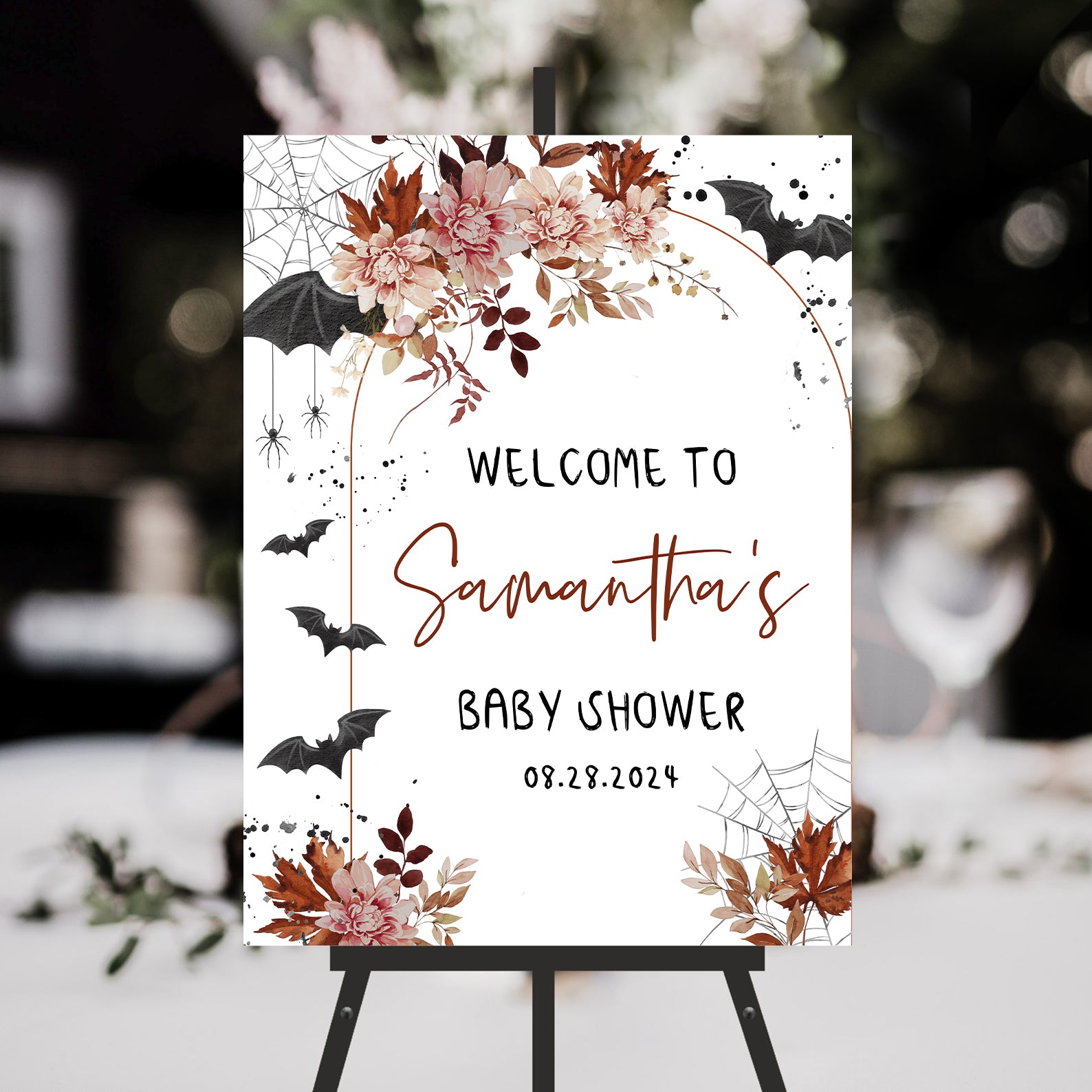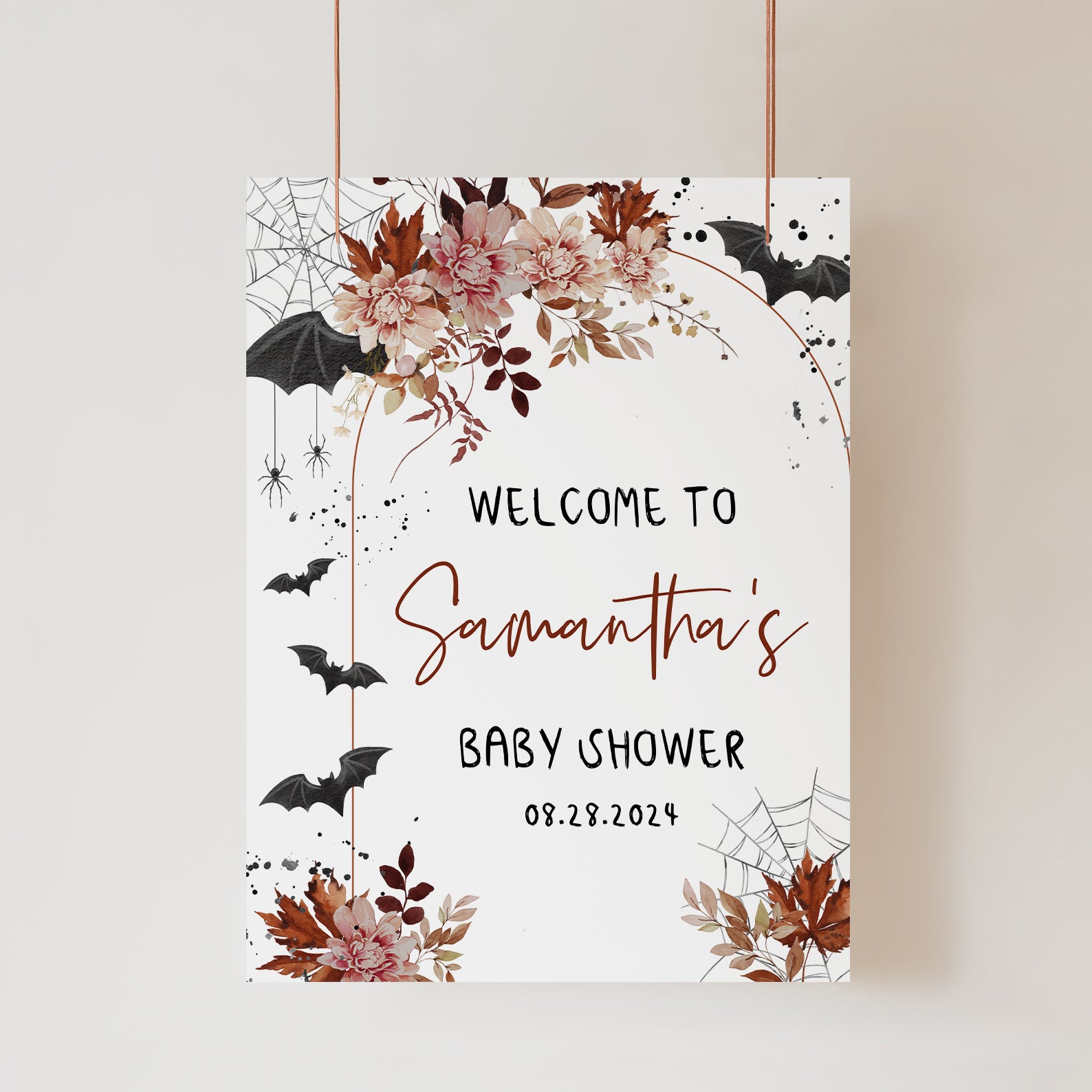 Greet Your Guests with a Spooky Welcome Sign for a Little Boo! Set the stage for a hauntingly delightful baby shower with our enchanting Halloween welcome sign! This eye-catching sign features: