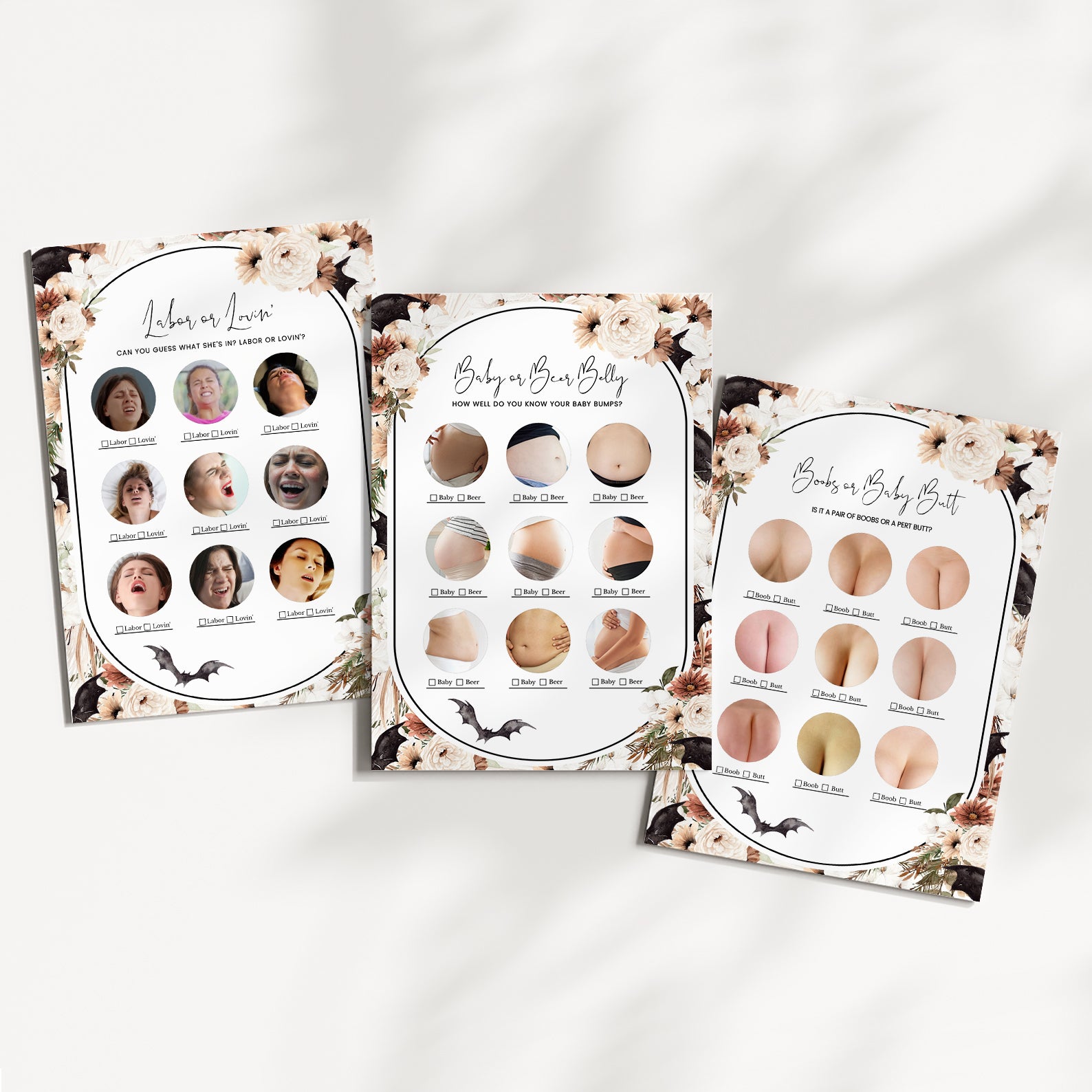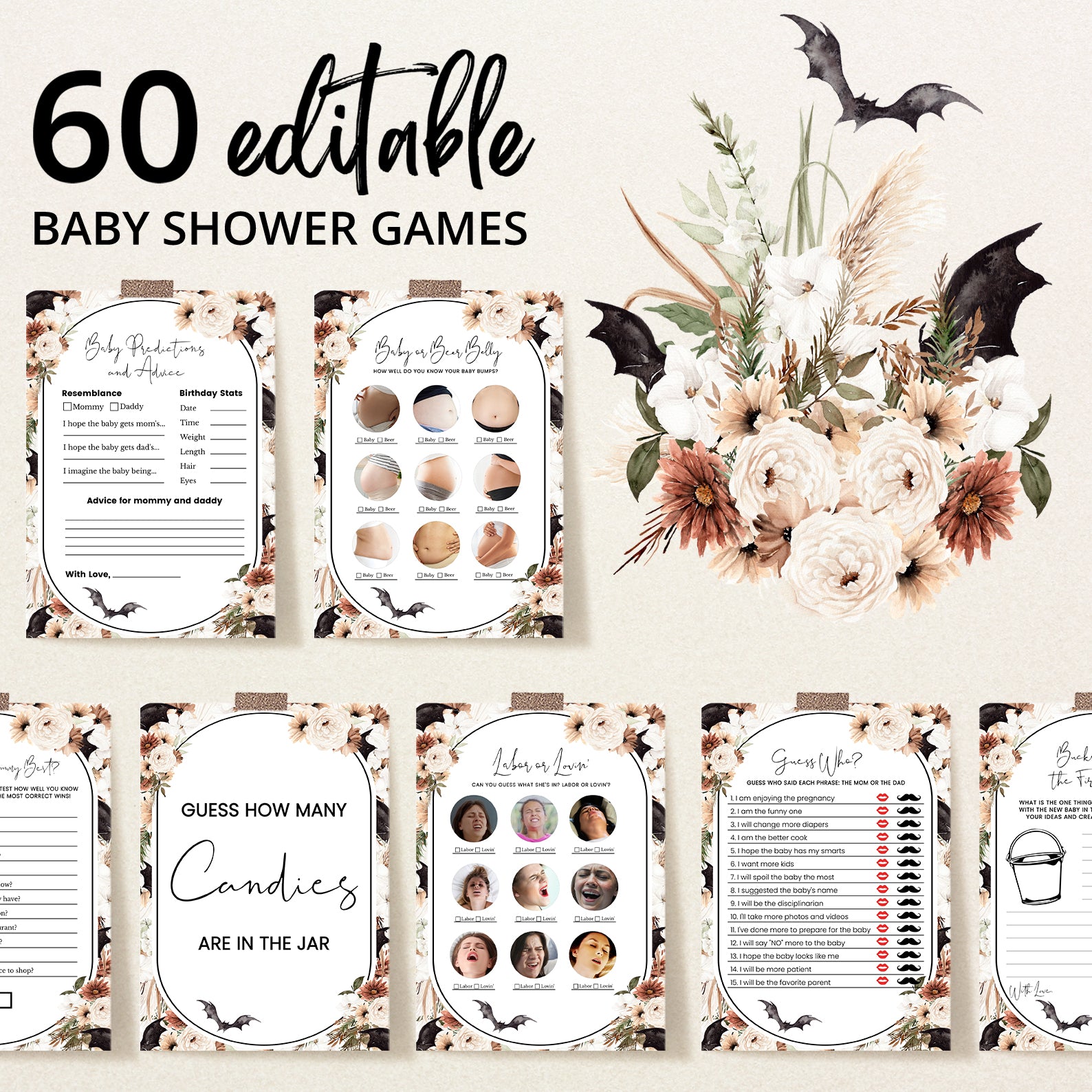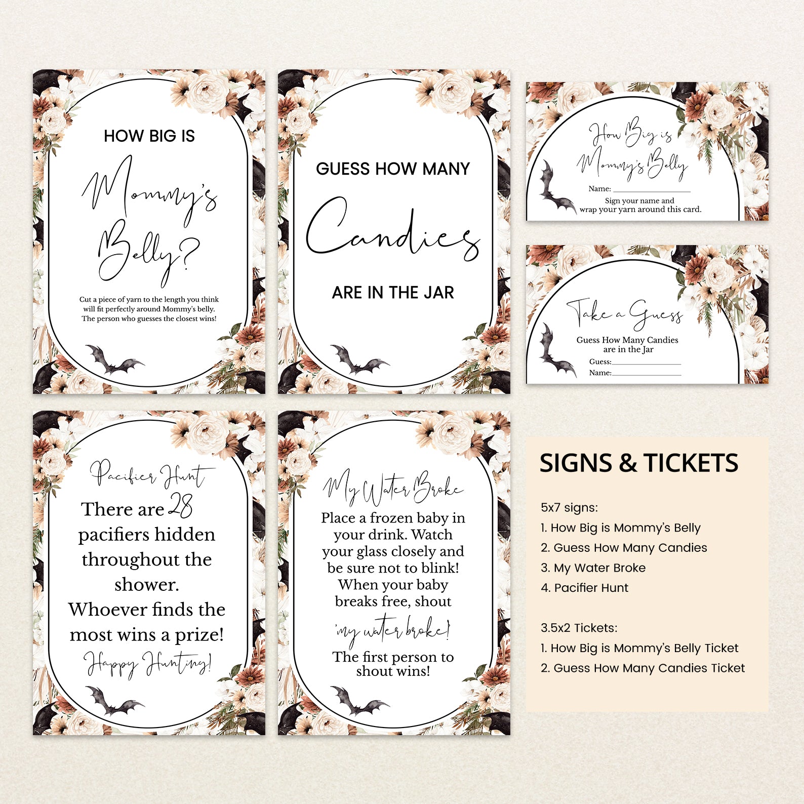 Prepare for a fang-tastic celebration with our “Batty Over Baby” Halloween Game Bundle! This collection of editable games is designed to bring a mix of whimsical and spooky fun to your baby shower. Featuring a charming array of bats and watercolor flowers, each game adds a touch of enchanting allure to your festivities. Customizable to fit your event’s theme, these games are perfect for creating an engaging and festive atmosphere for your guests. Let the playful bat designs and magical floral elements set the stage for a Halloween celebration that’s both delightful and memorable. Get ready to celebrate your little pumpkin with a bundle that’s sure to bring smiles and spooky cheer!