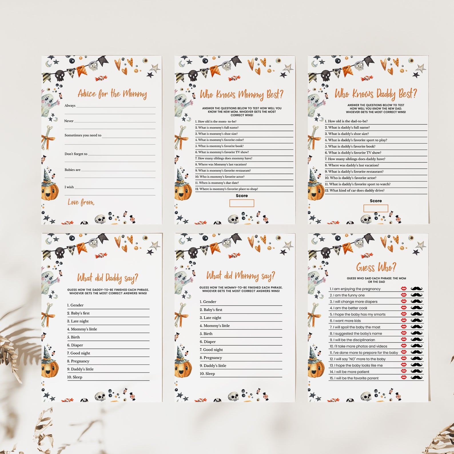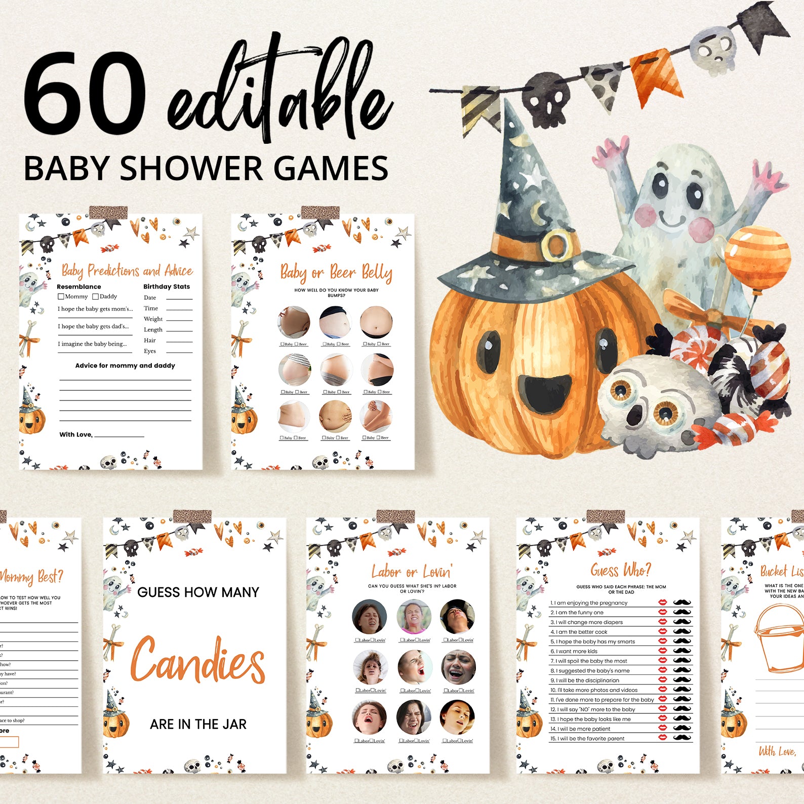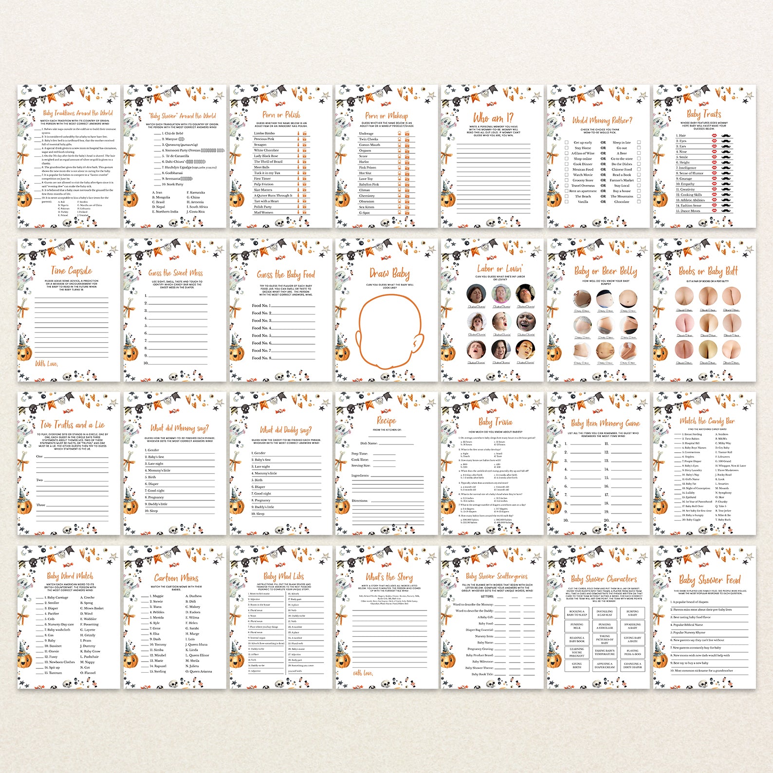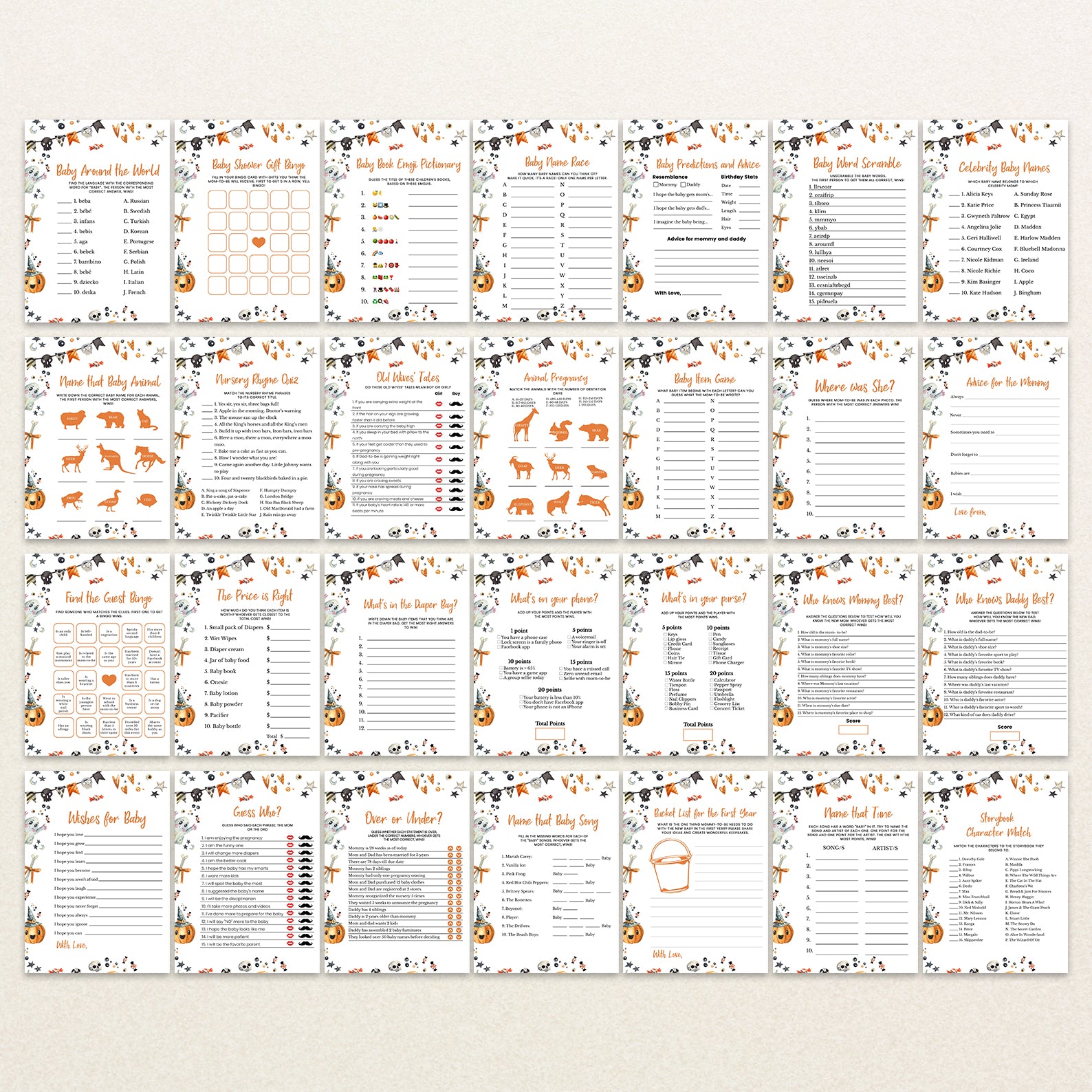 Get ready for a fang-tastic baby shower with our Halloween game bundle! Featuring editable games, this bundle is perfect for adding a festive twist to your celebration. Each game comes with charming Halloween designs and spooky details that will keep your guests entertained and engaged. Customize to fit your theme and create a memorable, fun-filled event to welcome your little one. Perfect for a boo-tiful celebration!