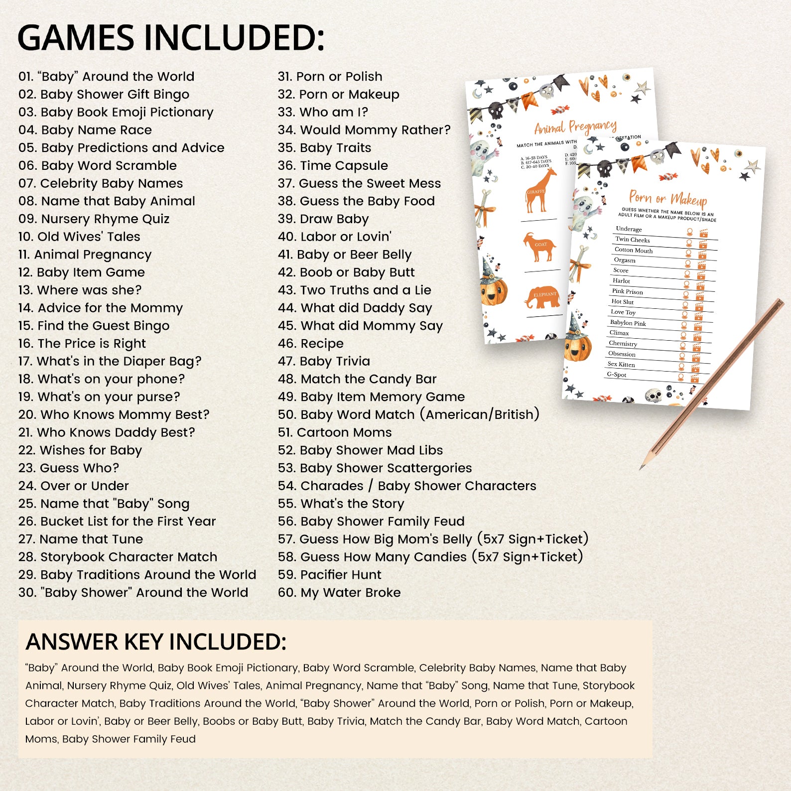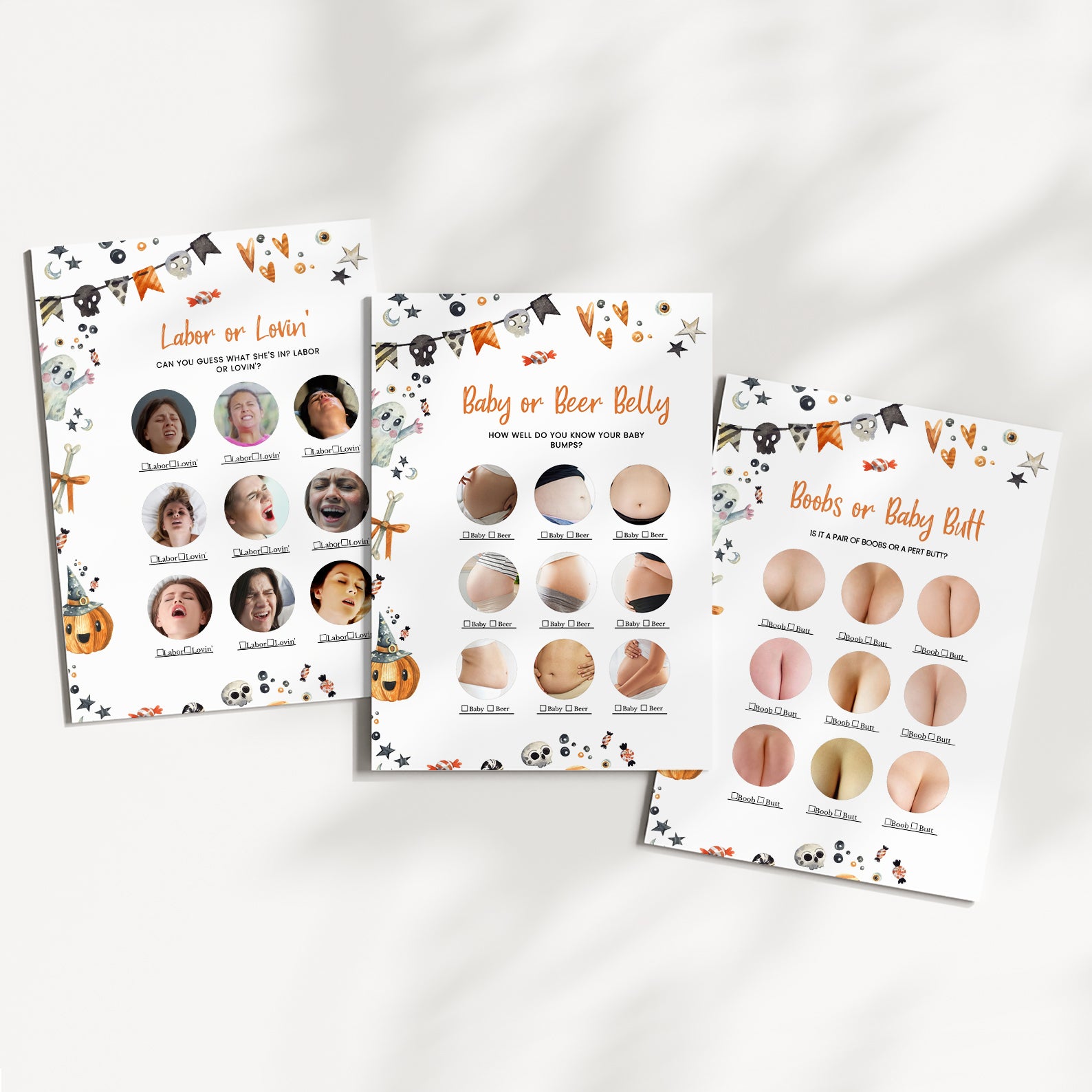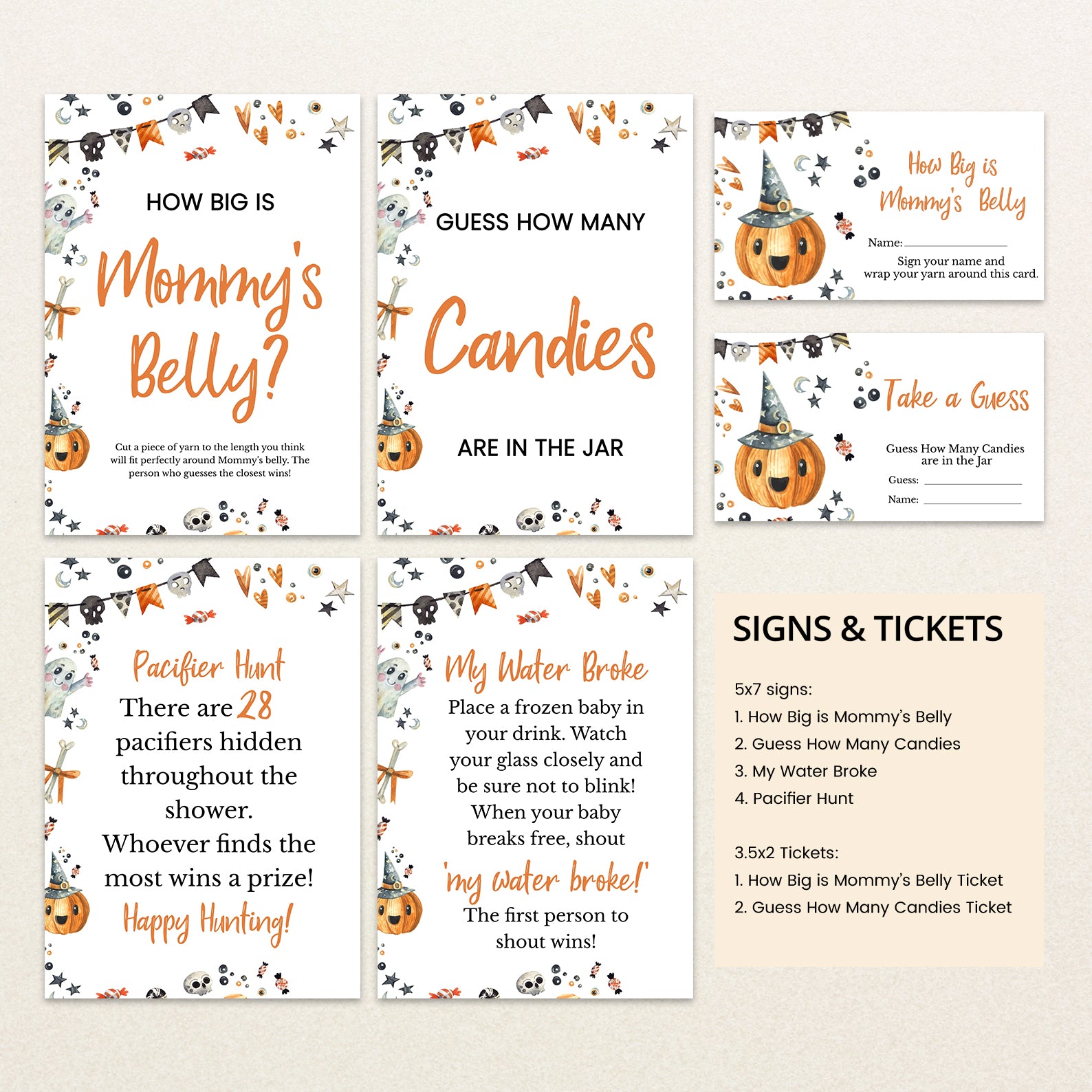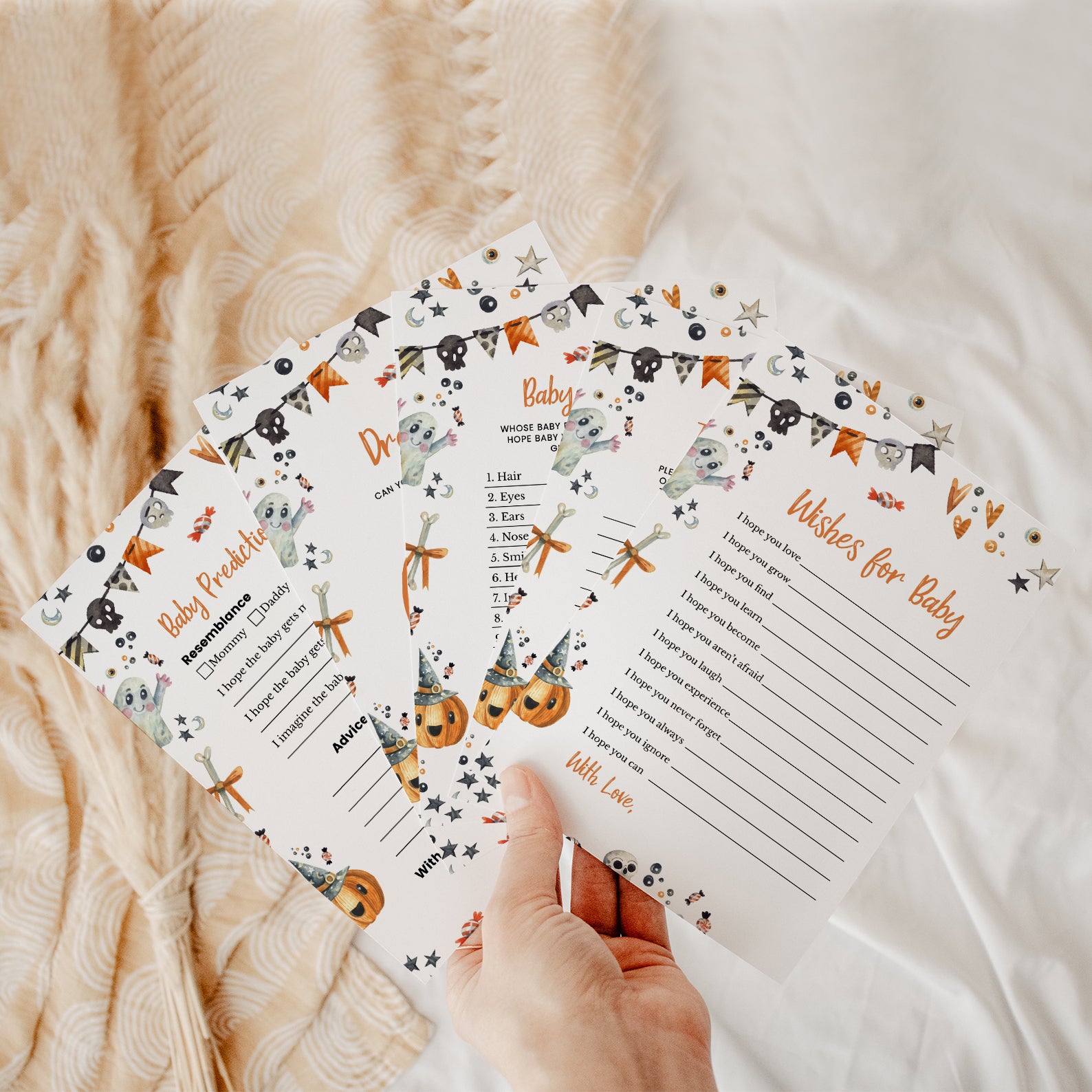 Get ready for a fang-tastic baby shower with our Halloween game bundle! Featuring editable games, this bundle is perfect for adding a festive twist to your celebration. Each game comes with charming Halloween designs and spooky details that will keep your guests entertained and engaged. Customize to fit your theme and create a memorable, fun-filled event to welcome your little one. Perfect for a boo-tiful celebration!