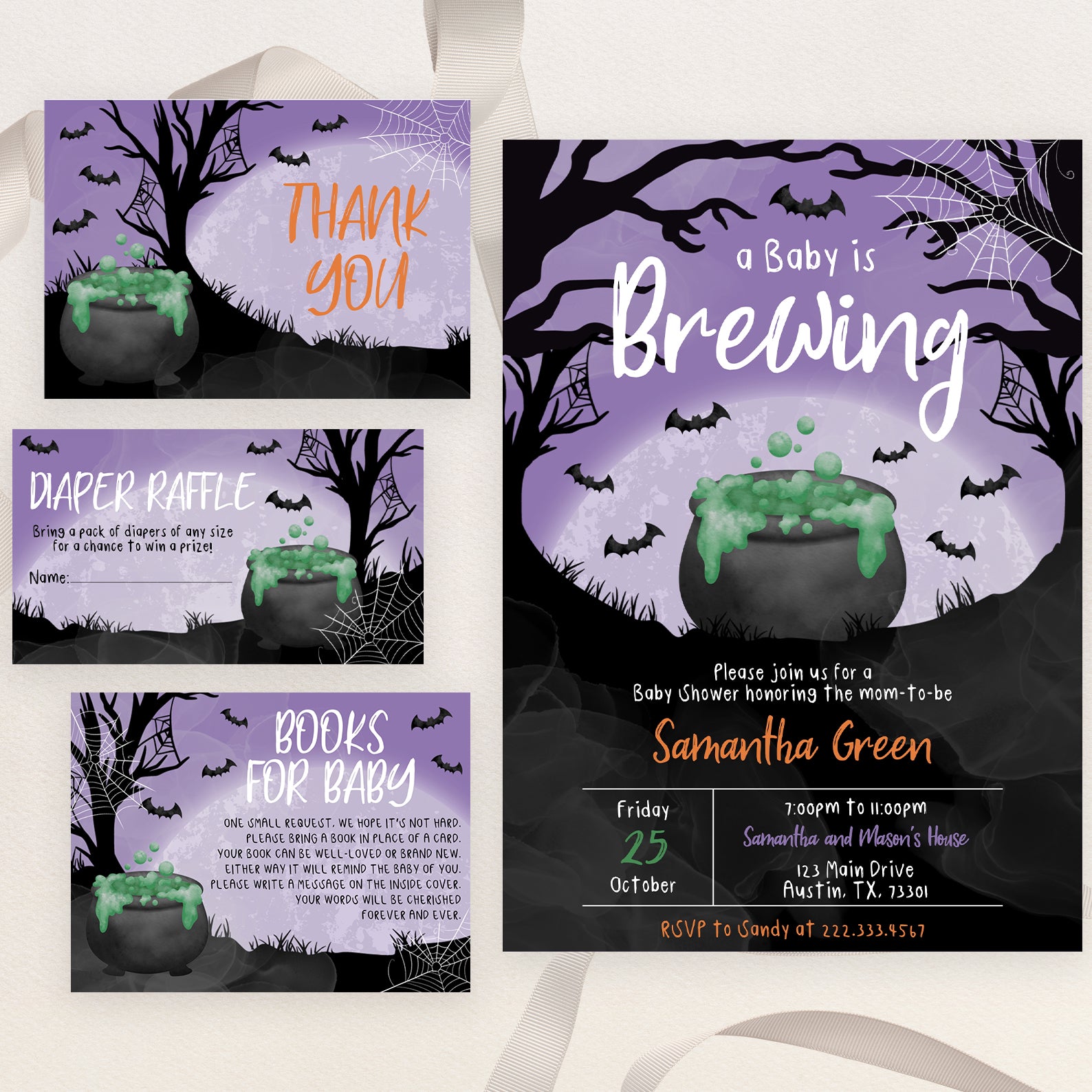 Invitation: Our main invitation features a mystical purple night sky, complete with eerie tree branches, a creepy spider web, fluttering bats, and a glowing moon. It’s the perfect blend of spooky and adorable, setting the tone for a memorable Halloween-themed baby shower.