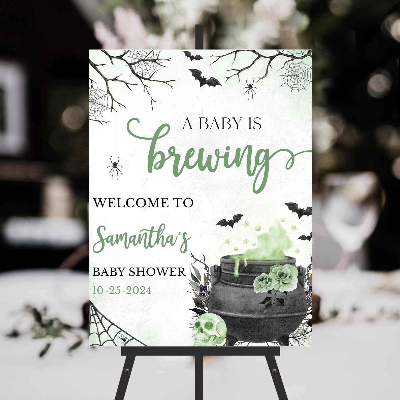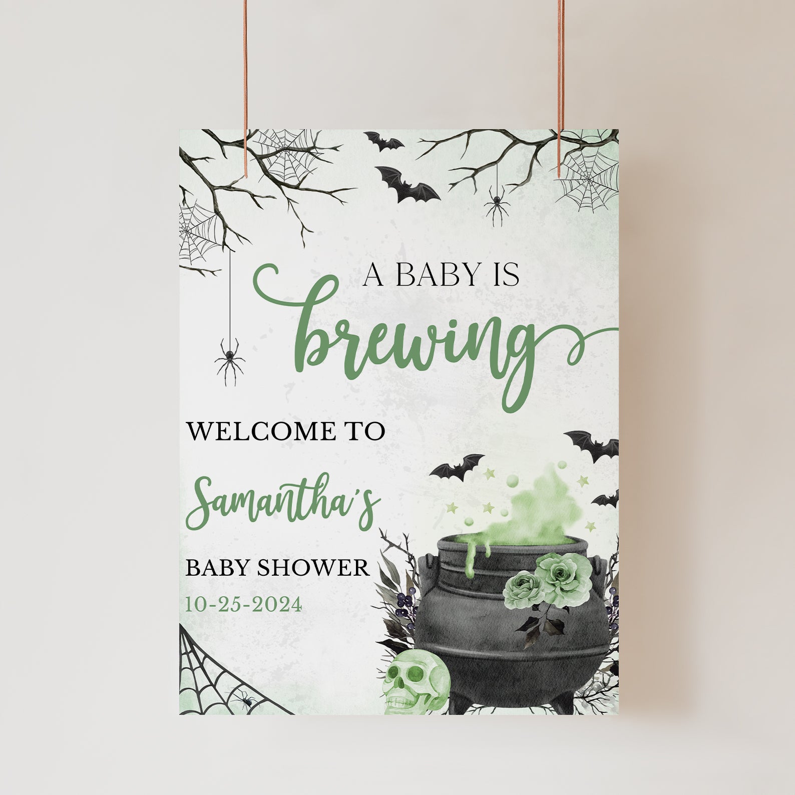 1. Purchase this Digital Welcome Sign: 'A Baby is Brewing' with Spooky Cauldron Fun template