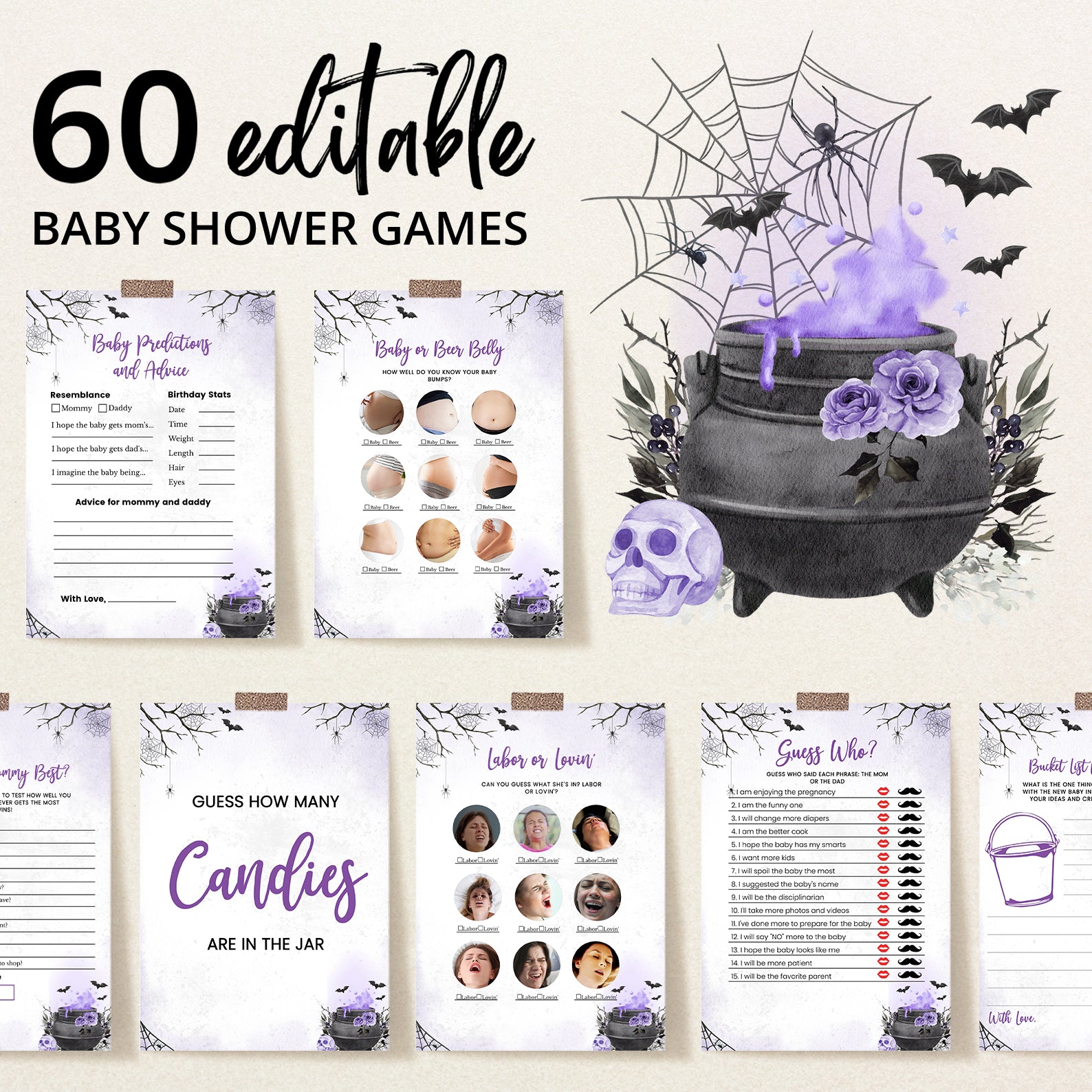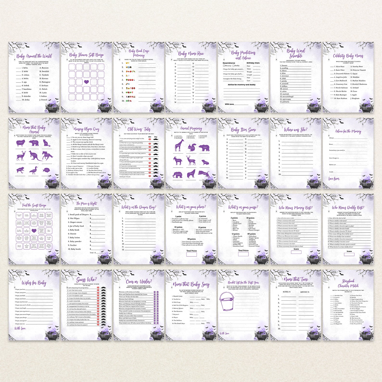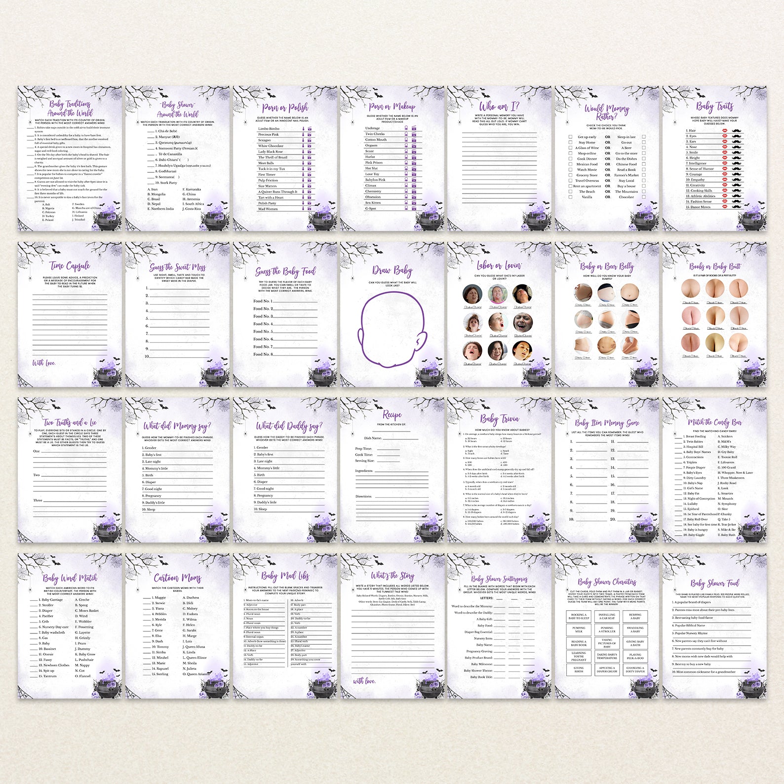 - Purchase this Purple Digital Game Bundle: 'A Baby is Brewing' with Spooky Cauldron Fun template