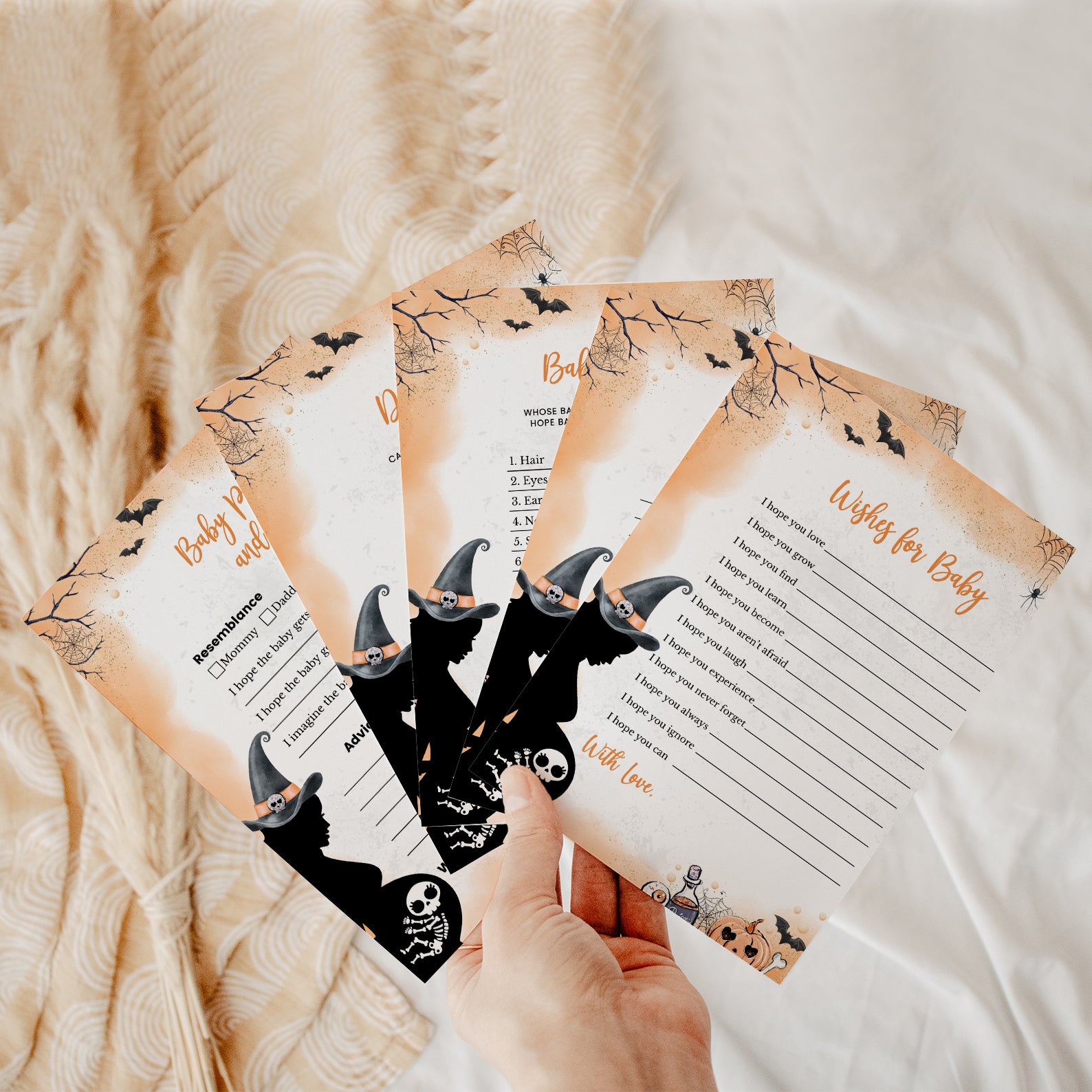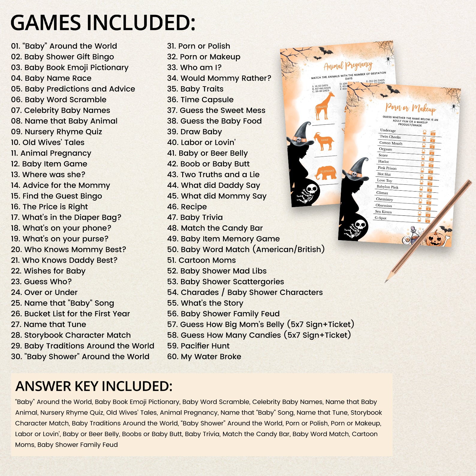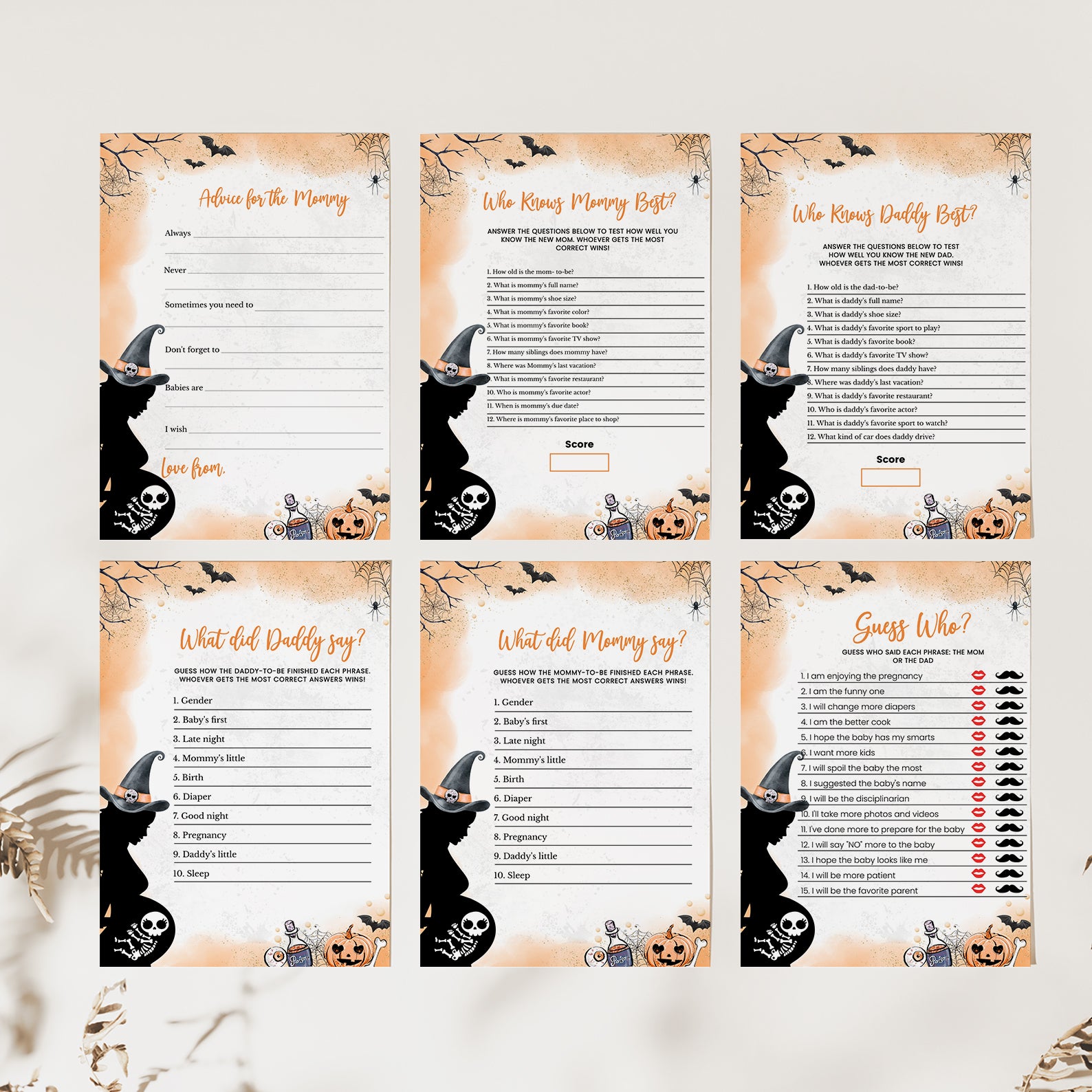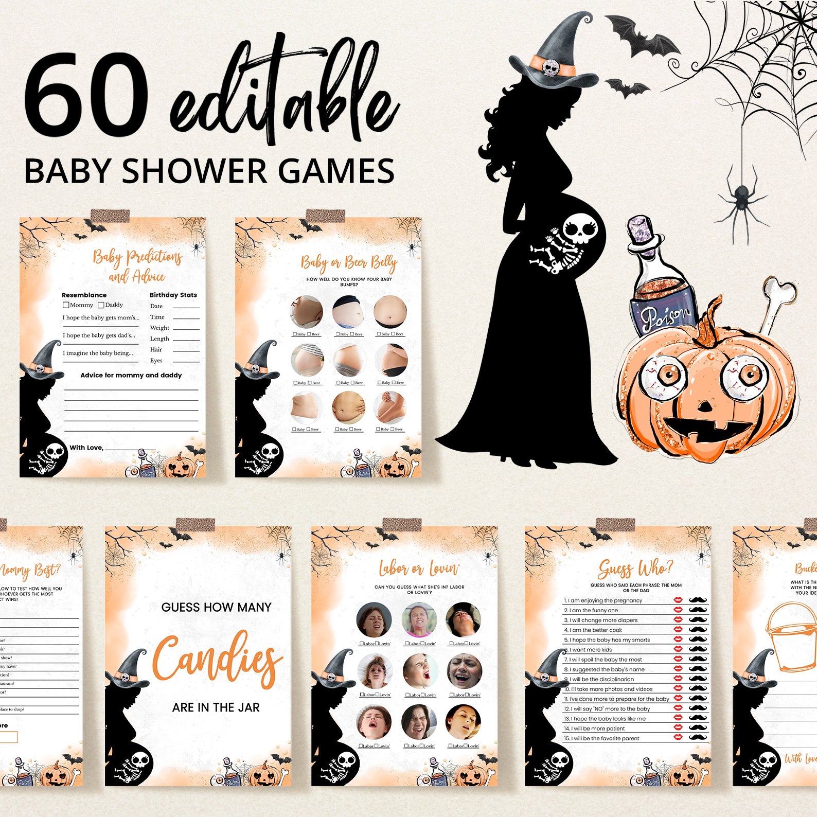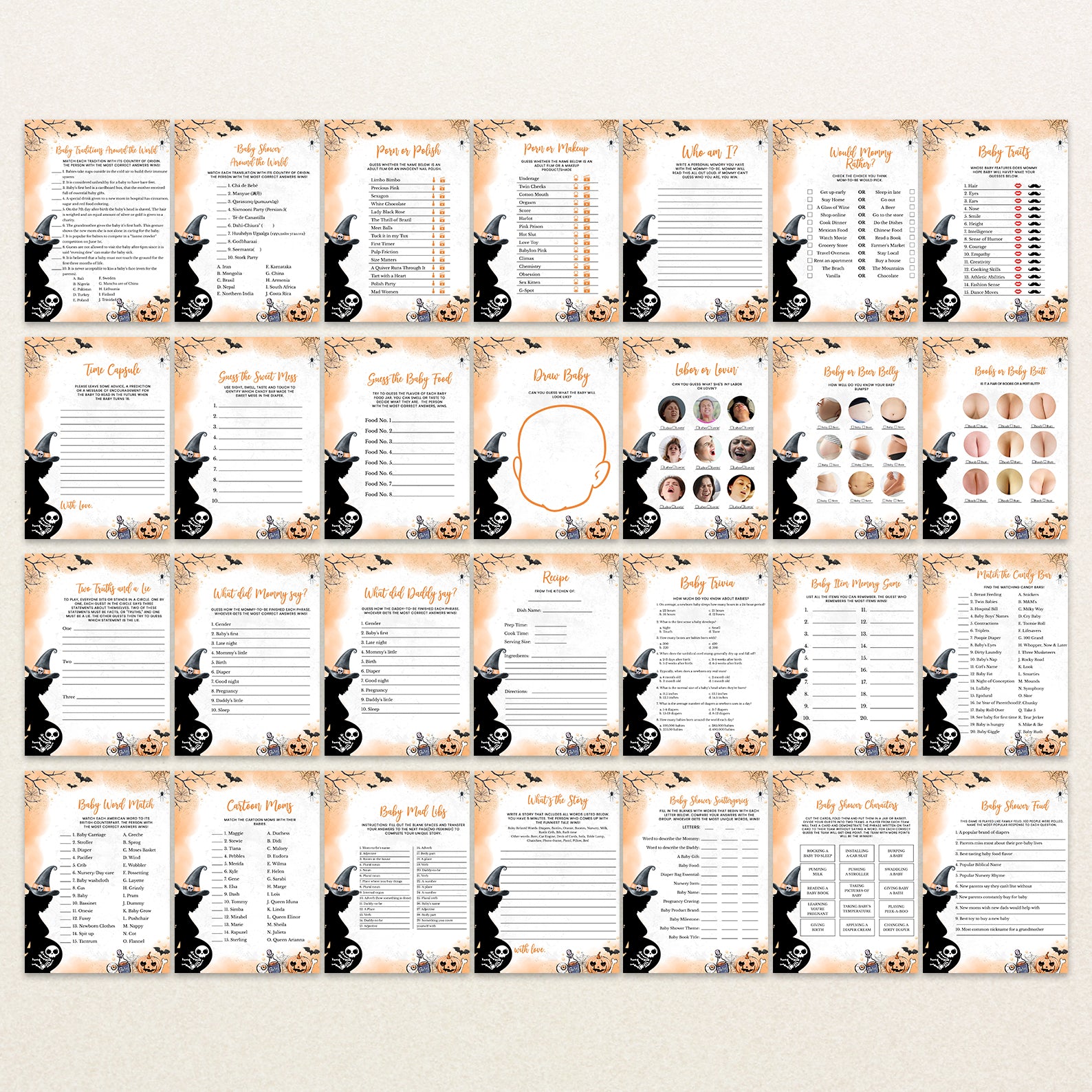Bring excitement to your baby shower with our "Baby is Brewing" game bundle! This set includes editable games featuring Halloween elements like pumpkins, bats, potions, and cauldrons. Choose from themes and colors such as green, purple, blue, and orange. Perfect for any Halloween-themed baby shower, these games showcase a pregnant witch wearing a spooky hat with a baby skeleton on her tummy. Keep your guests entertained and make your event unforgettable with this delightful game bundle.