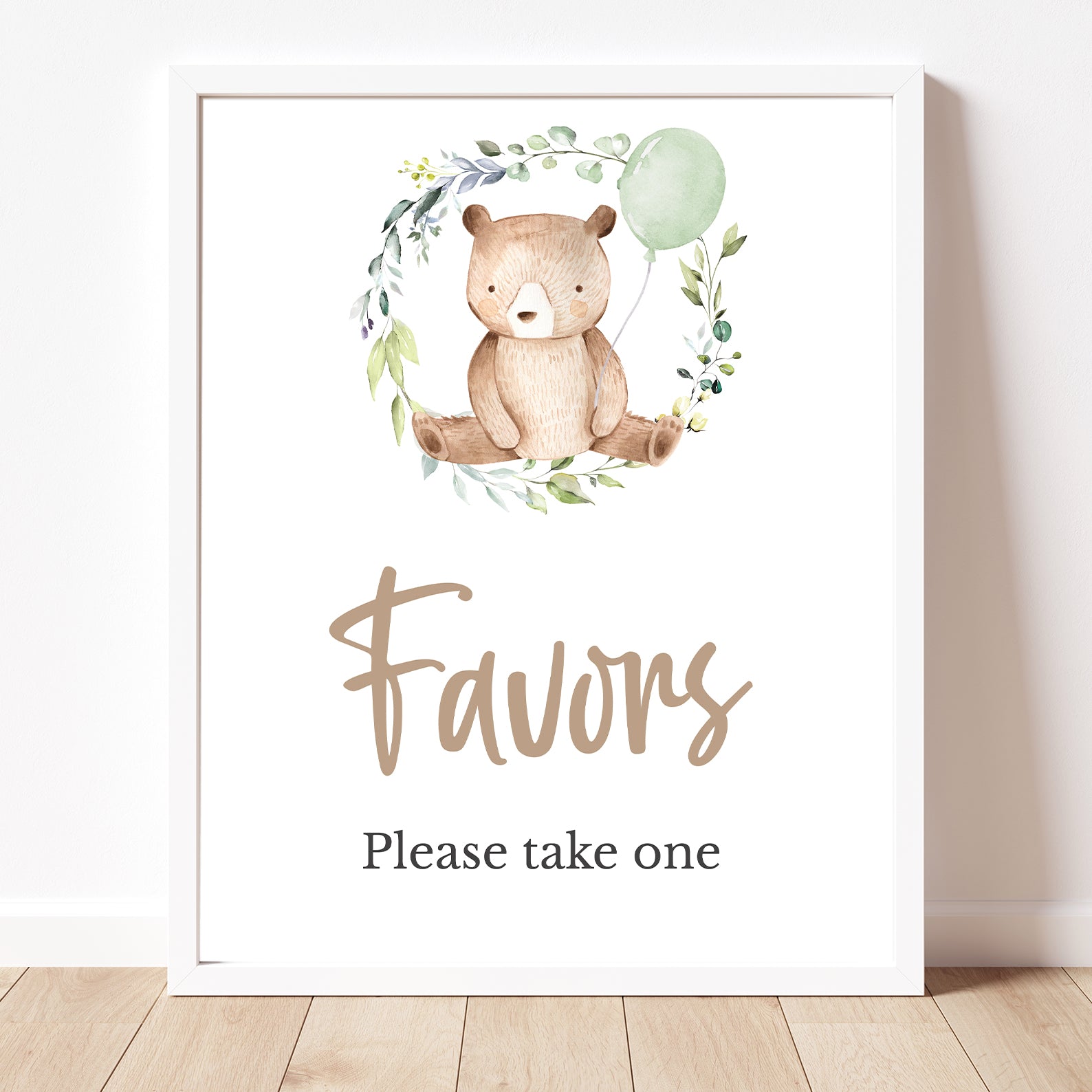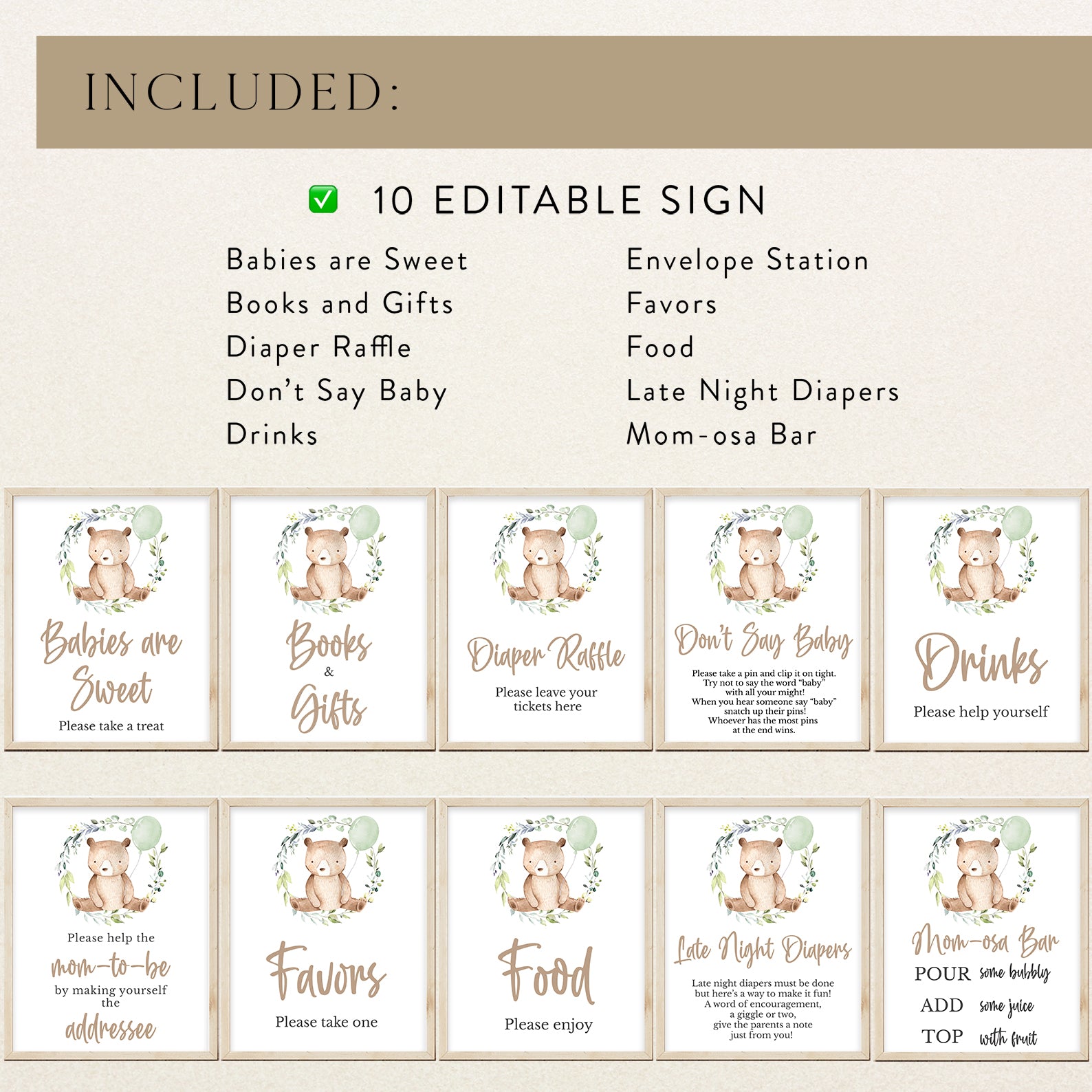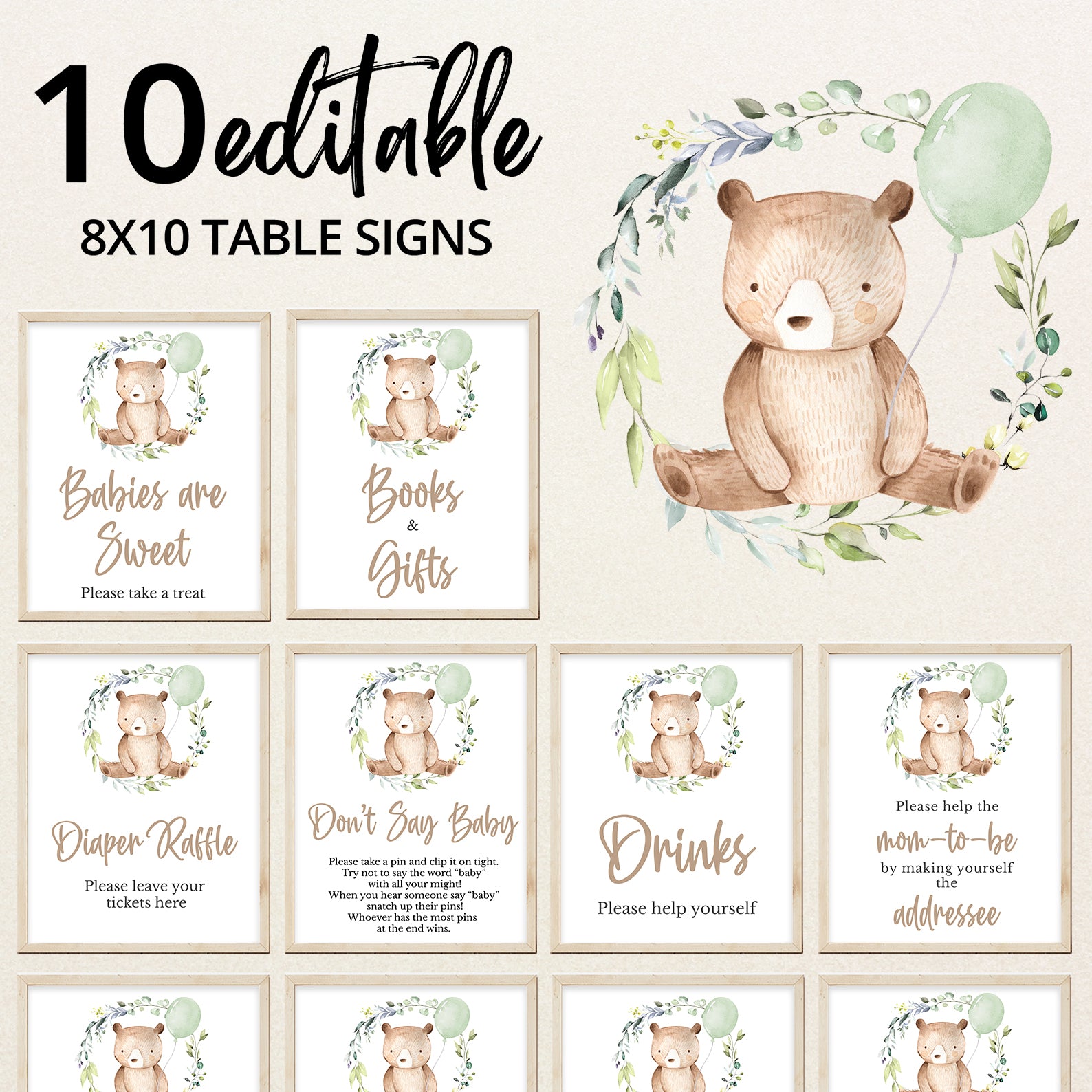 Add a touch of charm to your baby shower with our minimalist "We Can Bearly Wait" table sign set! Featuring an adorable bear holding a green balloon, surrounded by a delicate circle of lush green leaves, these signs bring a fresh and inviting feel to your celebration. This editable set includes ten matching signs: Babies Are Sweet, Books and Gifts, Diaper Raffle, Don’t Say Baby, Drinks, Envelope Station, Favors, Food, Late Night Diapers, and Mom-osa Bar. Perfect for tying together your theme and helping guests feel part of the fun!