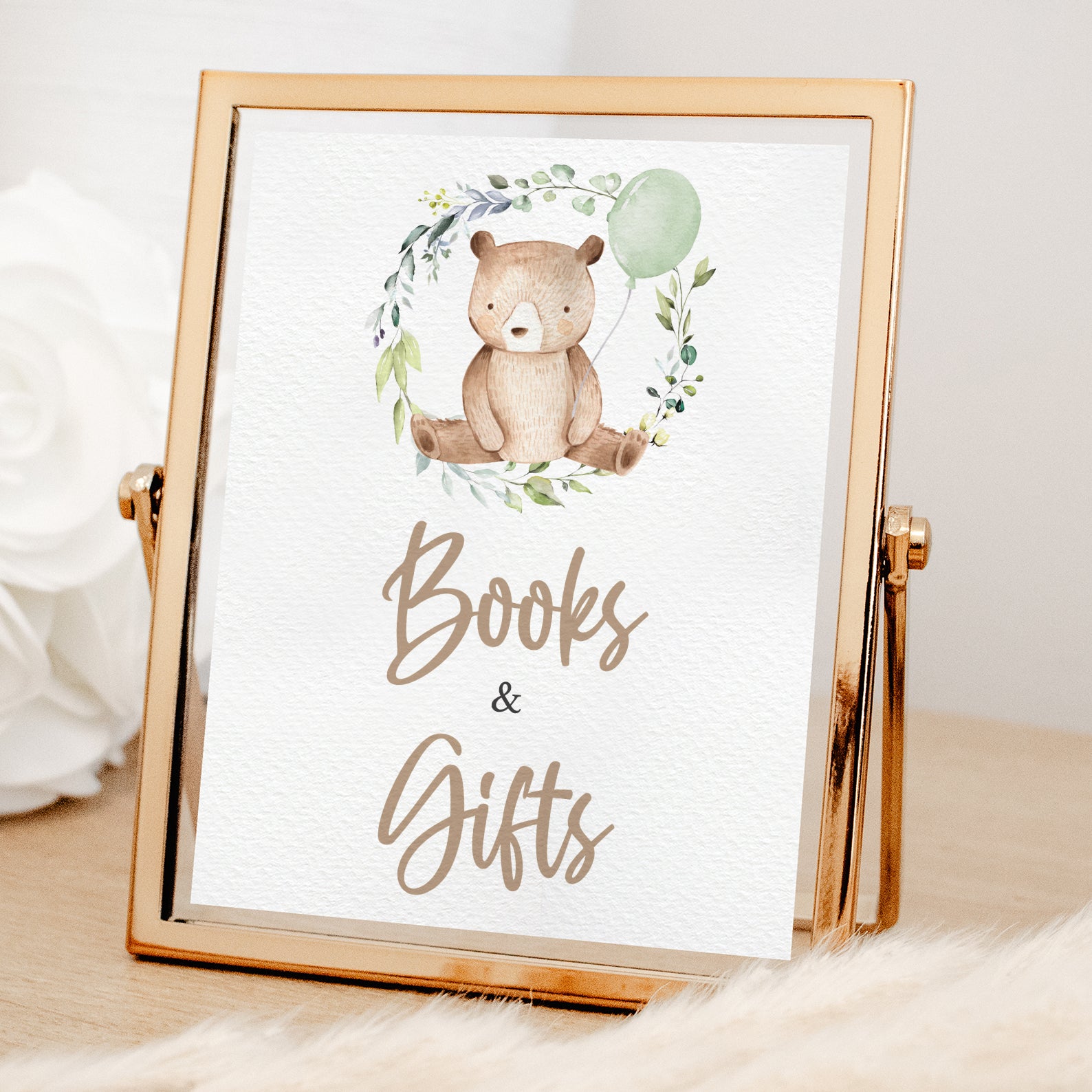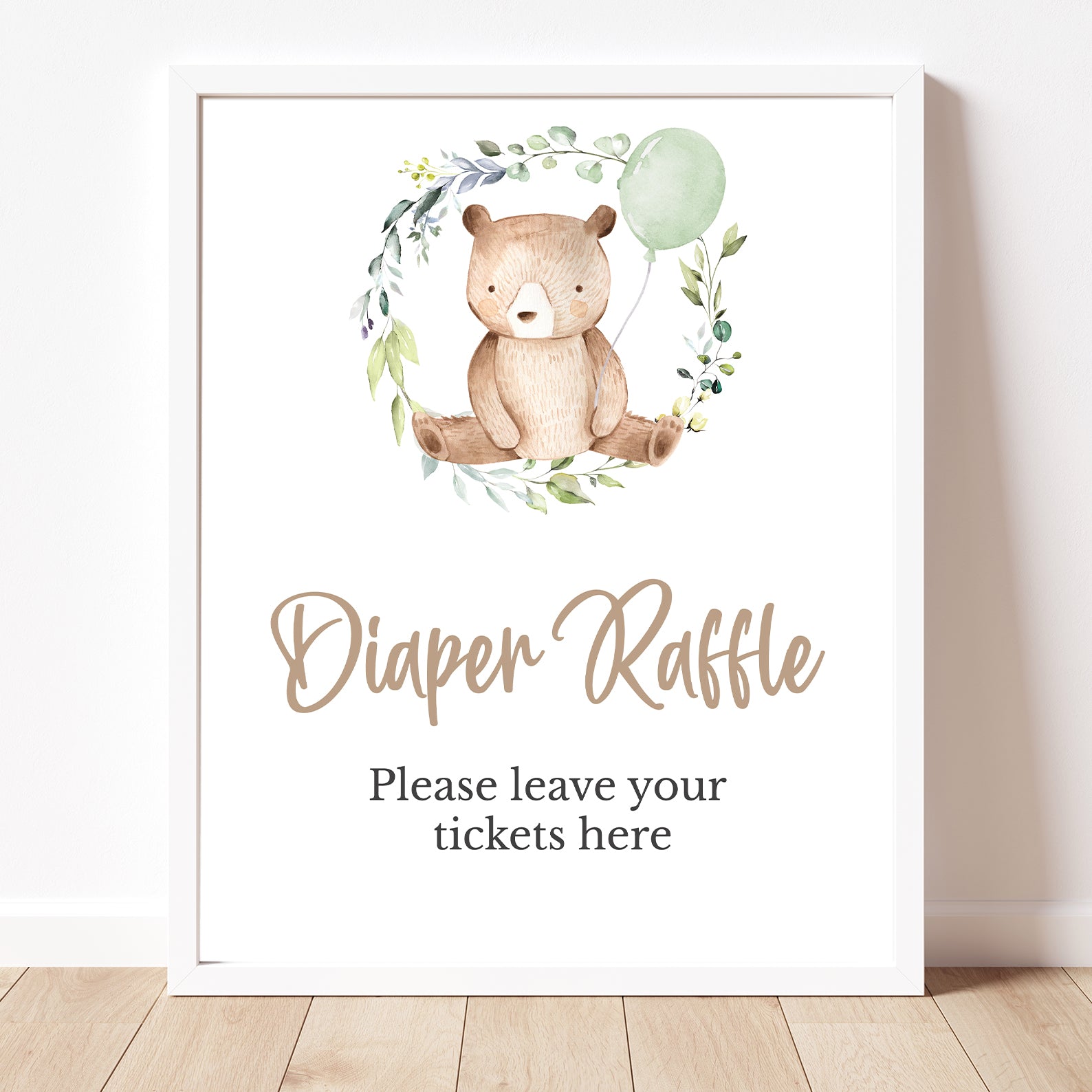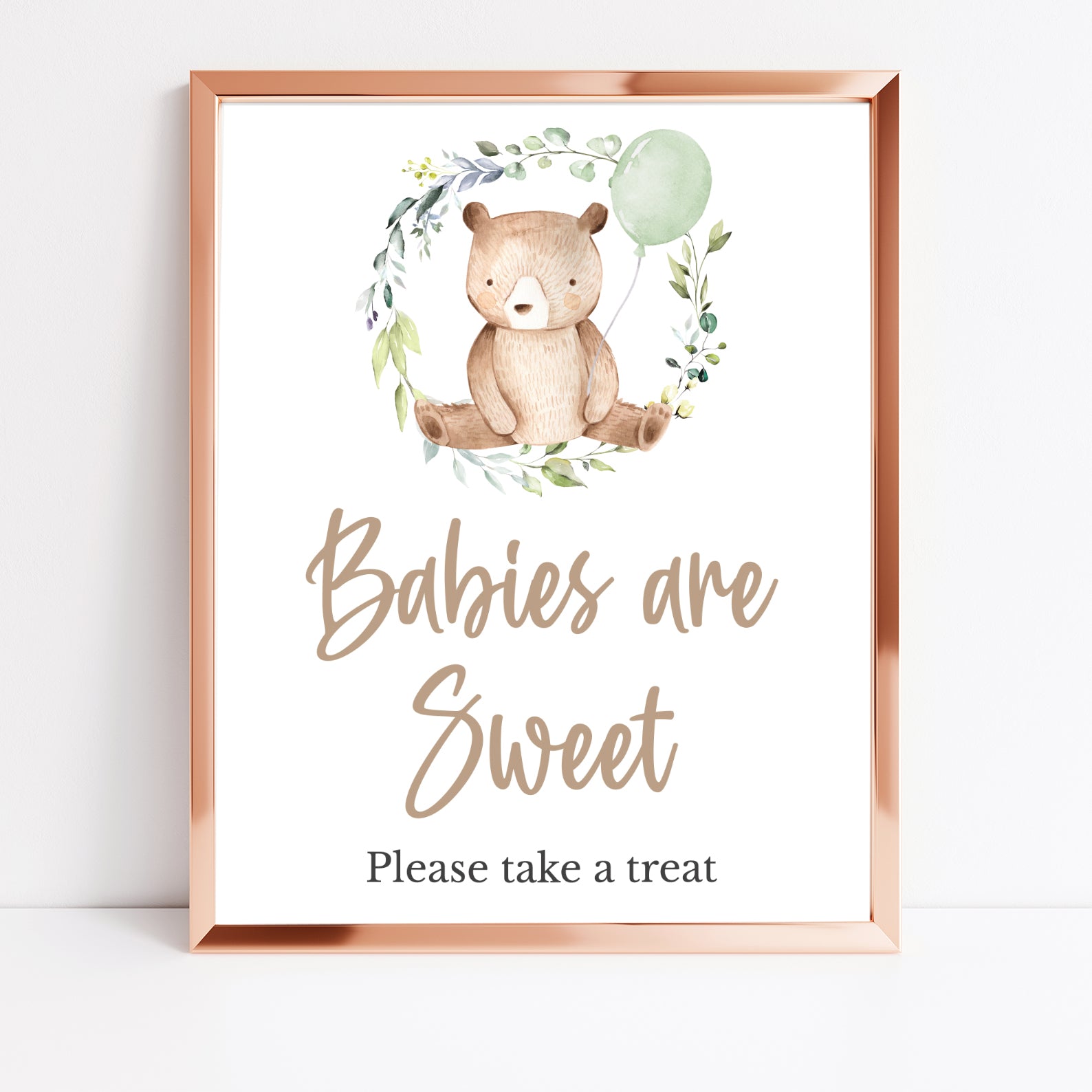 Minimalist Bear Baby Shower Digital Table Sign Green Leaf Circle