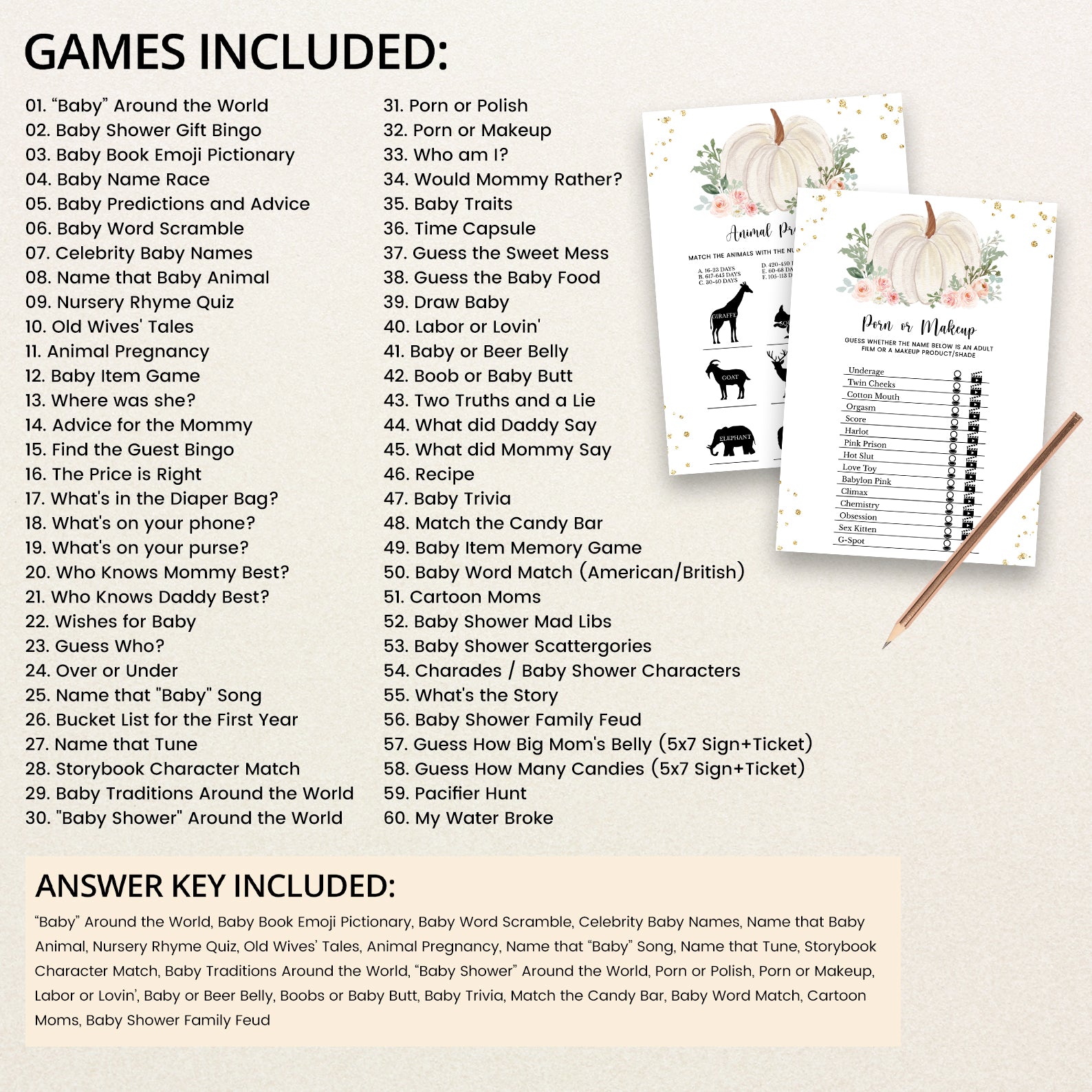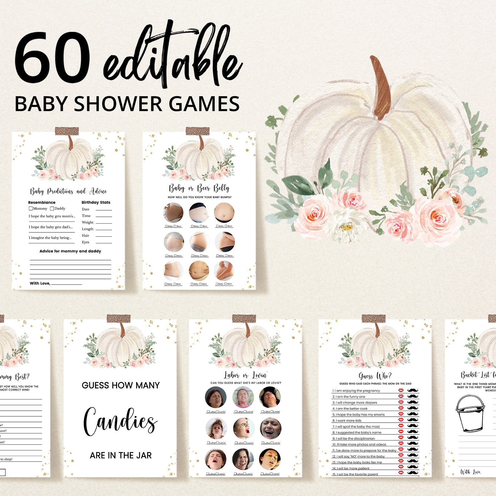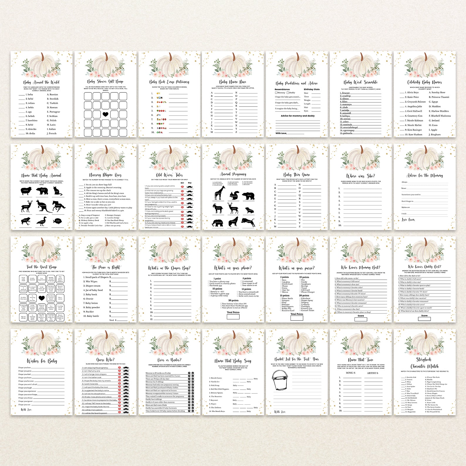 Add festive fun to your baby shower with 60 editable games featuring a soft fall palette of blush pink, gold sparkles, and watercolor florals. From classic favorites to laugh-out-loud games, each design showcases pumpkins, roses, and seasonal greenery. Whether you're hosting virtually or in person, this bundle provides endless entertainment while tying beautifully into your autumn-inspired party theme.