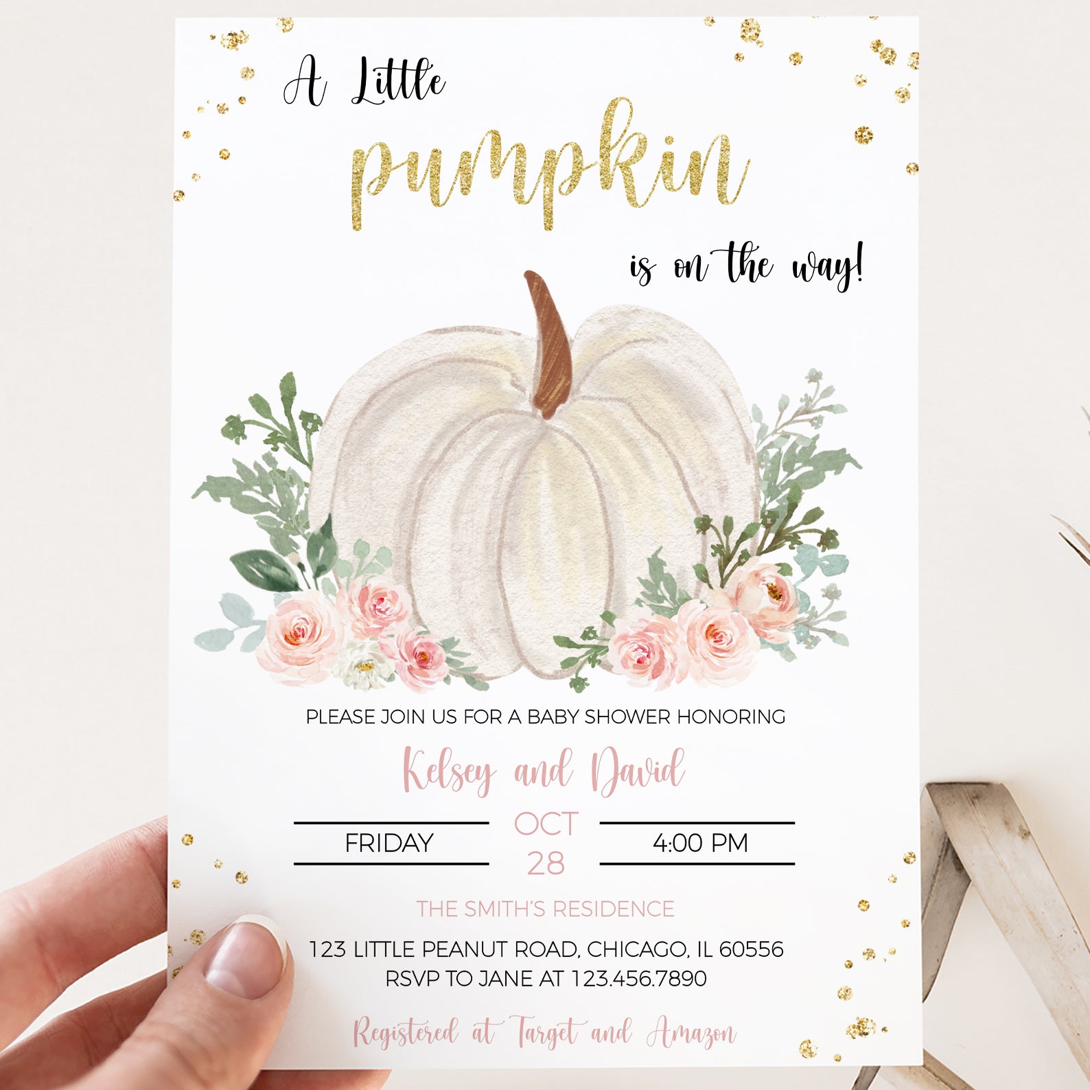 - Purchase this A Little Pumpkin Pink & Gold Fall Baby Shower Digital Invite template