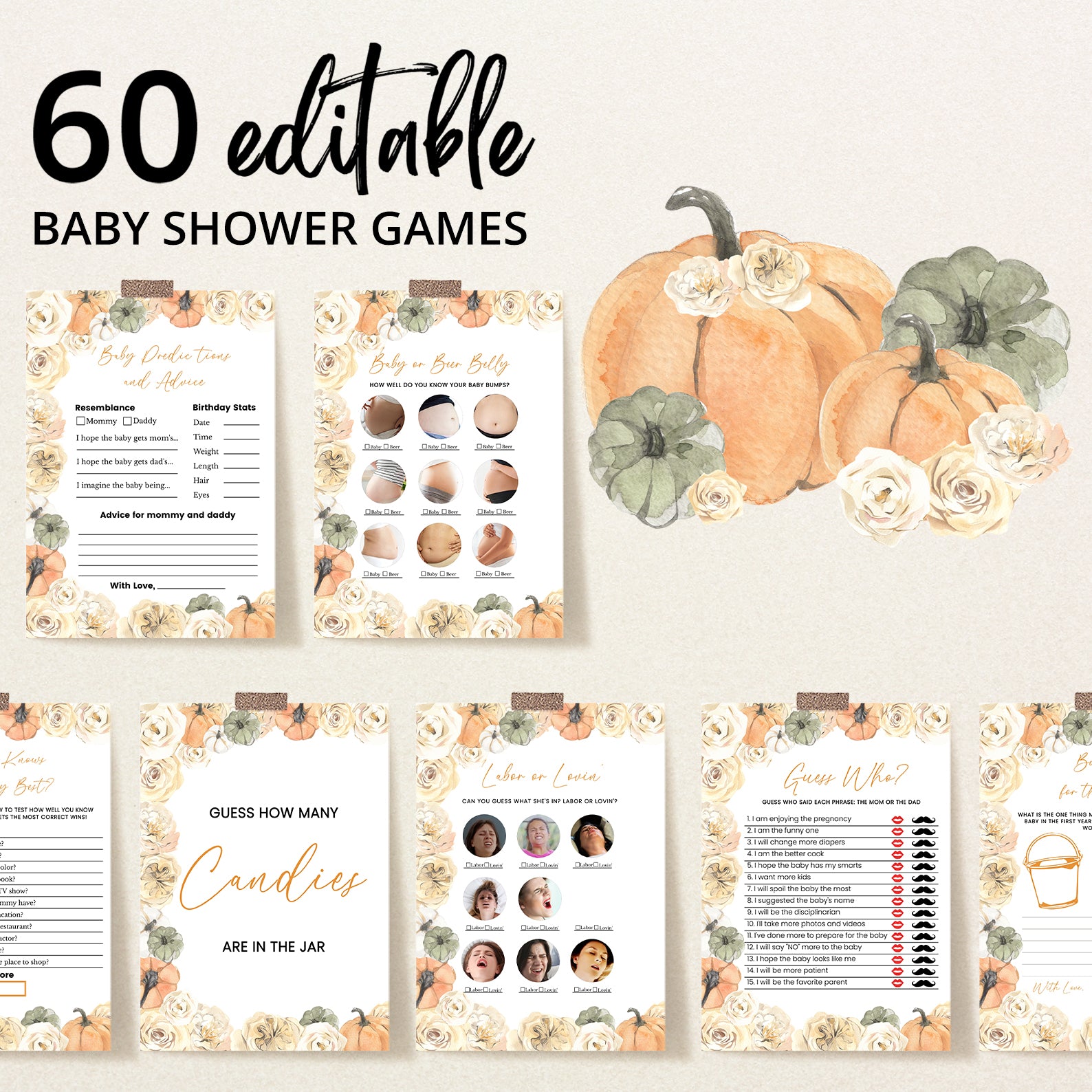 Liven up your baby shower with this 60-piece editable game bundle, designed with a cozy fall aesthetic. Each game is accented with watercolor pumpkins, soft florals, and seasonal greenery in warm hues. From classics like Baby Bingo to modern favorites, this beautifully themed collection ensures guests stay entertained while enhancing the charm of your pumpkin-inspired baby shower celebration.