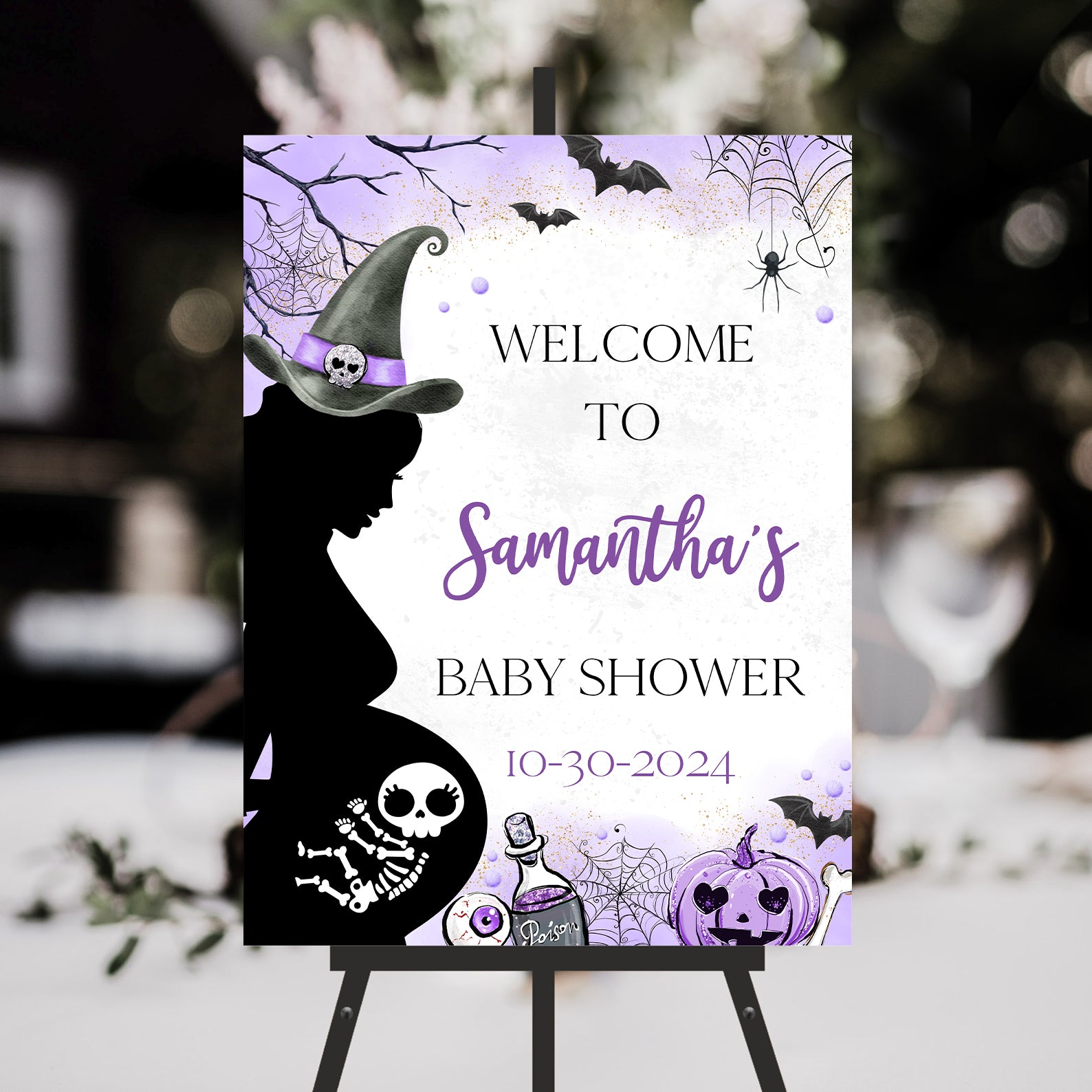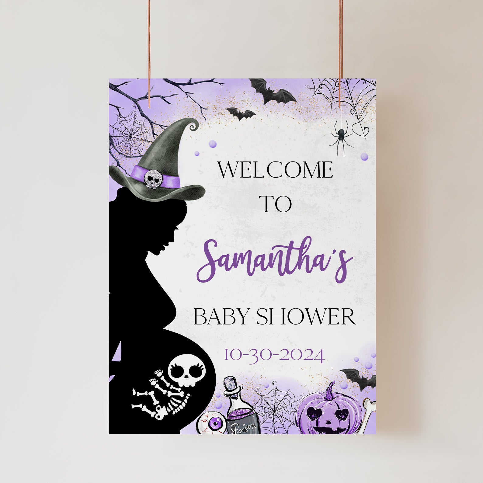 1. Purchase this A Baby is Brewing Purple Halloween Digital Baby Shower Welcome Sign template