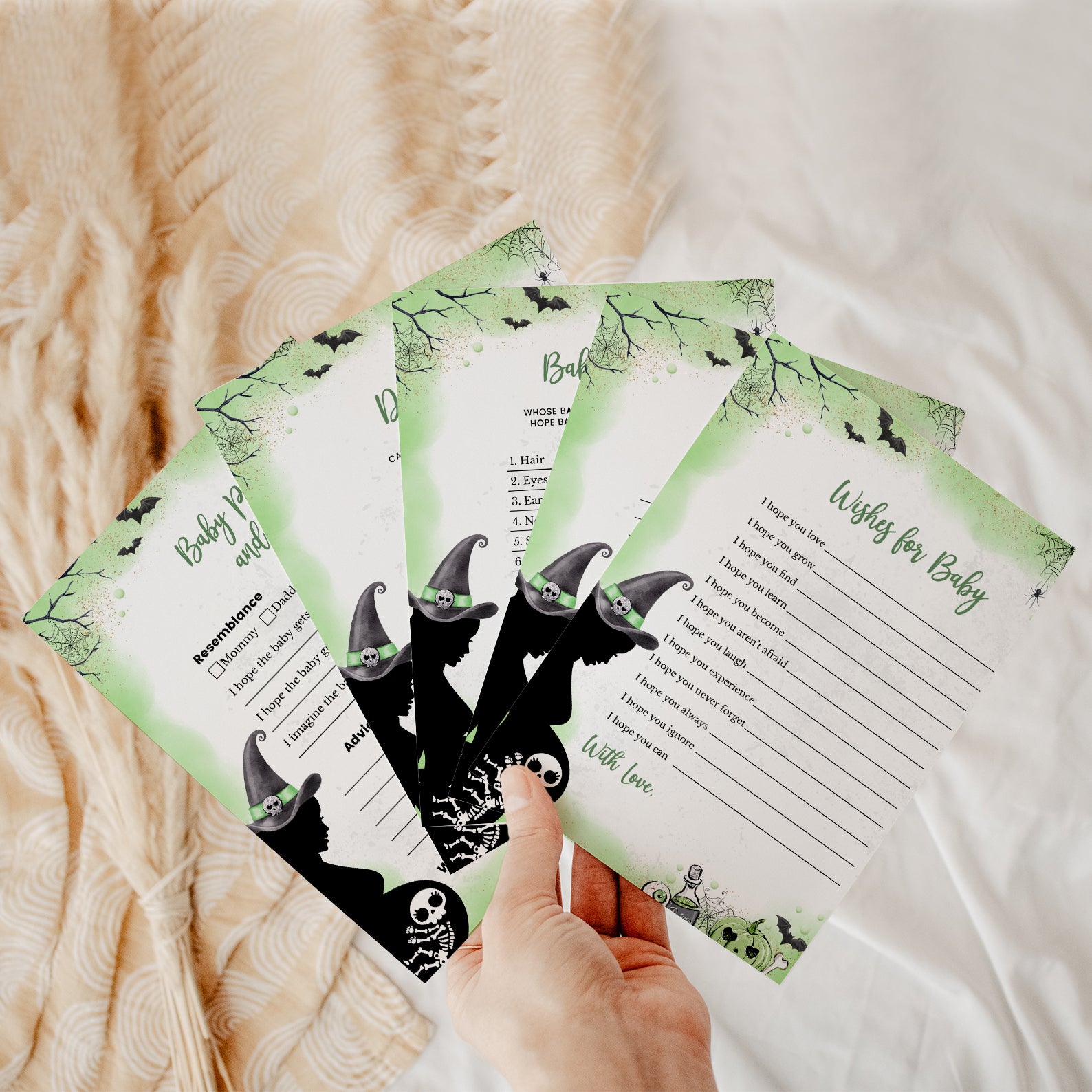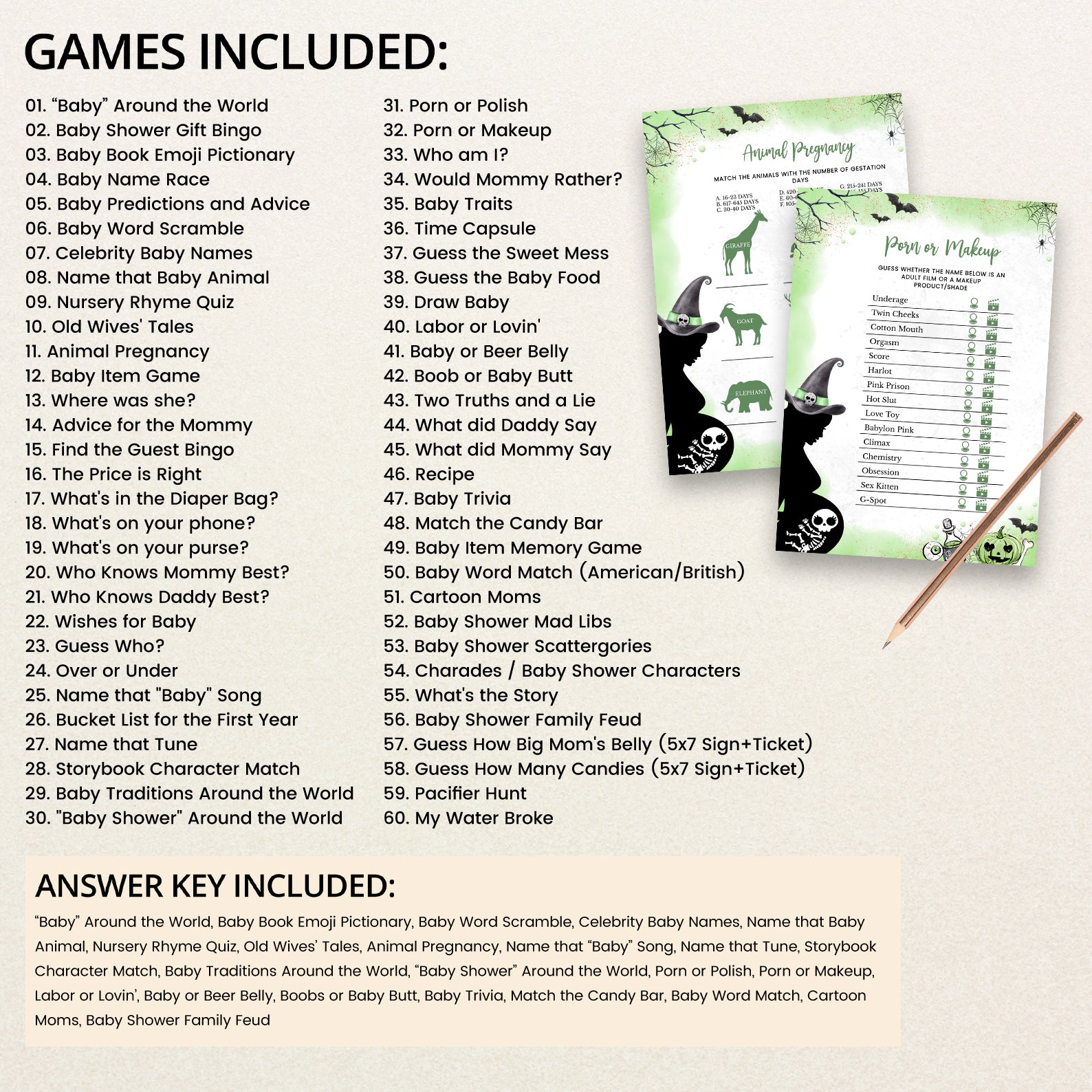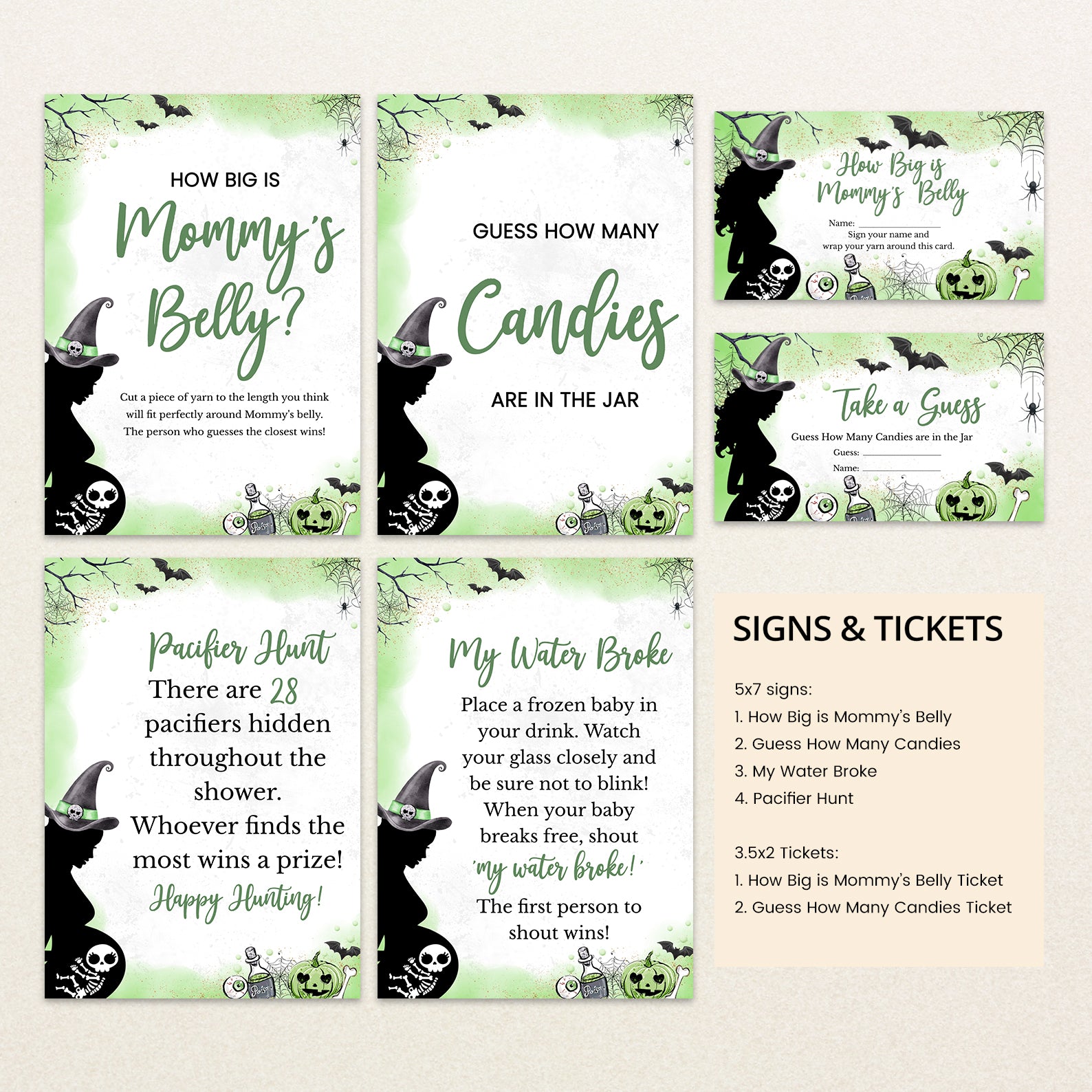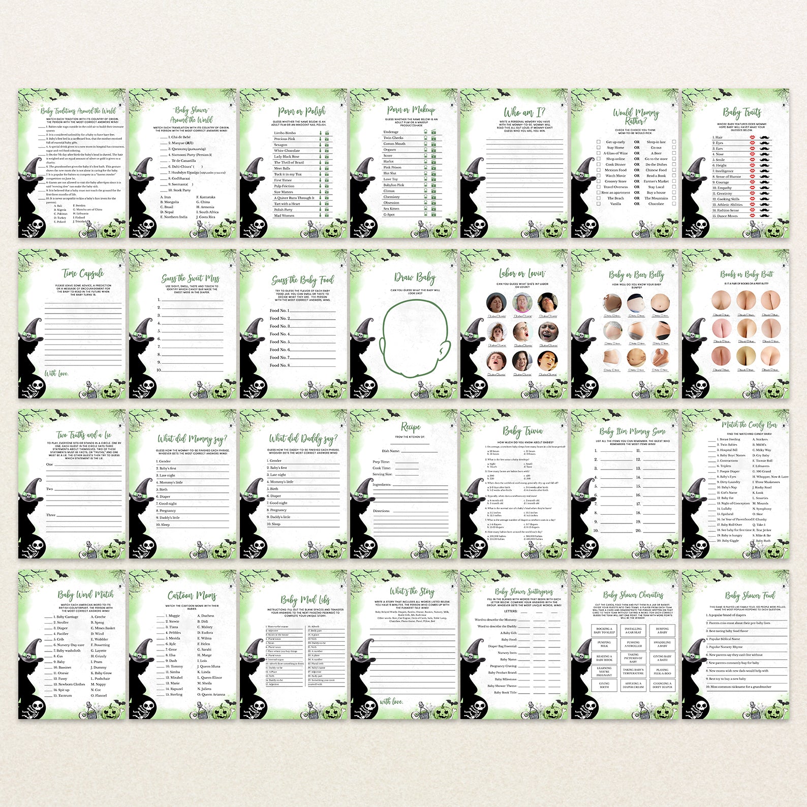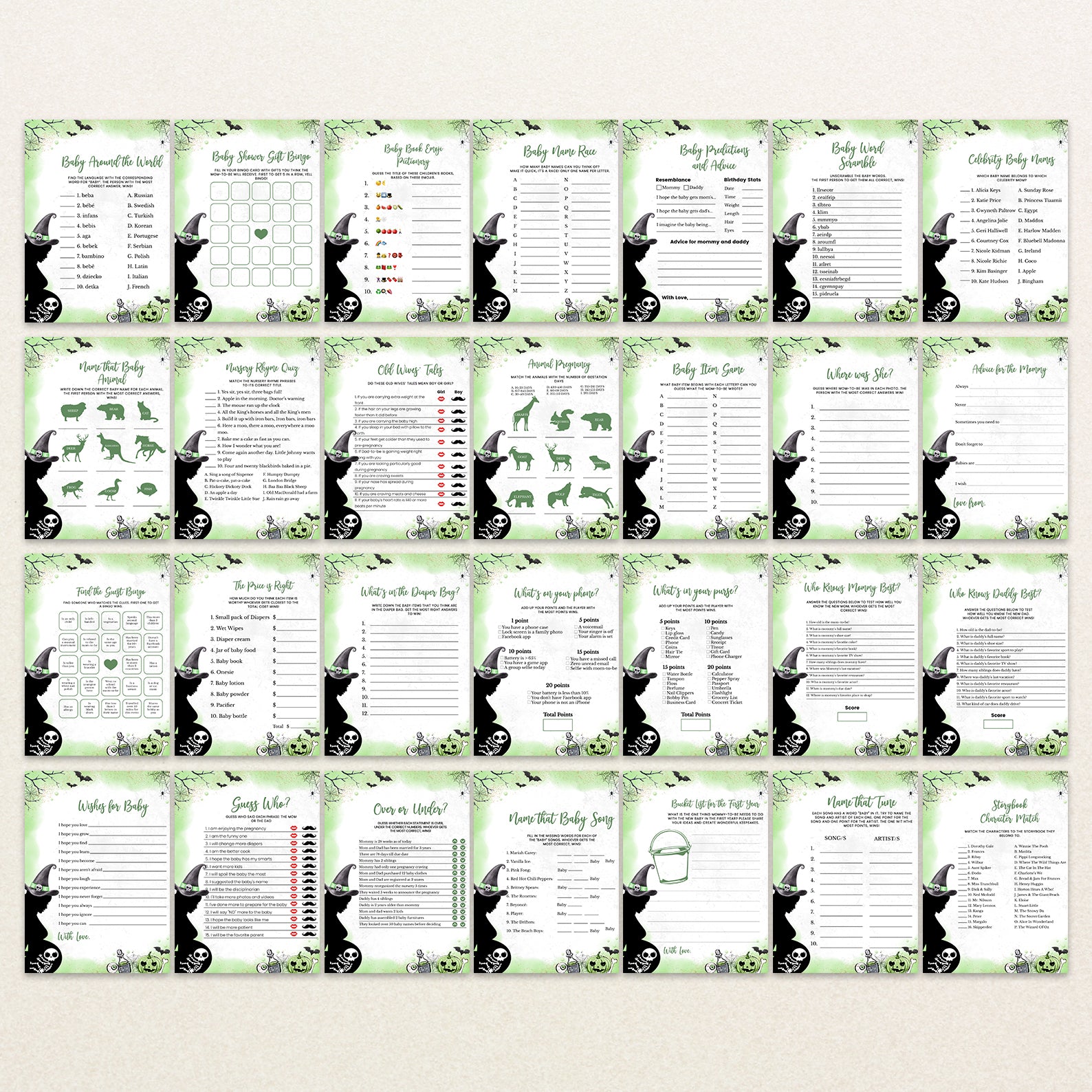 Bring excitement to your baby shower with our "Baby is Brewing" game bundle! This set includes editable games featuring Halloween elements like pumpkins, bats, potions, and cauldrons. Choose from themes and colors such as green, purple, blue, and orange. Perfect for any Halloween-themed baby shower, these games showcase a pregnant witch wearing a spooky hat with a baby skeleton on her tummy. Keep your guests entertained and make your event unforgettable with this delightful game bundle.