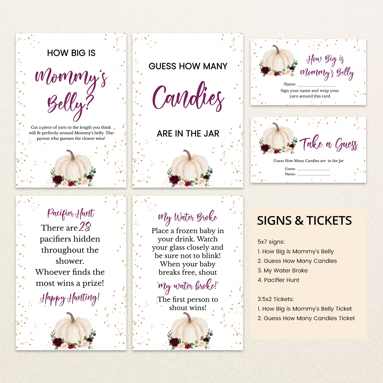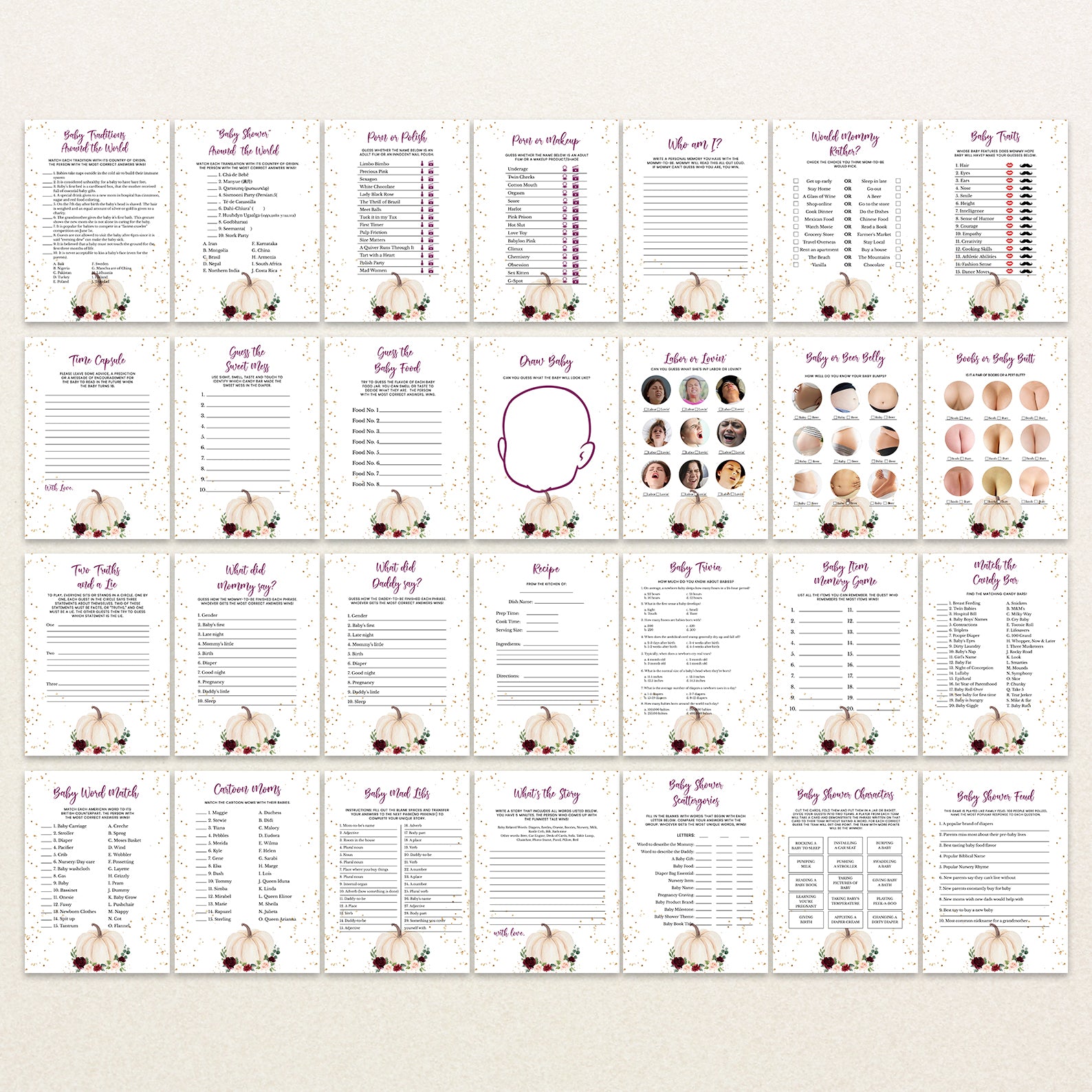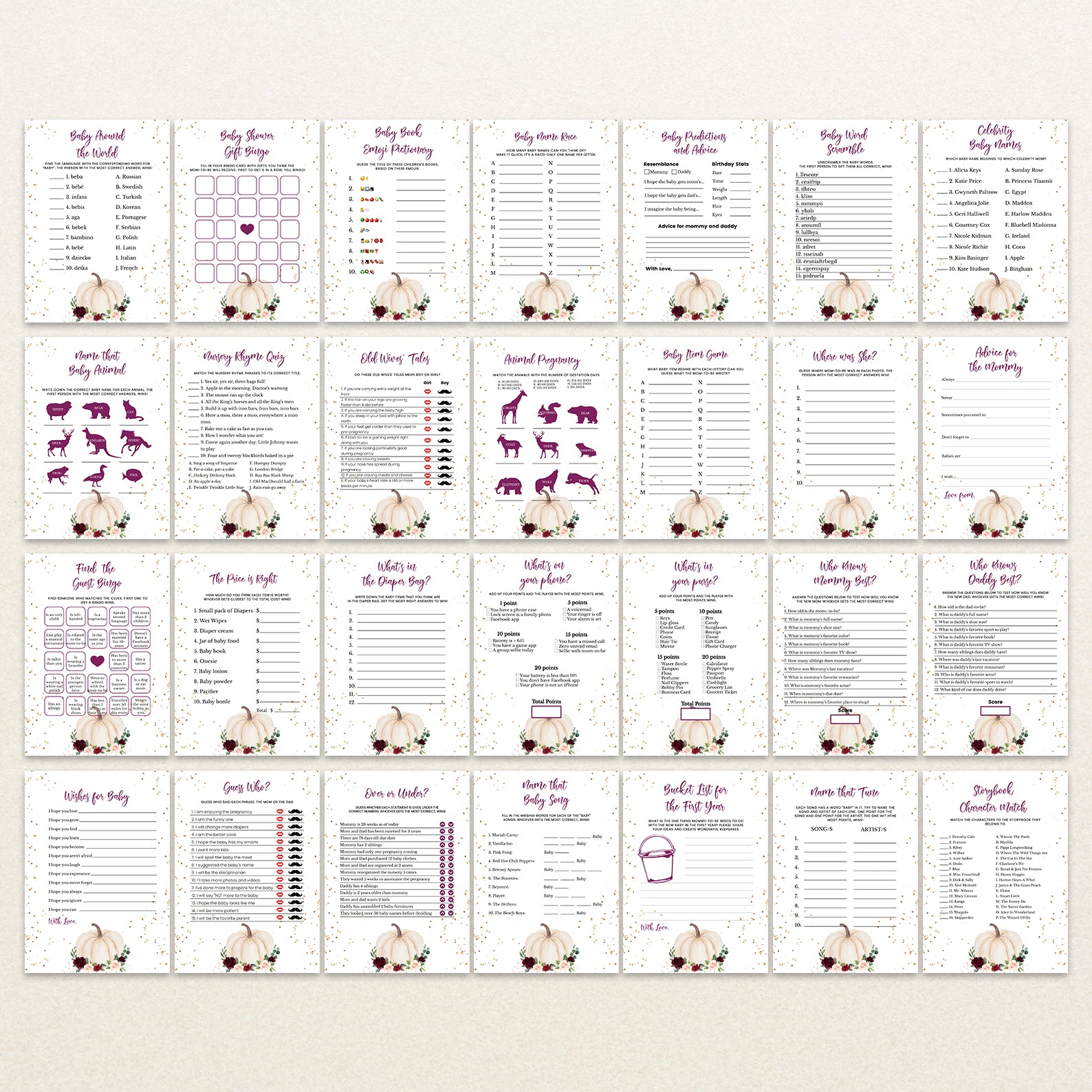 Keep guests engaged with this 60-piece editable baby shower game bundle, featuring vibrant pumpkins, blush-toned roses, and hints of gold sparkle. Each game is beautifully designed to match your fall theme, making it easy to entertain while staying on-brand. Whether you’re hosting indoors or outdoors, this set blends fun with elegance for a memorable baby shower experience.