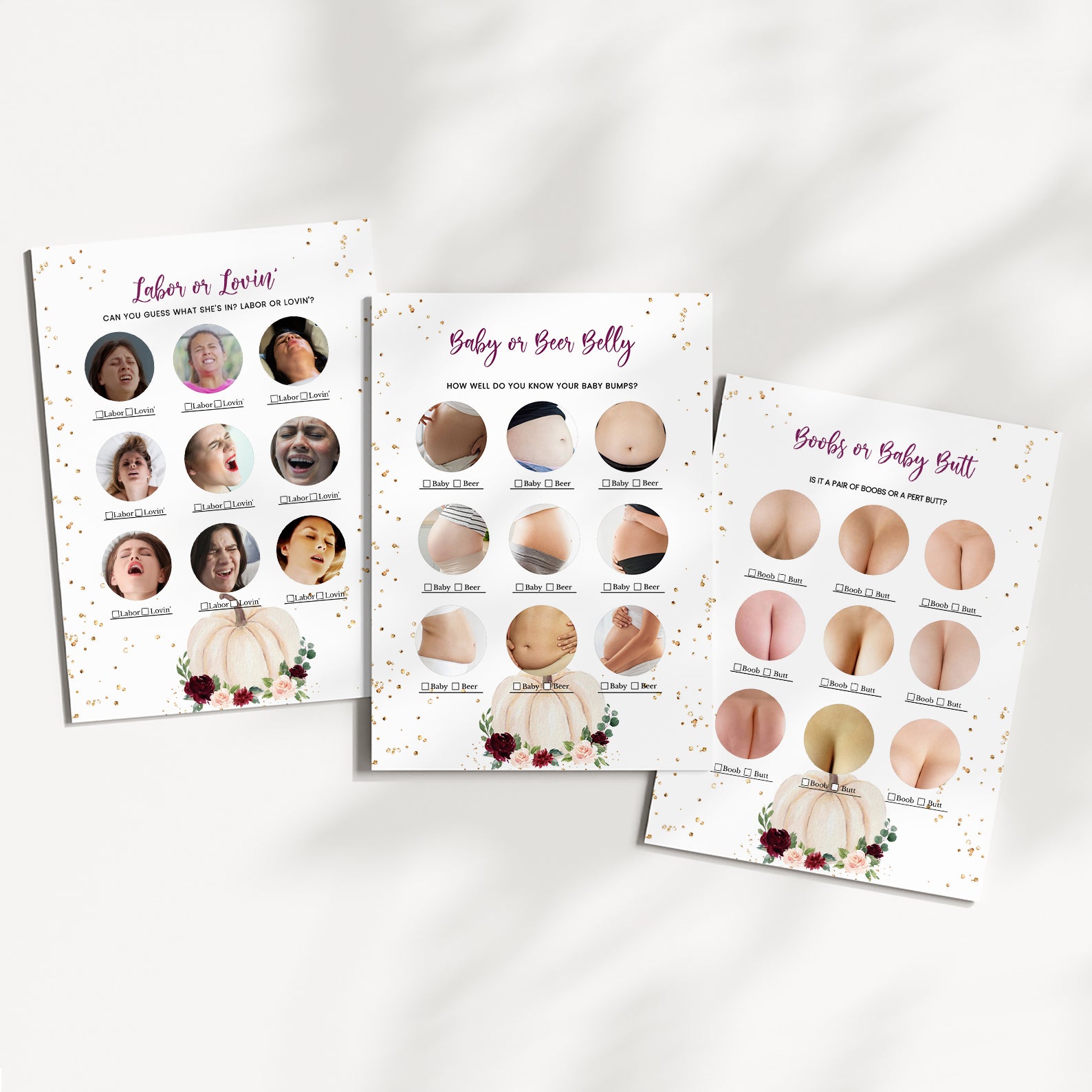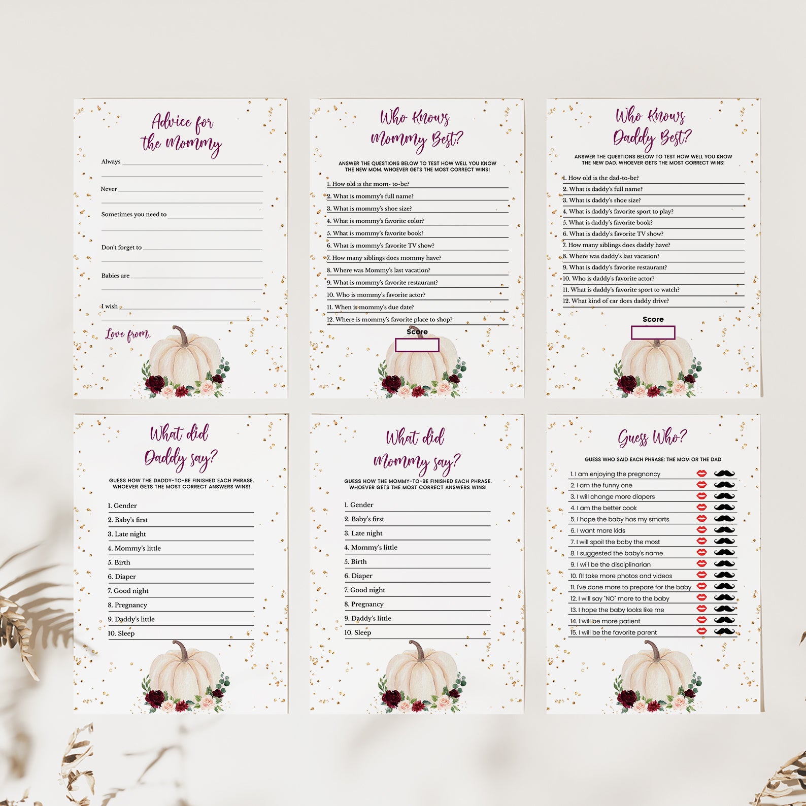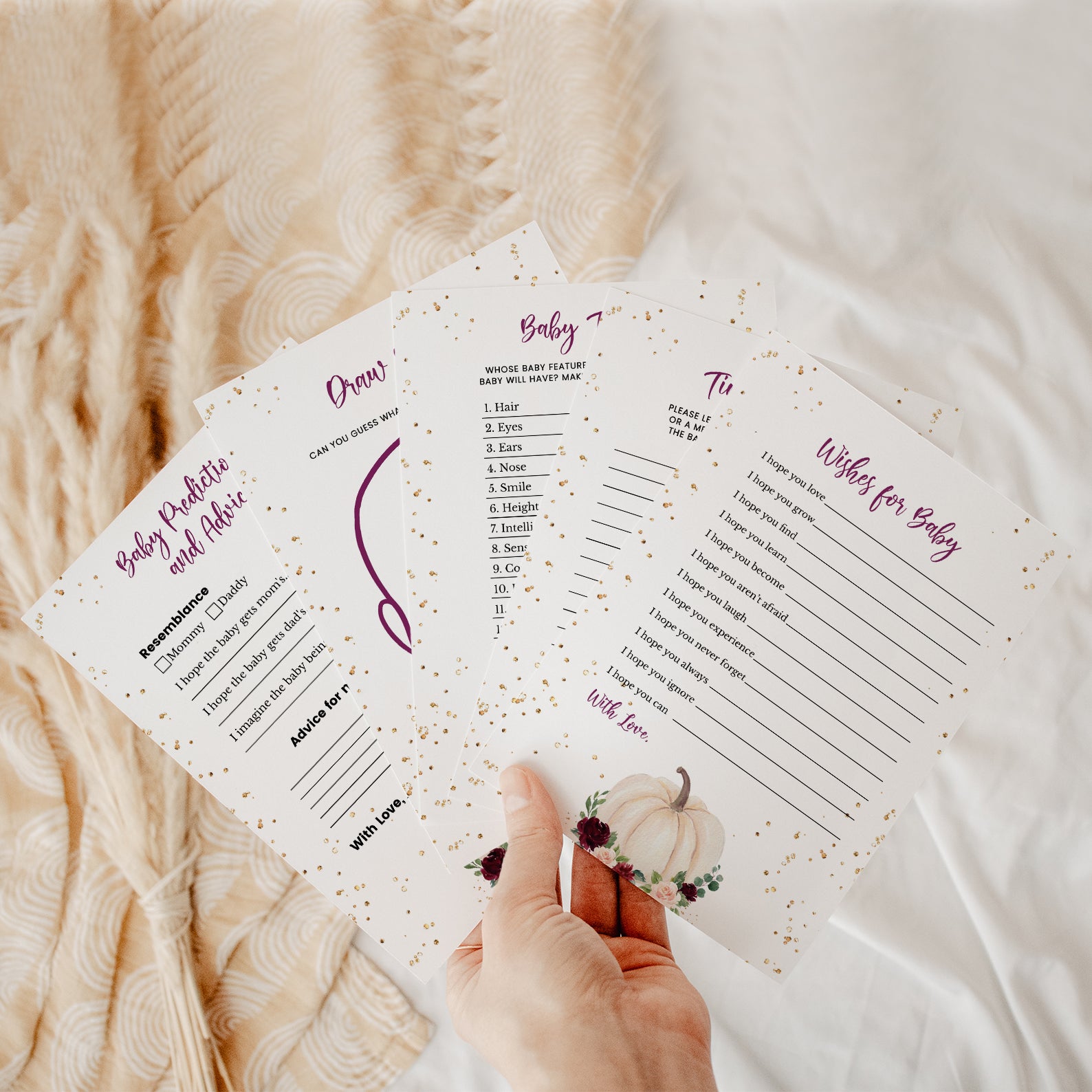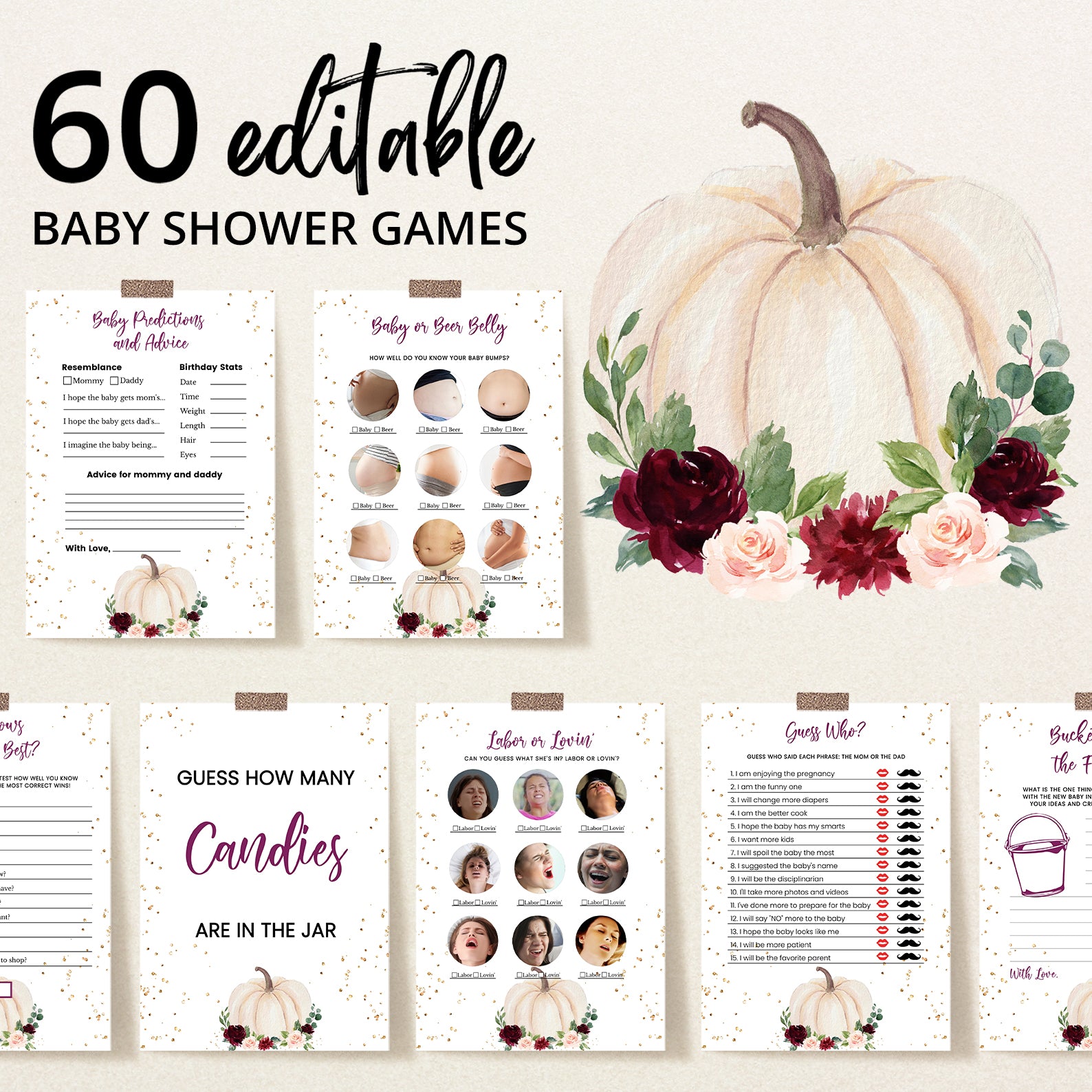 Keep guests engaged with this 60-piece editable baby shower game bundle, featuring vibrant pumpkins, blush-toned roses, and hints of gold sparkle. Each game is beautifully designed to match your fall theme, making it easy to entertain while staying on-brand. Whether you’re hosting indoors or outdoors, this set blends fun with elegance for a memorable baby shower experience.