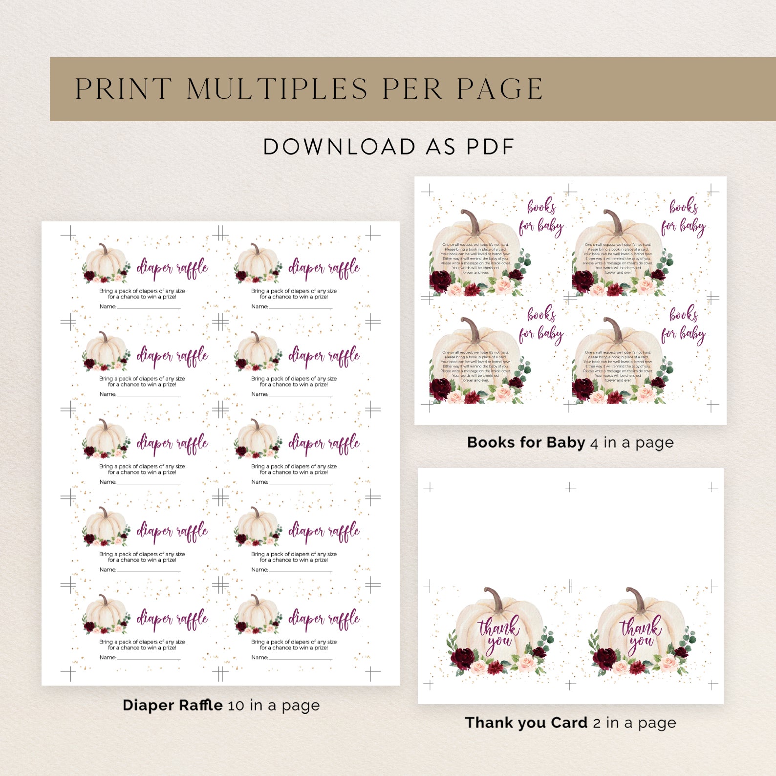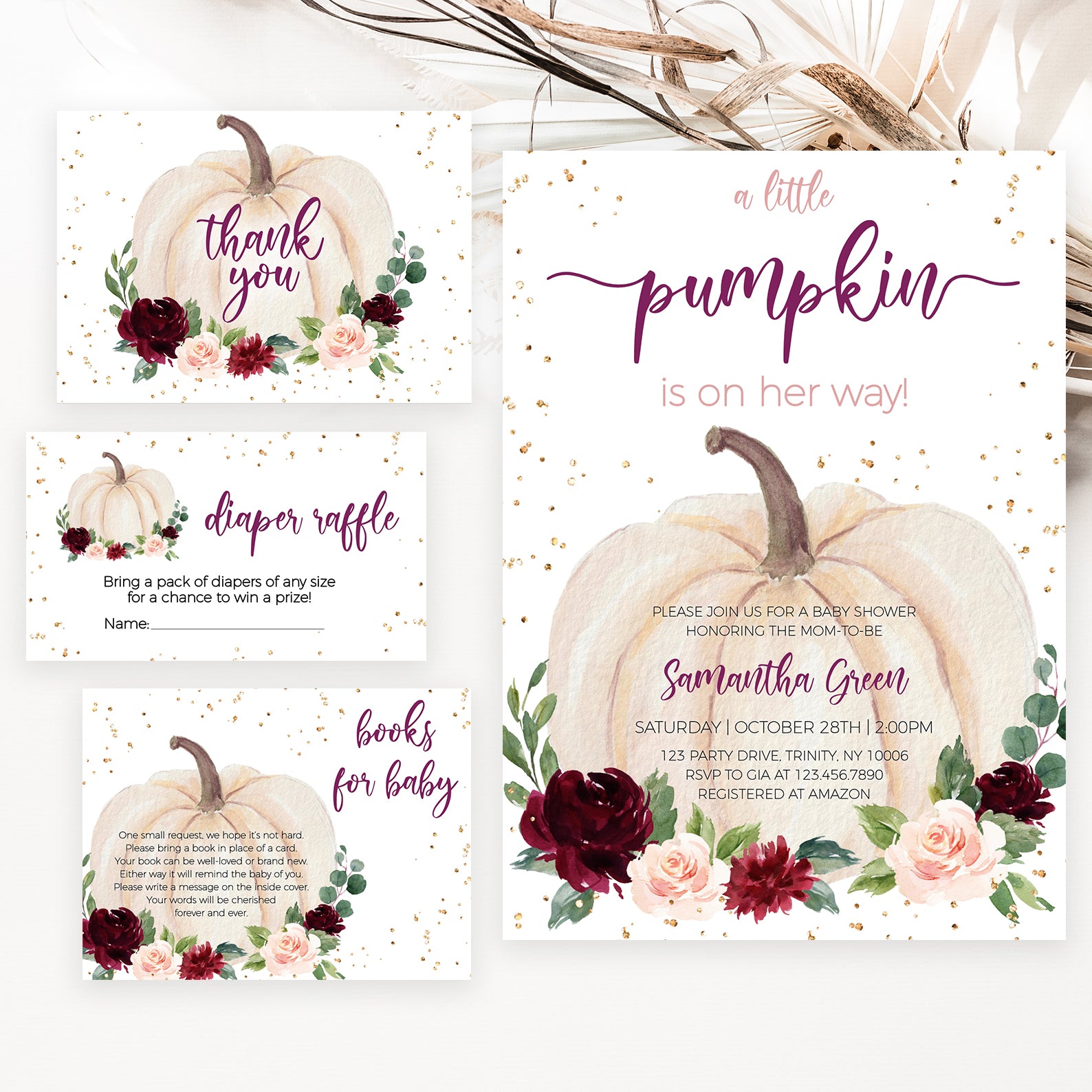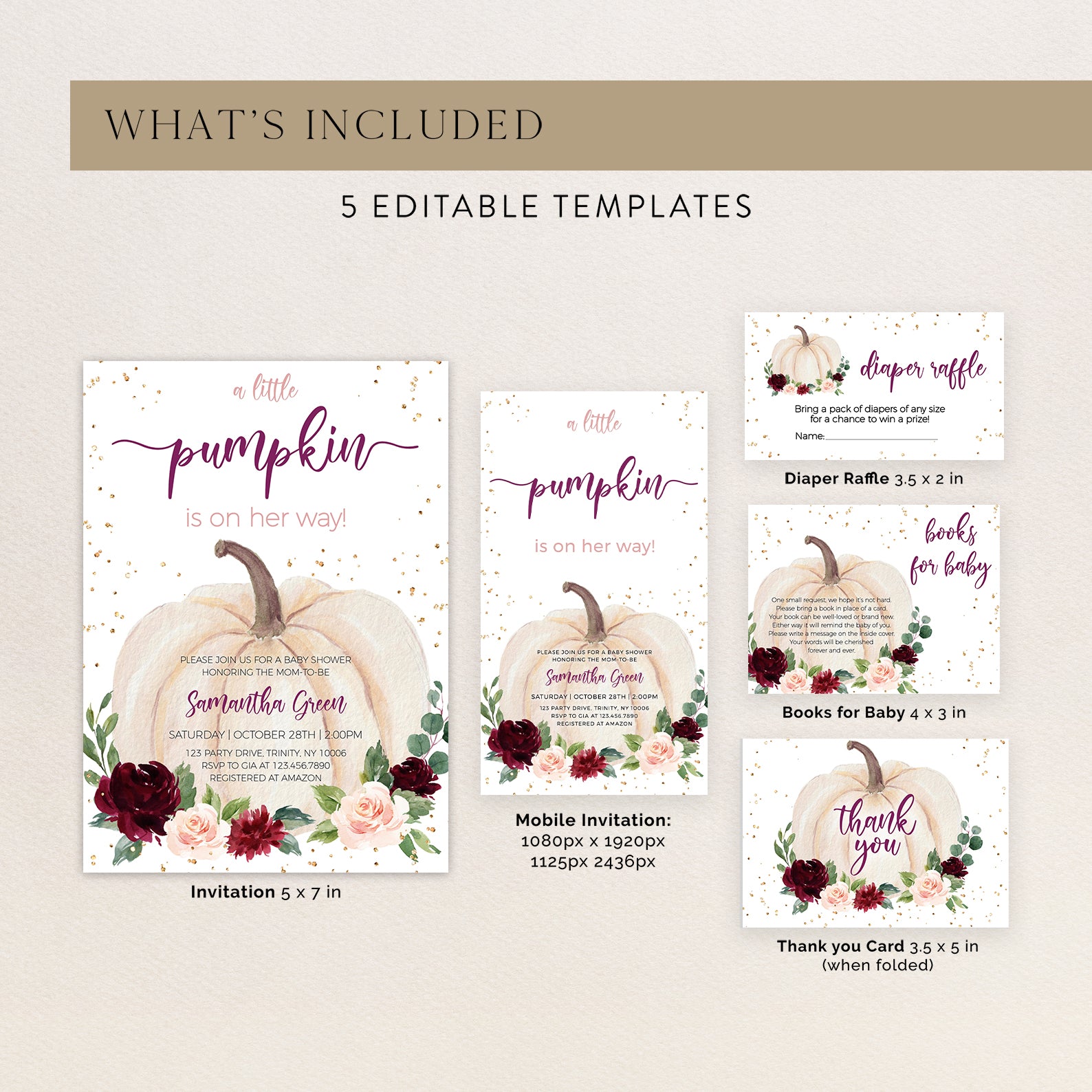 Celebrate your little one with our Fall Baby Shower Invitation Bundle. This set includes an invitation, mobile invite, diaper raffle, books for baby card, and thank you card, all featuring a vibrant orange pumpkin adorned with roses and gold sparkles. Perfect for adding autumn charm and whimsy to your special event.