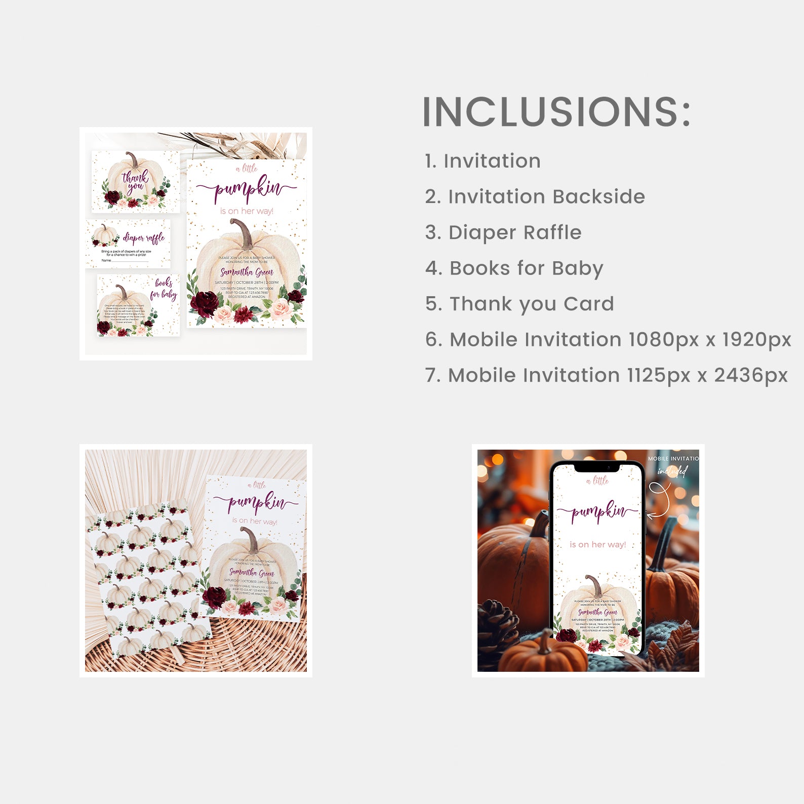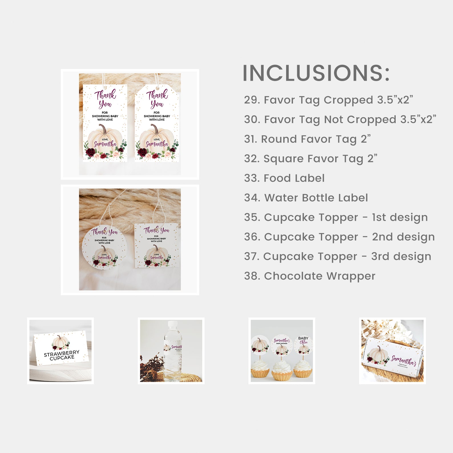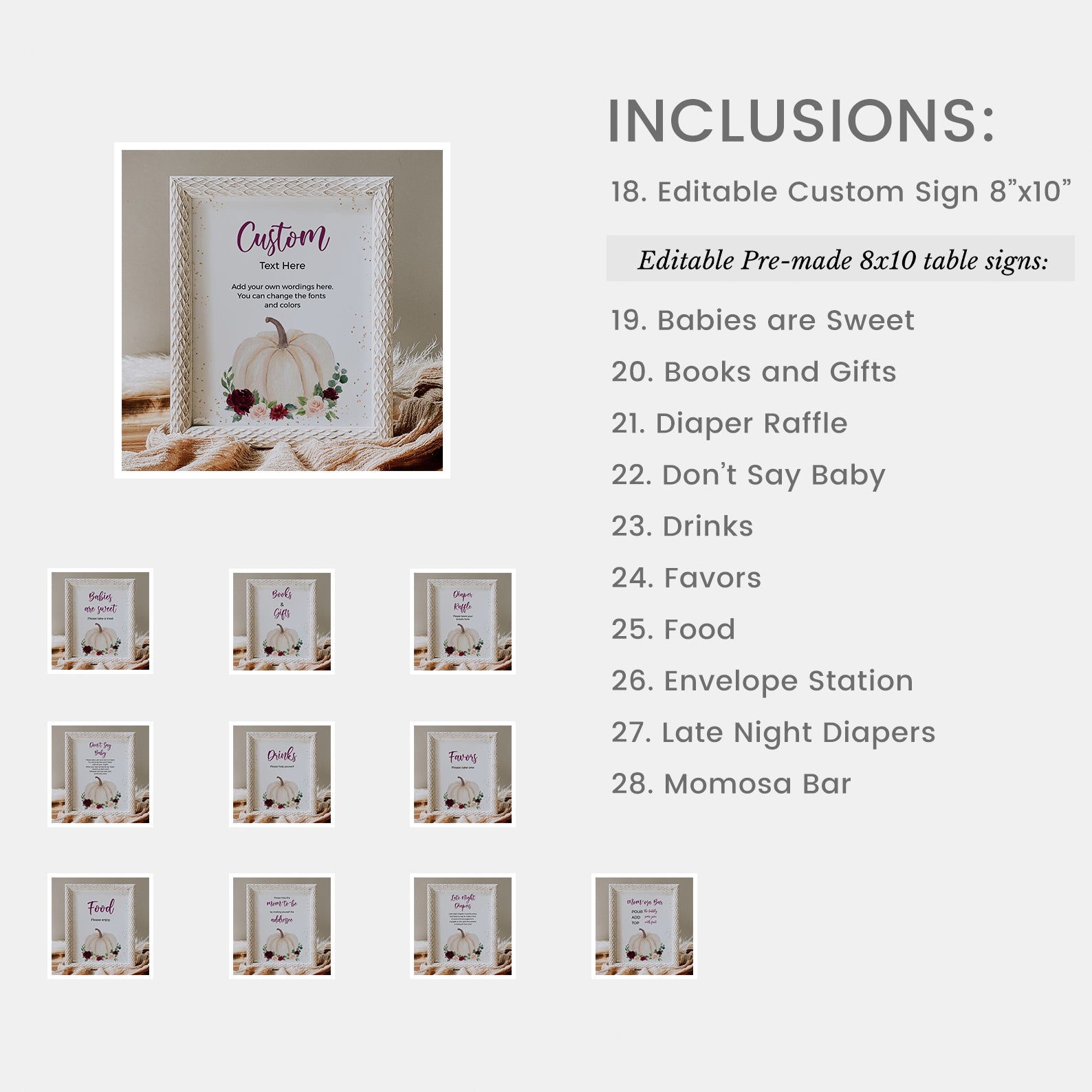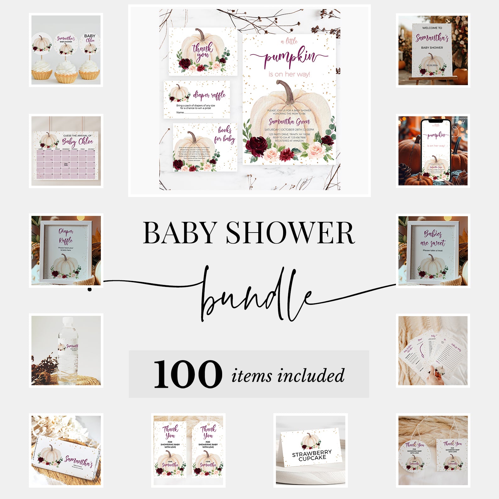 Host a perfectly coordinated fall baby shower with this 100-piece editable mega bundle. From invitations and games to favor tags and table signs, each item features rich orange pumpkins, romantic watercolor roses, lush greenery, and glimmering gold accents. This all-in-one set ensures every detail is beautifully styled, making it easy to create a cohesive and festive event your guests will remember.