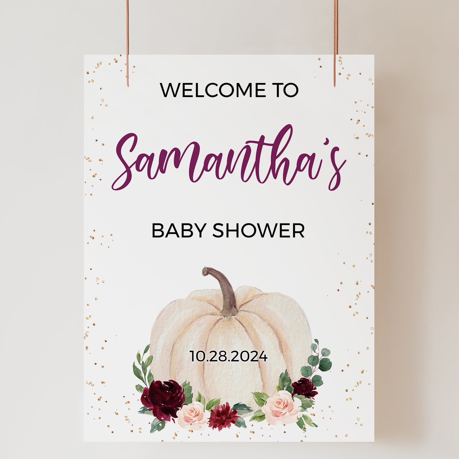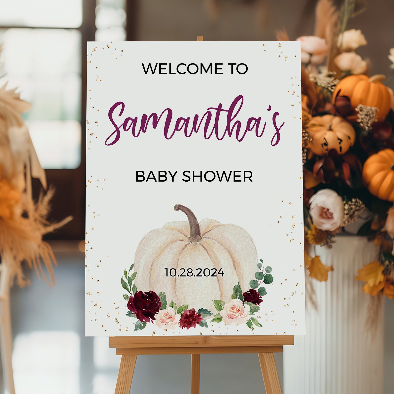 - Purchase this Baby Shower Digital Welcome Sign Orange Pumpkin & Gold Sparkles template