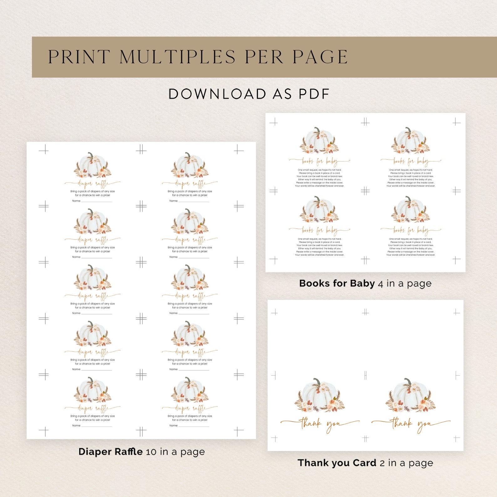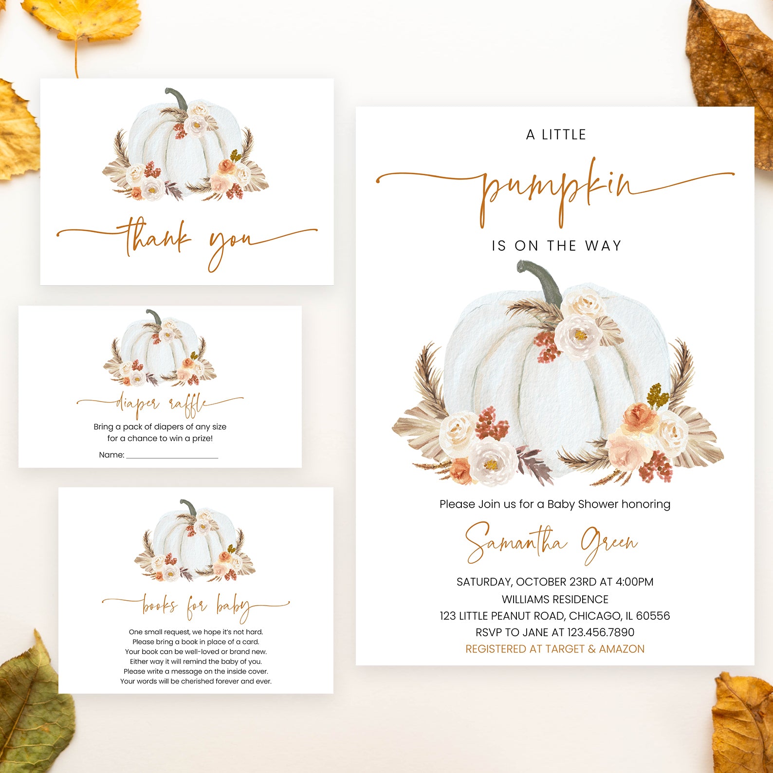 Welcome your little one with our Fall Baby Shower Invitation Bundle. This set includes a digital invitation, mobile invite, diaper raffle, books for baby card, and thank you card, all featuring a whimsical white pumpkin adorned with boho watercolor roses. Perfect for adding autumn charm and elegance to your celebration.
