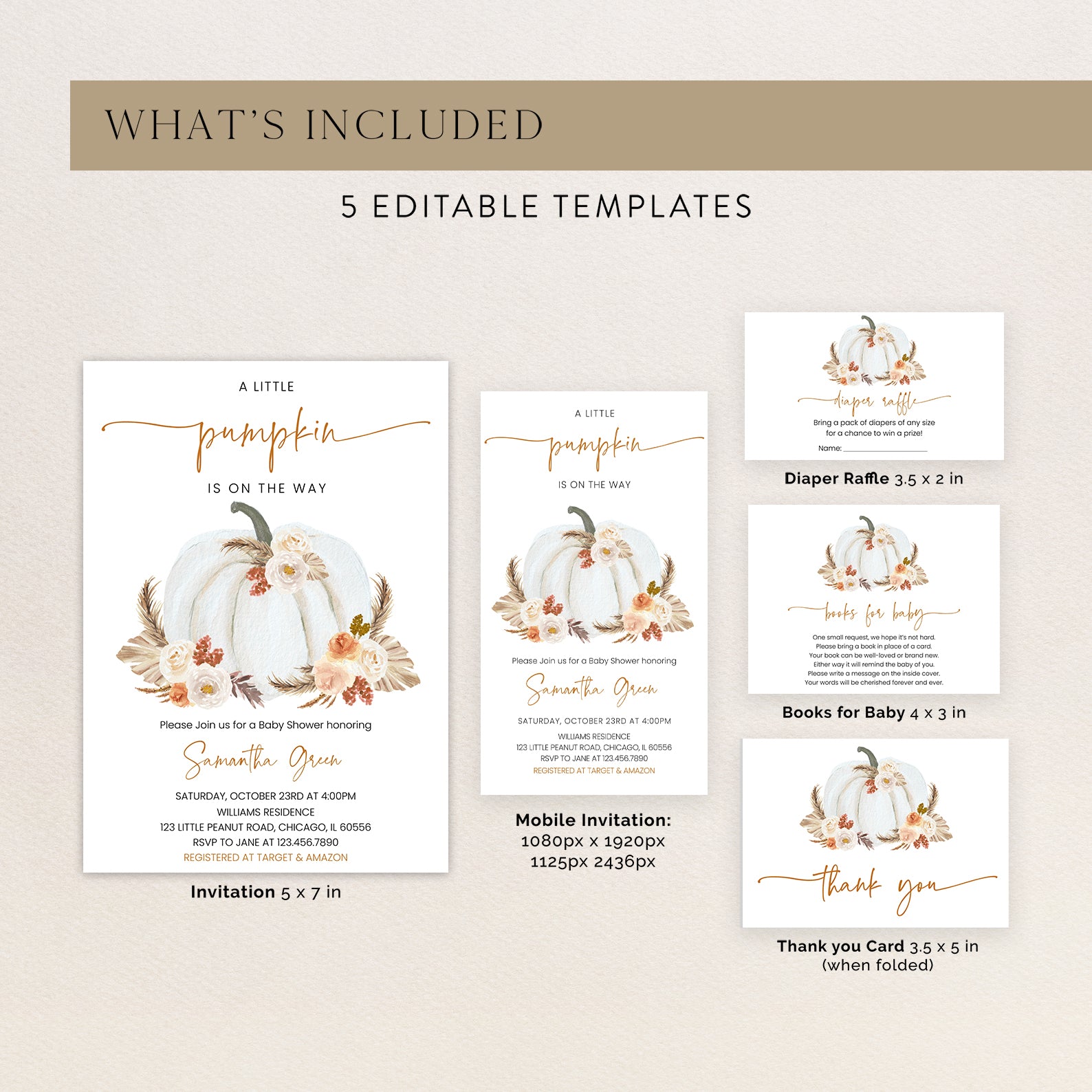 - Purchase this Little Pumpkin on the Way Invite Bundle: White Pumpkin & Boho Roses template