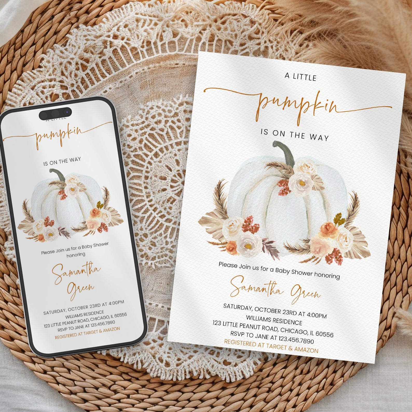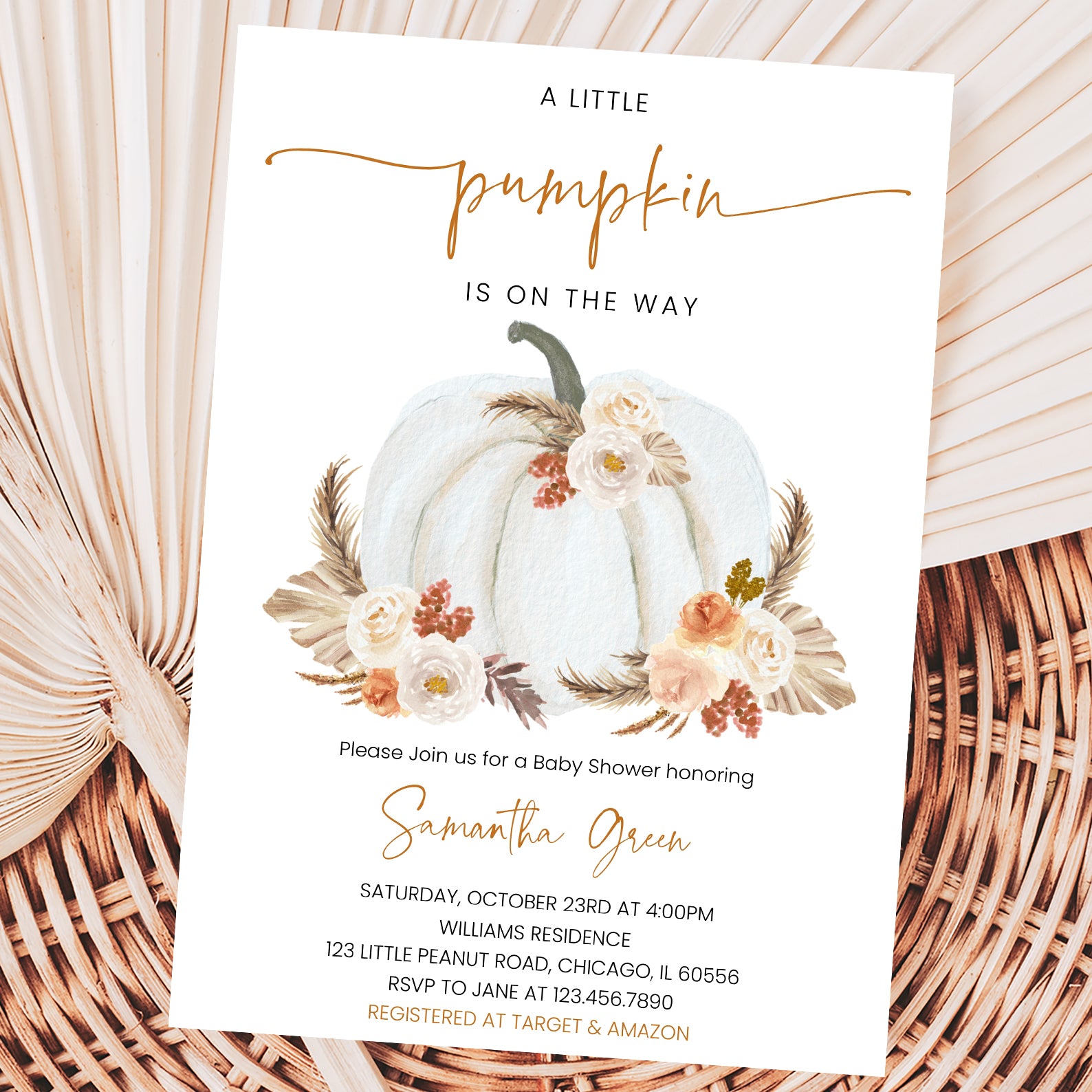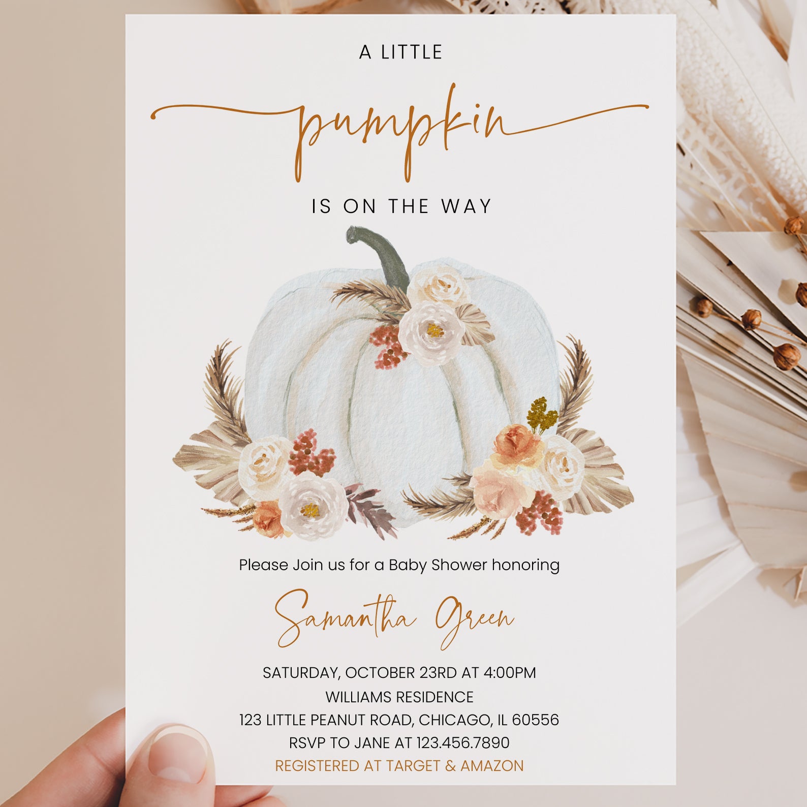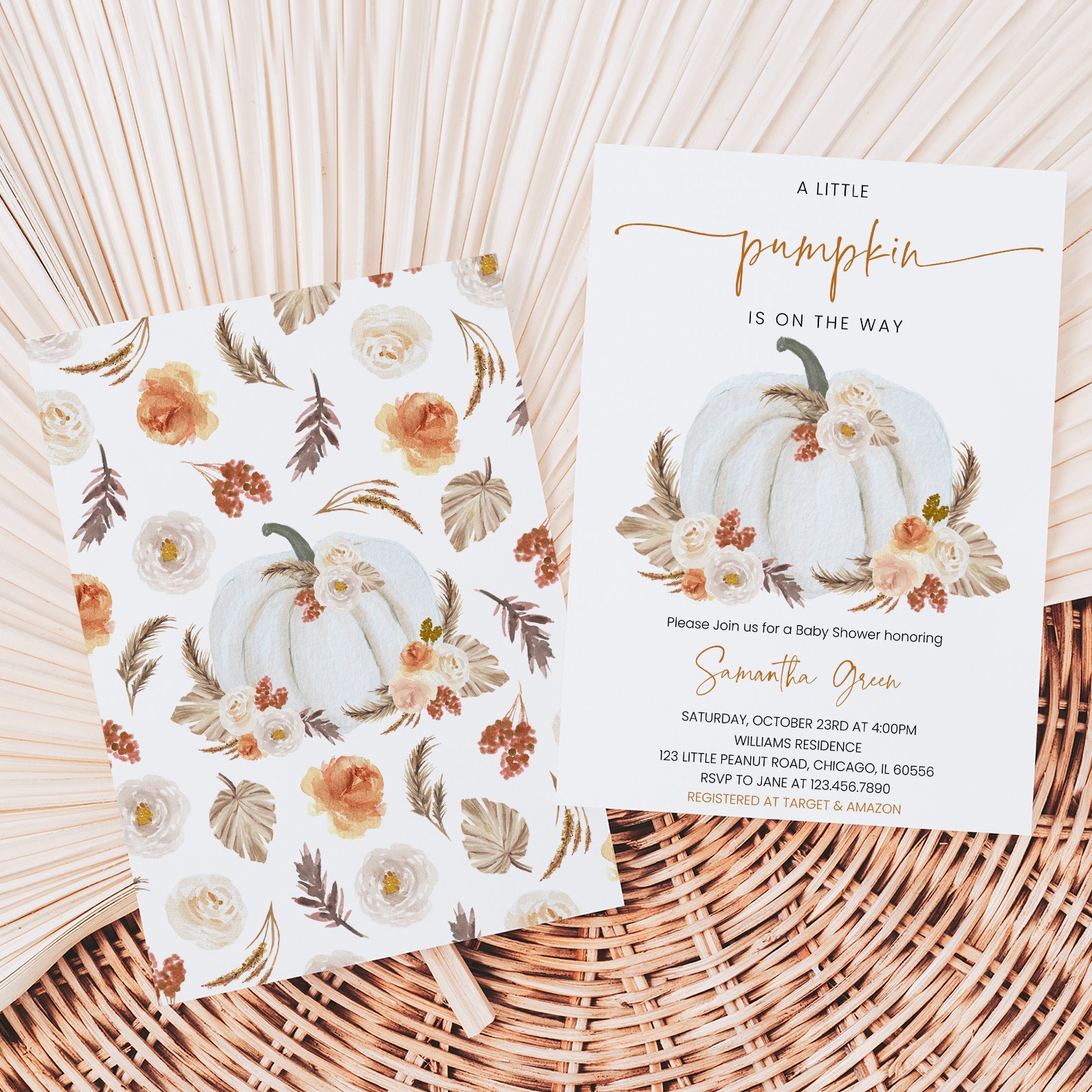 - Purchase this Little Pumpkin on the Way Invite: White Pumpkin & Boho Roses template