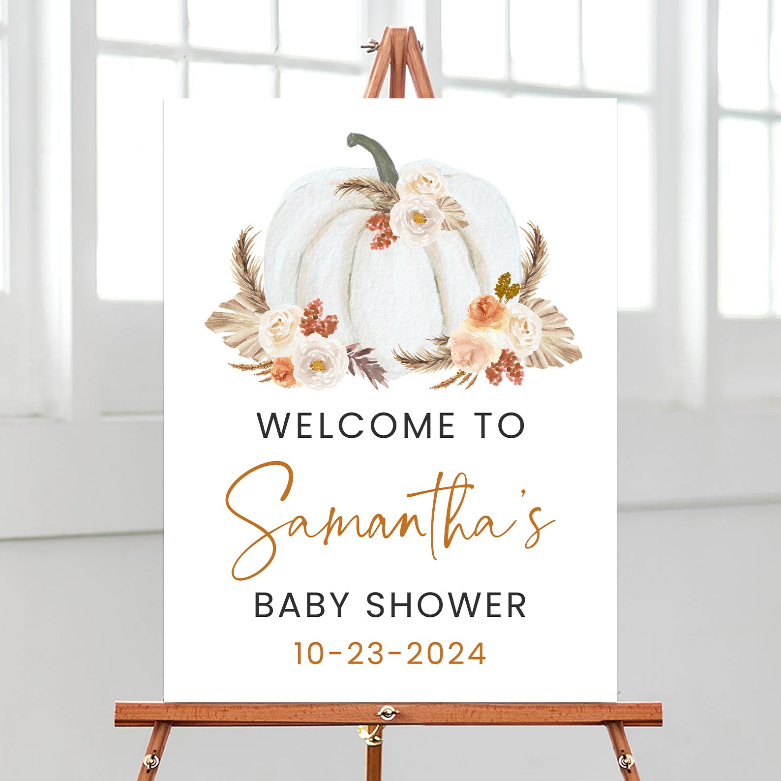 Greet your guests with our Fall Baby Shower Welcome Sign. Featuring a whimsical white pumpkin adorned with boho watercolor roses, this sign adds autumn charm and elegance to your celebration
