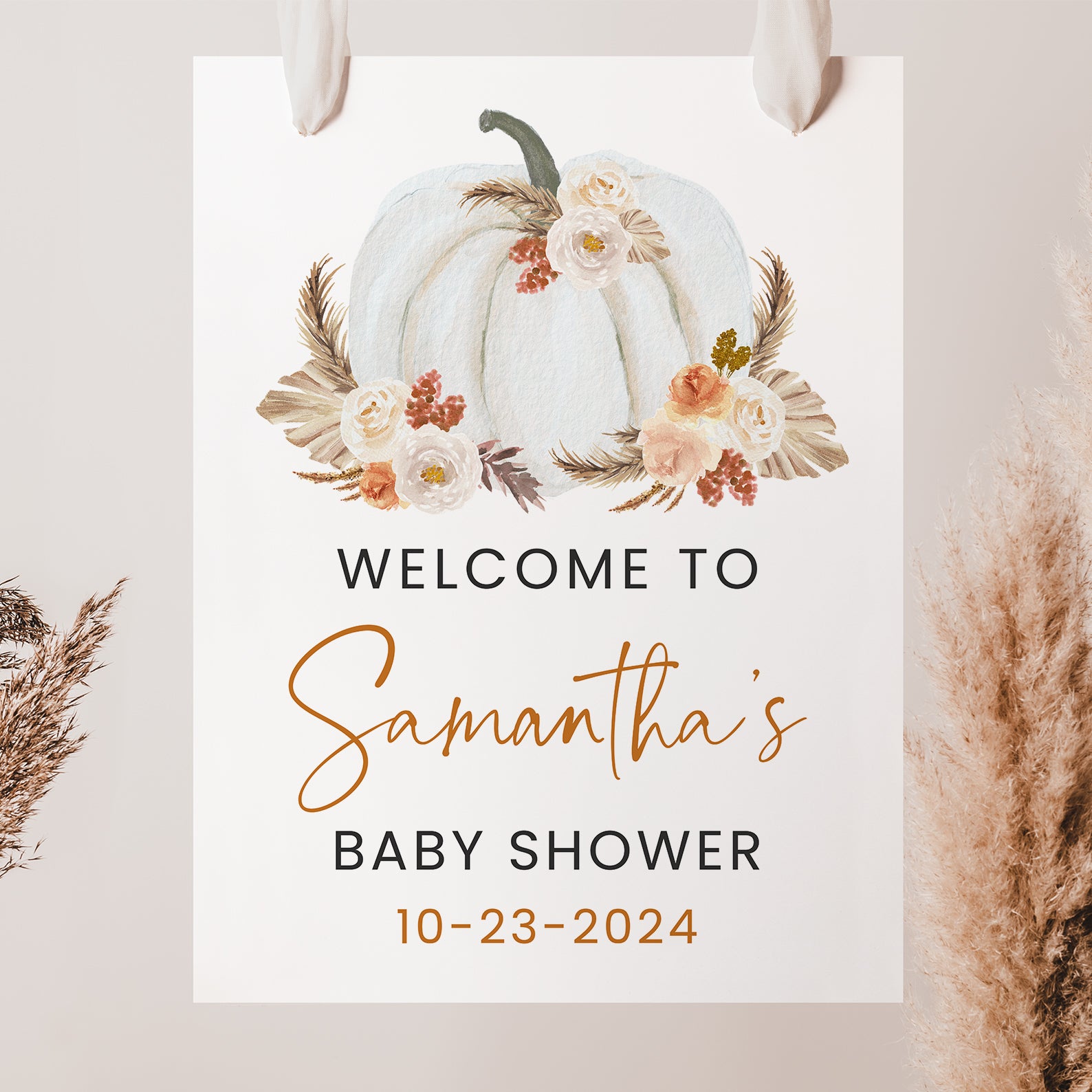 - Purchase this Little Pumpkin on the Way Welcome Sign: White Pumpkin & Boho Roses template