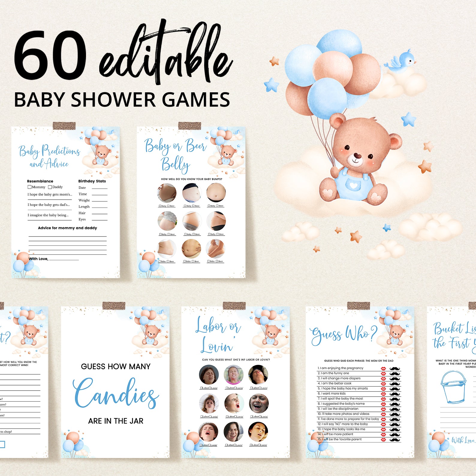 1. Purchase this We Can Bearly Wait Baby Shower Game Bundle: Blue Balloons & Clouds template