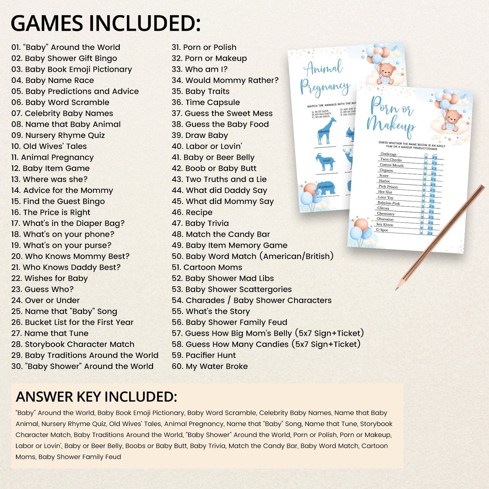 Get ready for an unforgettable celebration with our We Can Bearly Wait Baby Shower Game Bundle! Featuring 60 customizable games, this delightful collection is designed to keep your guests entertained and engaged throughout the event. Inspired by the charming blue theme of the invitation, the games include everything from playful trivia to interactive word searches, all infused with whimsical touches like fluffy clouds and stars. The bundle effortlessly complements your baby shower, ensuring that your celebration is filled with joy, laughter, and lasting memories. Easy to customize and share, this game bundle is the perfect way to make your baby shower truly unforgettable!