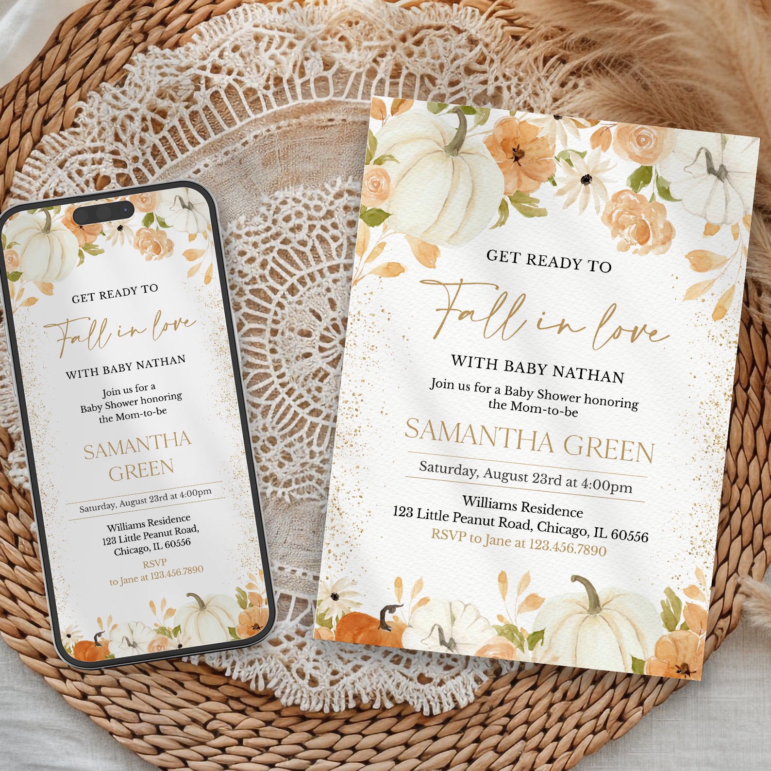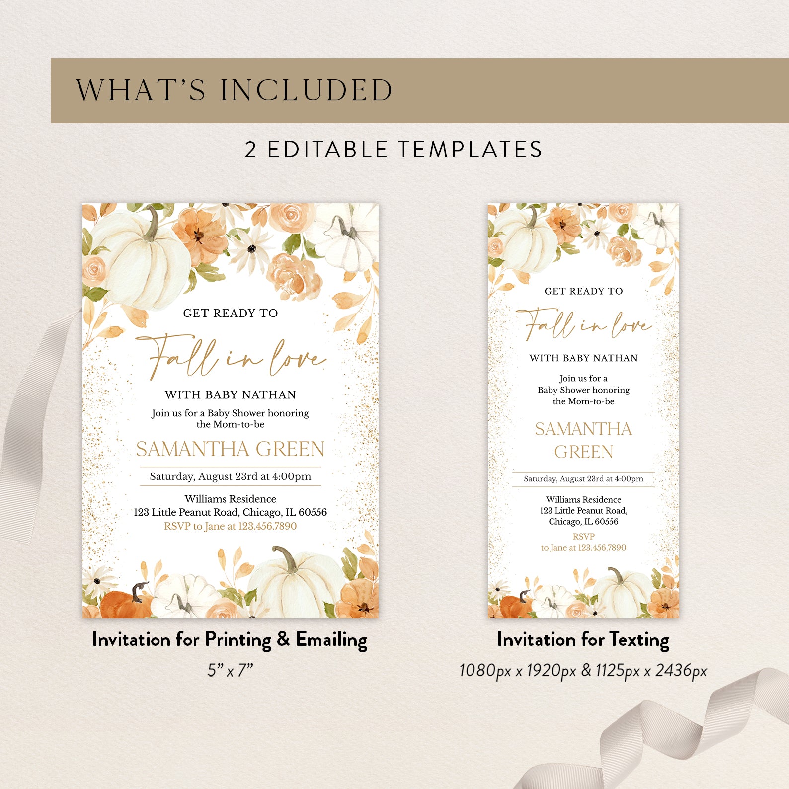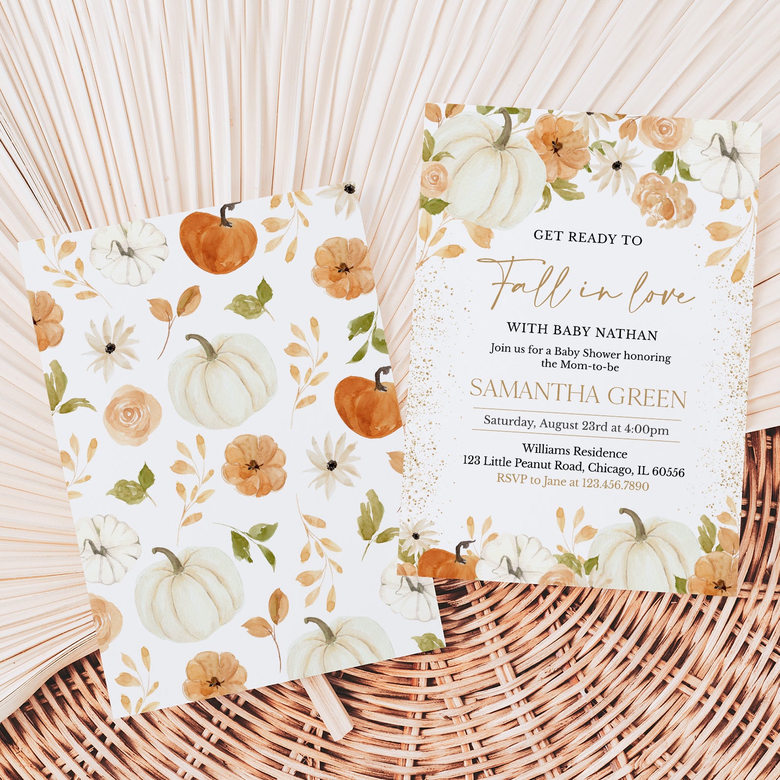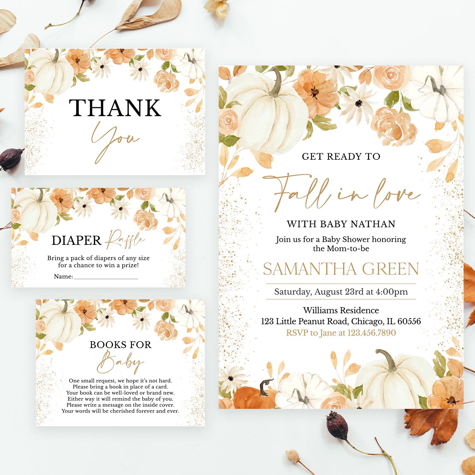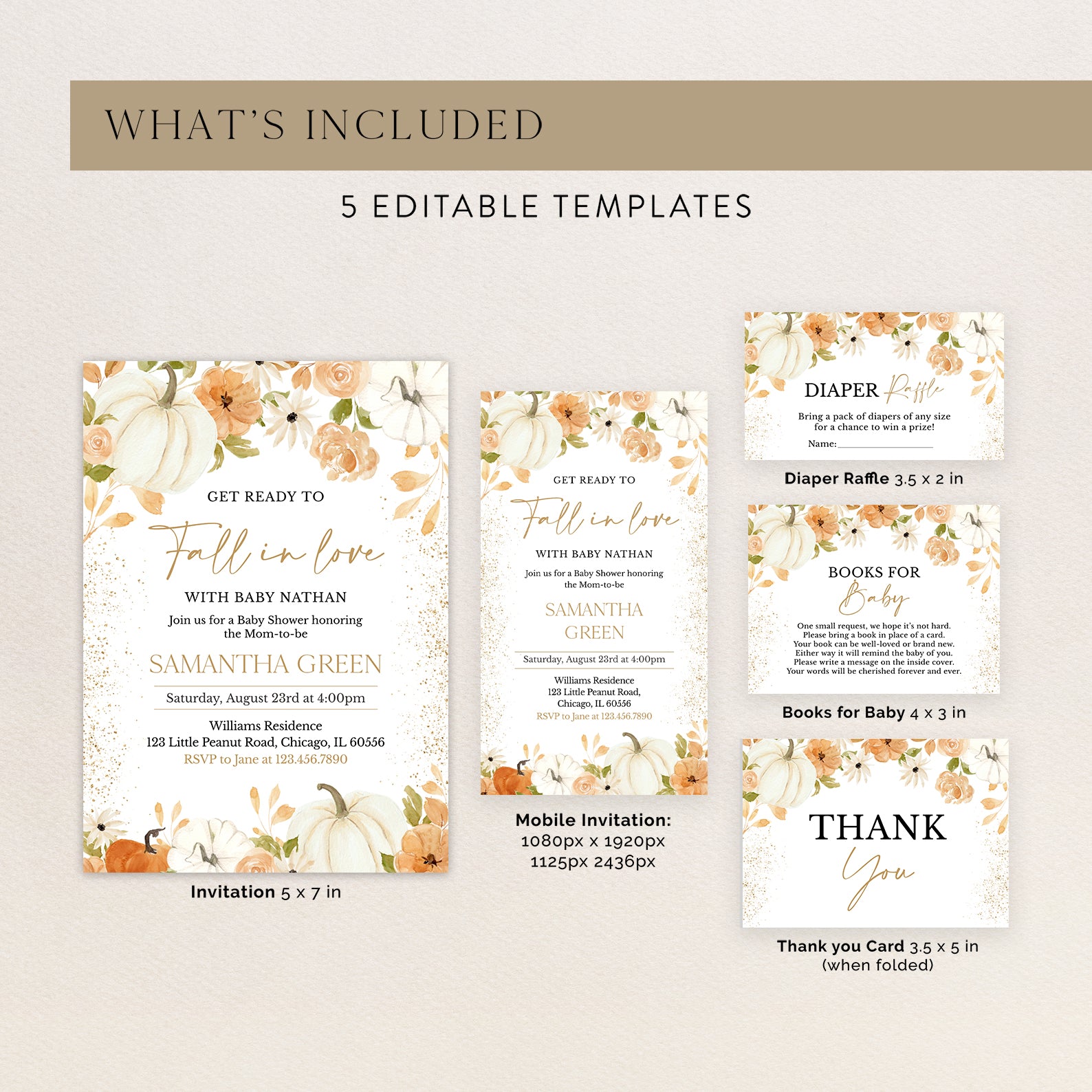 - Purchase this Fall in Love: Pumpkin & Floral Baby Shower Digital Invitation Bundle template