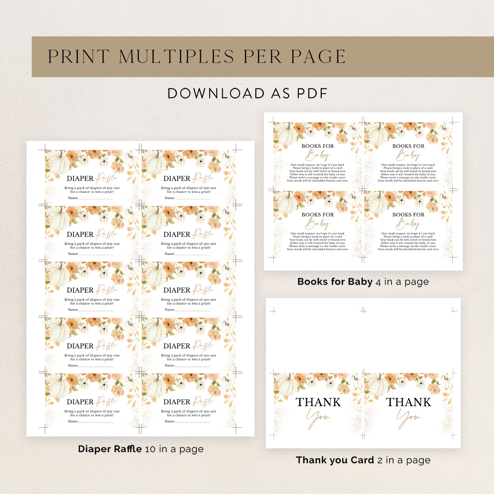 Welcome your little pumpkin with our fall baby shower digital bundle! Featuring vibrant orange hues, watercolor flowers, and charming white pumpkins, this set includes an invitation, mobile invite, diaper raffle, books for baby, and thank you card. Shimmering gold accents add elegance, making it perfect for a cozy autumn celebration.