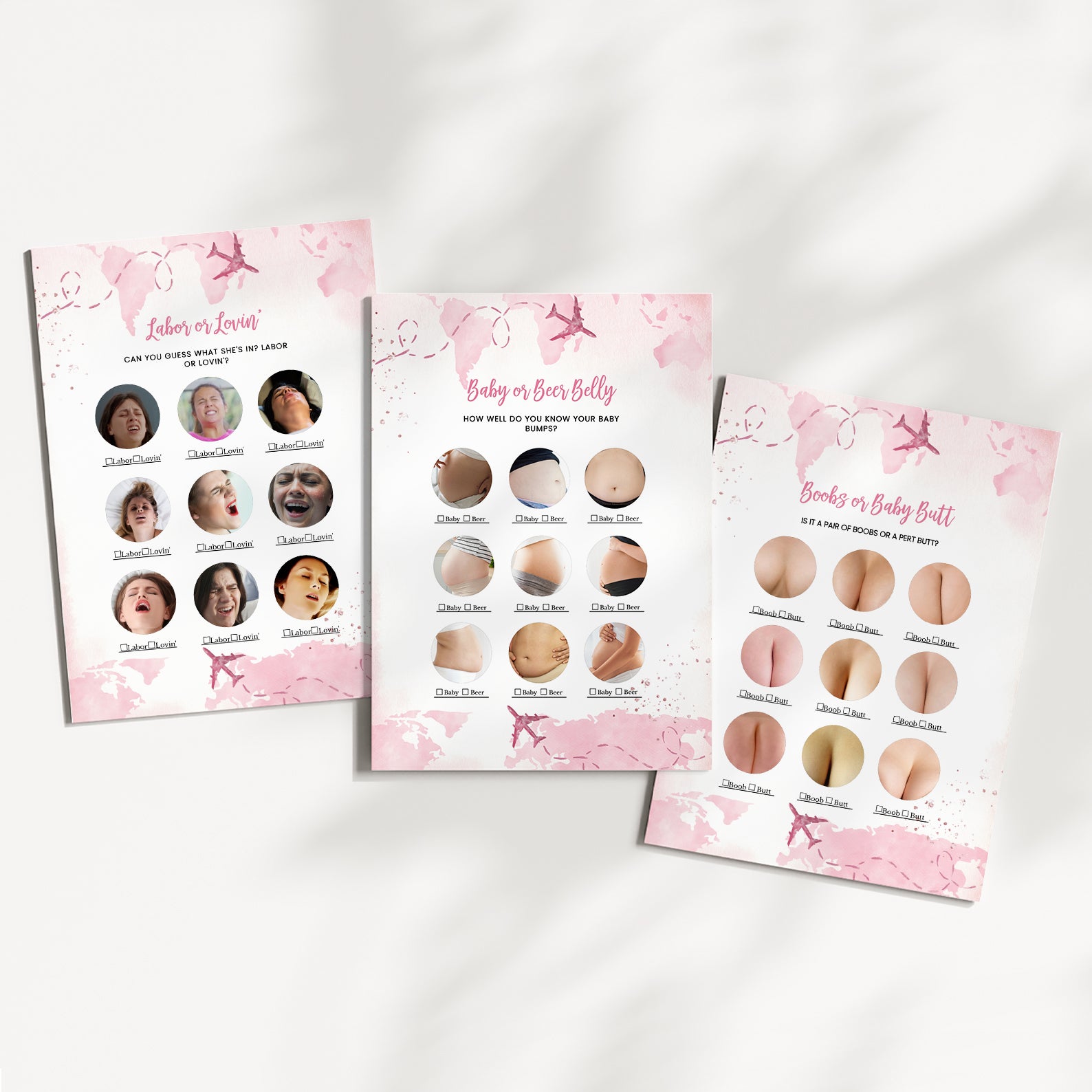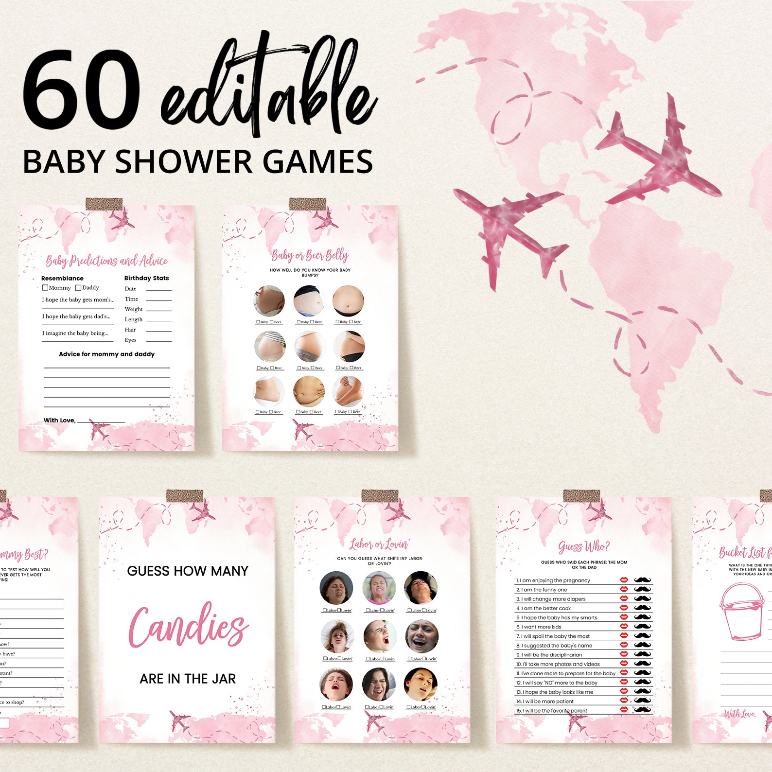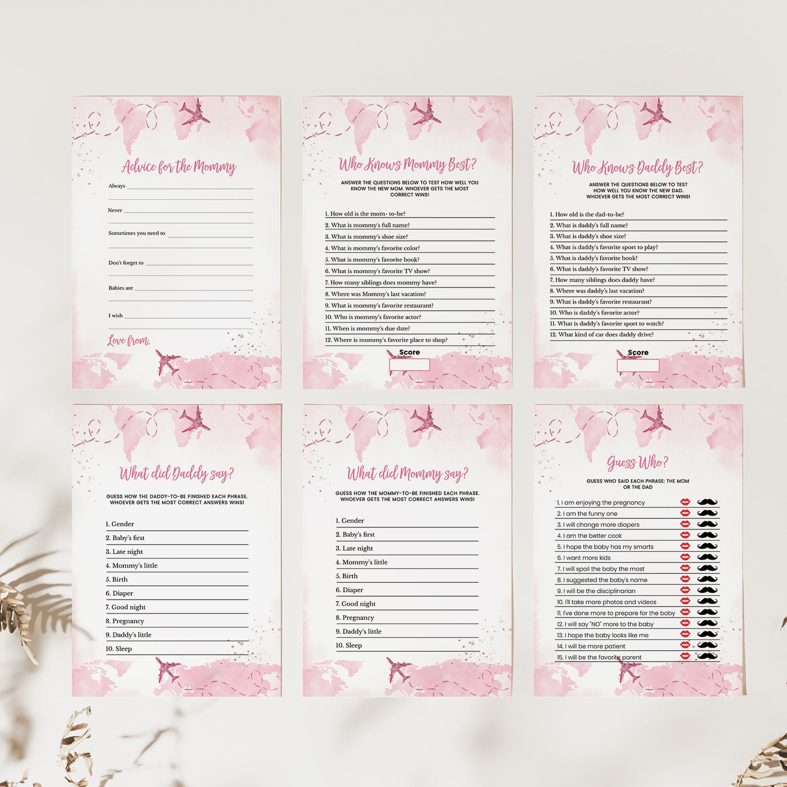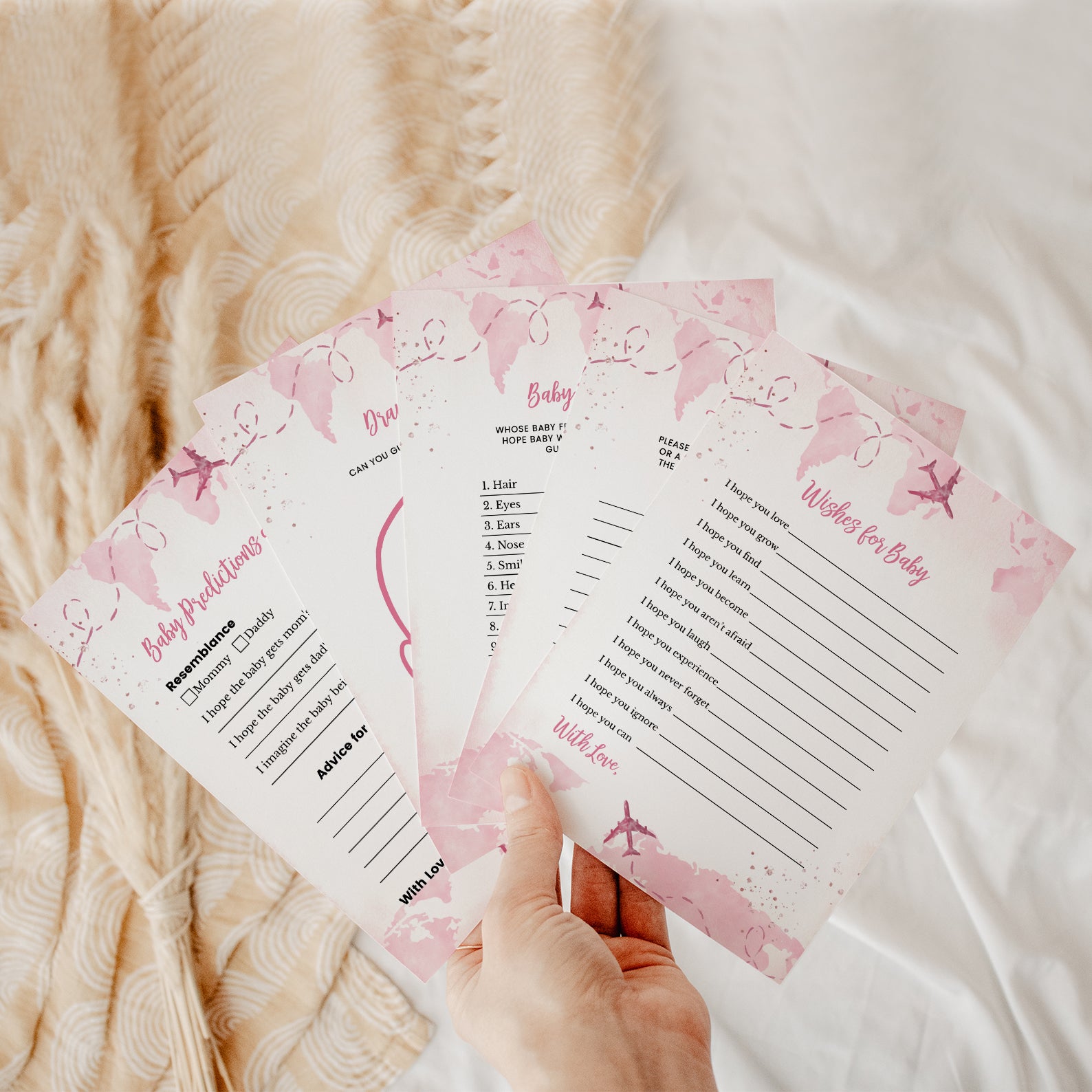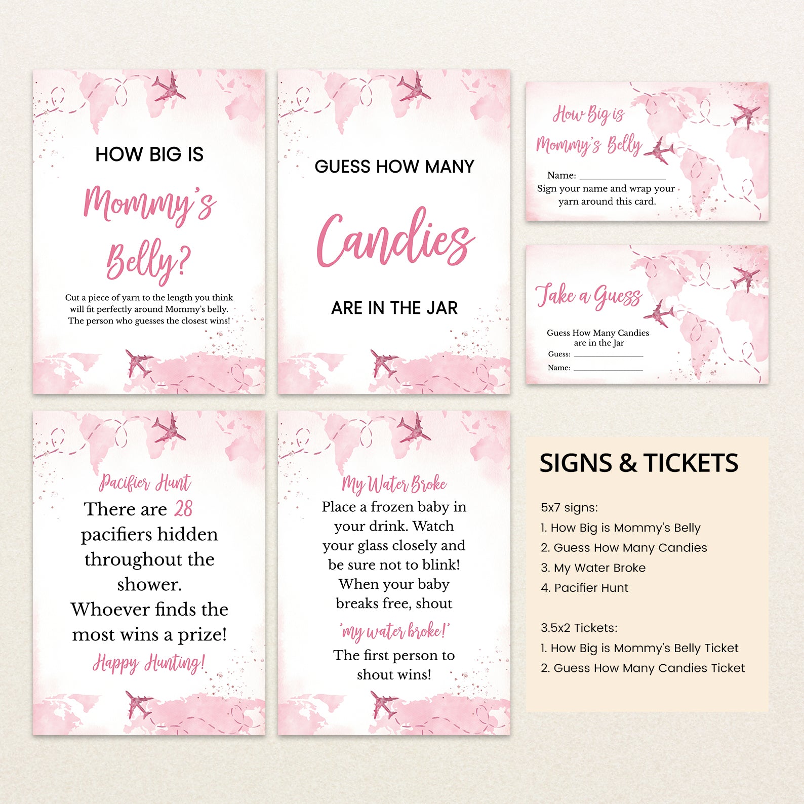 - Purchase this Adventure Awaits Baby Shower Digital Game Bundle: Pink Travel Theme template