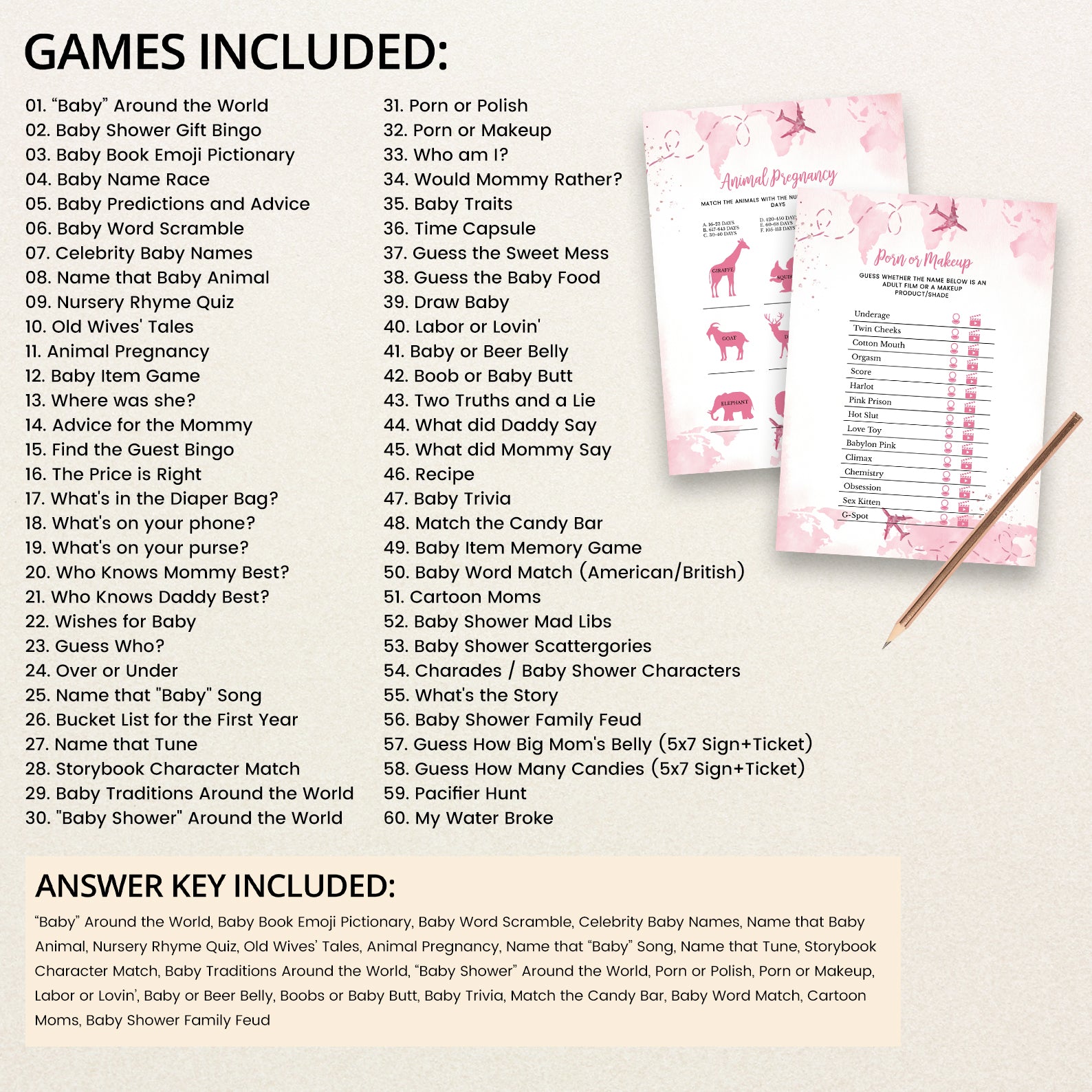 Adventure Awaits Baby Shower Digital Game Bundle: Pink Travel Theme