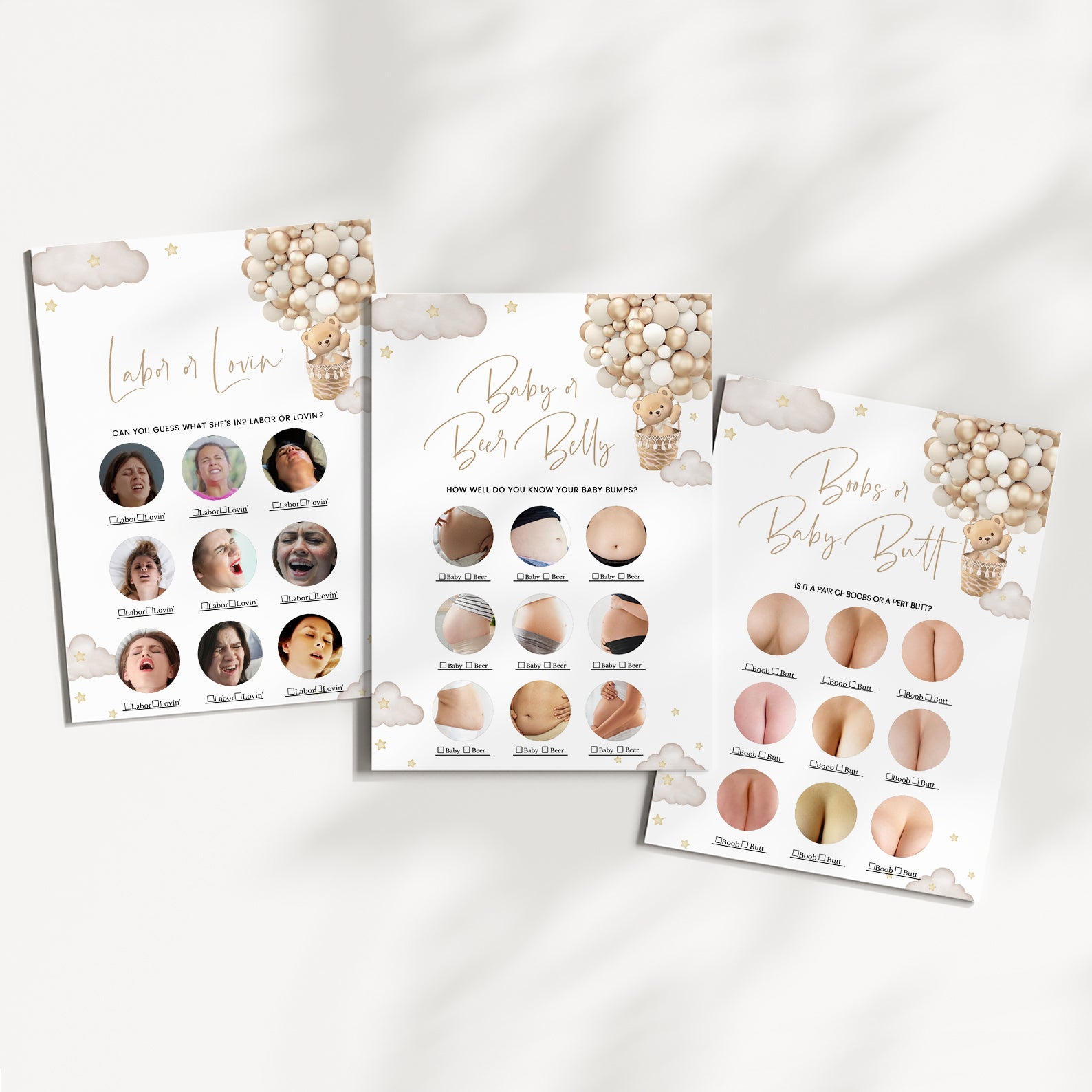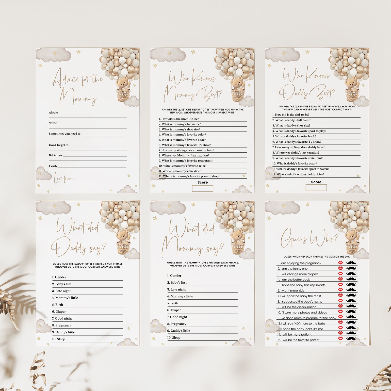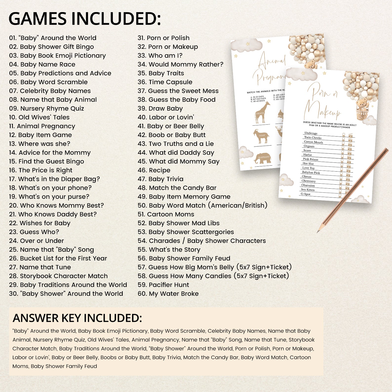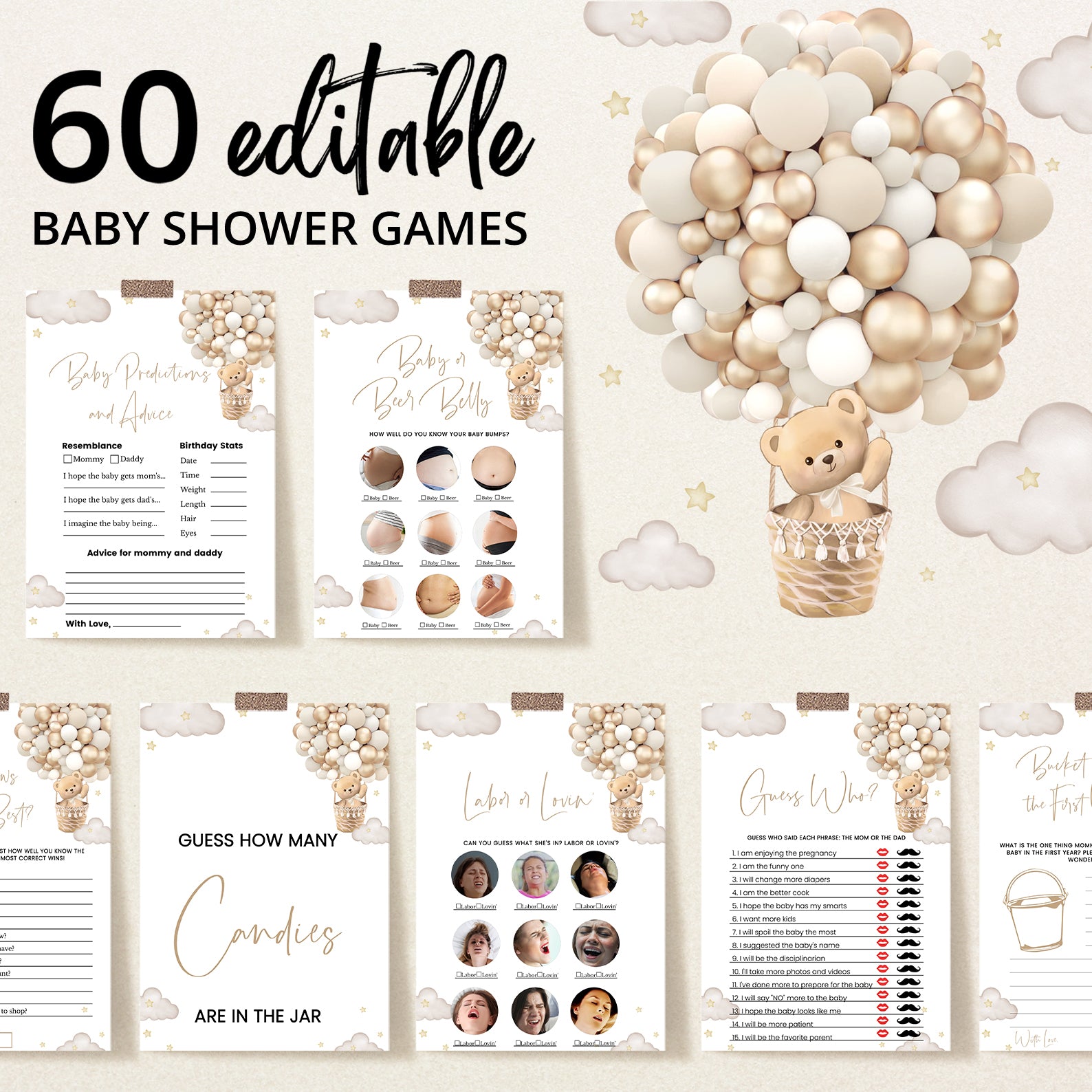 Celebrate your little one's upcoming arrival with our charming Oh Baby Baby Shower Game Bundle! Featuring a delightful brown-themed design, this bundle brings the magic of your invitation to life with 60 interactive games that will keep your guests entertained. From word searches to baby trivia, these fun-filled activities are perfect for creating lasting memories. The cute waving teddy bear, whimsical hot air balloons, and twinkling stars set a playful and joyful tone, making it the ideal choice for your baby shower celebration. Effortlessly customizable and easy to share, this bundle will add a unique and exciting touch to your special day!