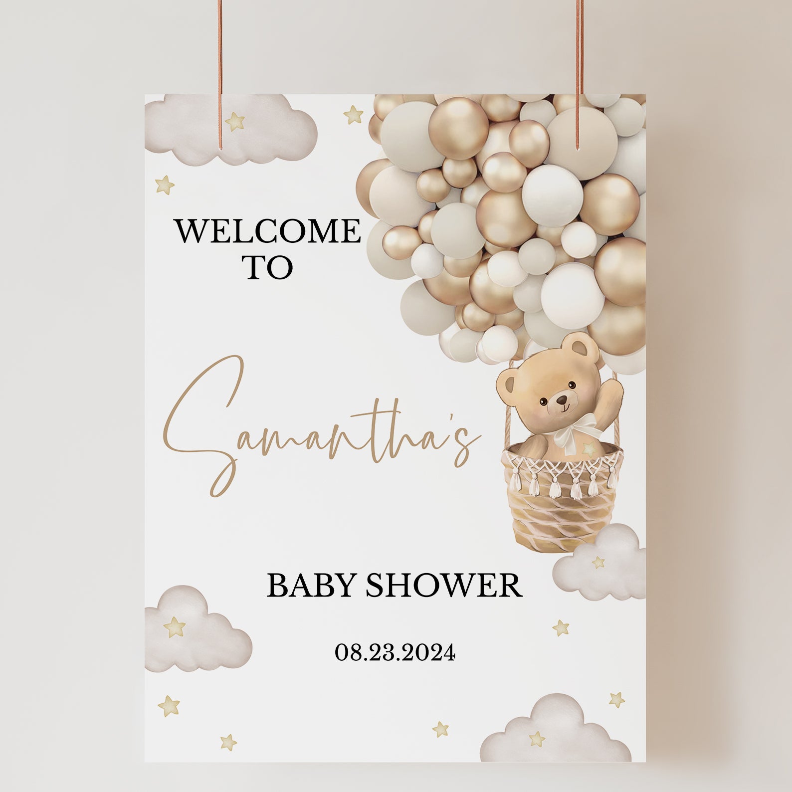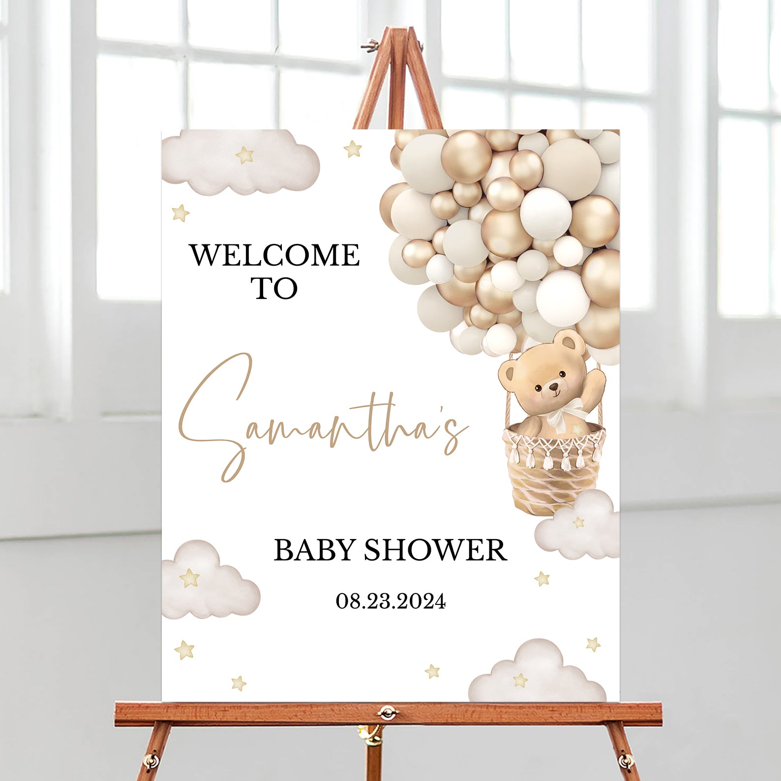 Welcome guests to your baby shower with this adorable "Oh Baby" welcome sign! Designed with a cute teddy bear sitting in a woven basket, floating among brown hot air balloons, soft clouds, and twinkling stars. A charming way to set the tone for your special celebration!