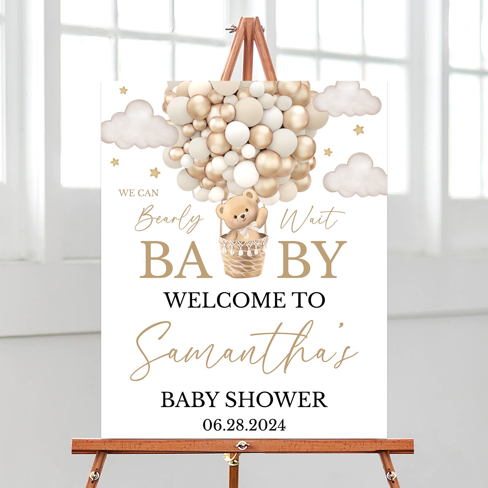 Greet your guests with our adorable "We Can Bearly Wait" baby shower welcome sign! Featuring a sweet teddy bear in a hot air balloon with brown balloons, clouds, and stars, it's perfect for setting the tone at your cozy, brown-themed celebration. Easy to edit and print for a warm, inviting touch!