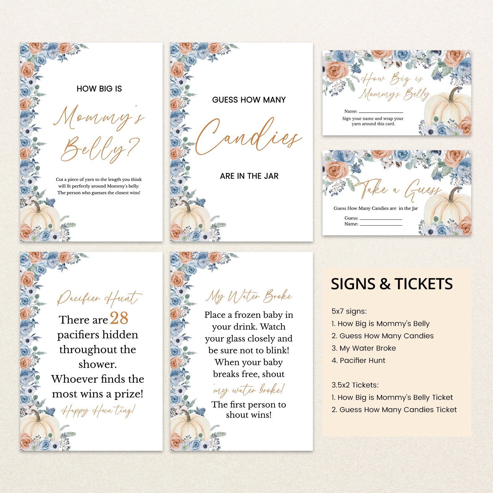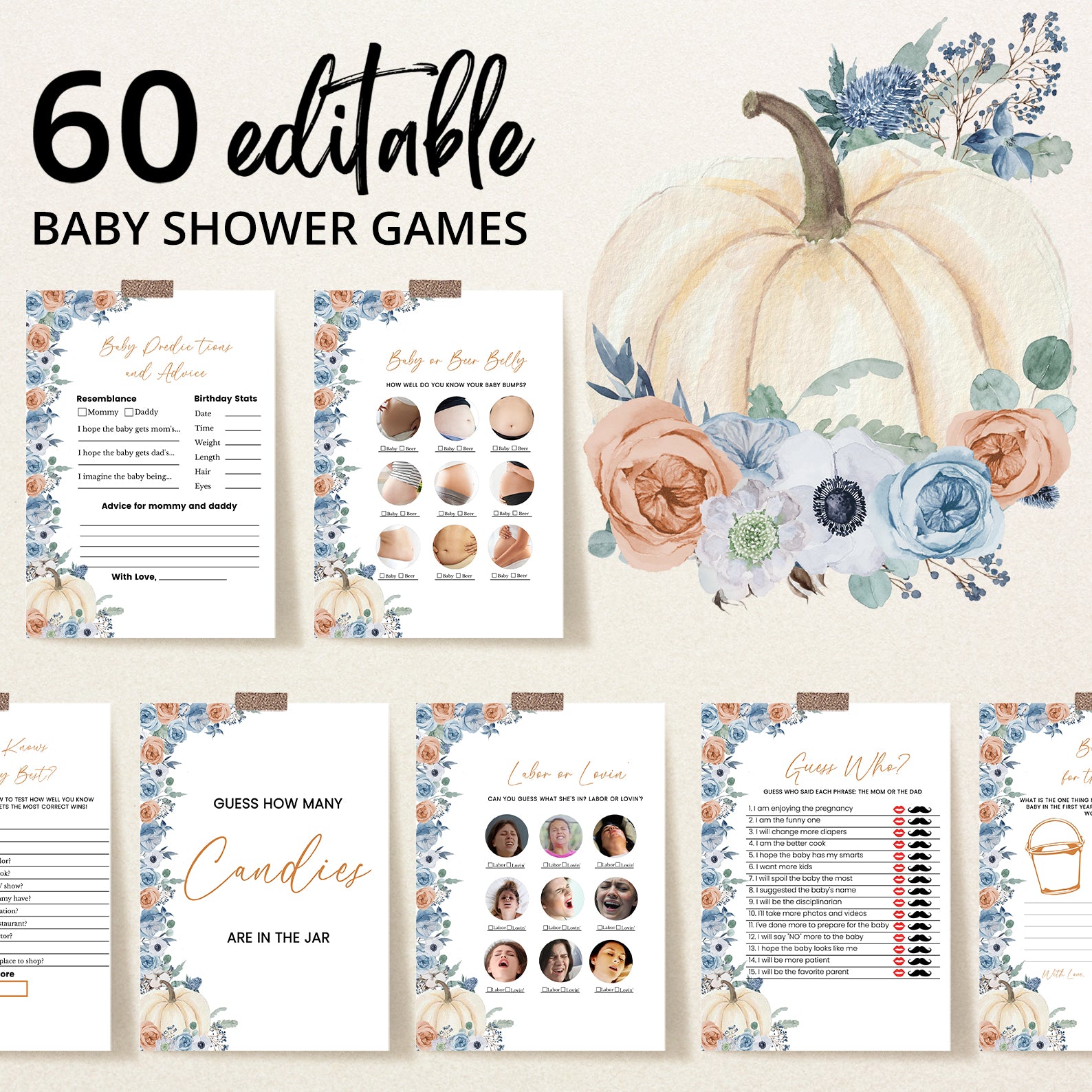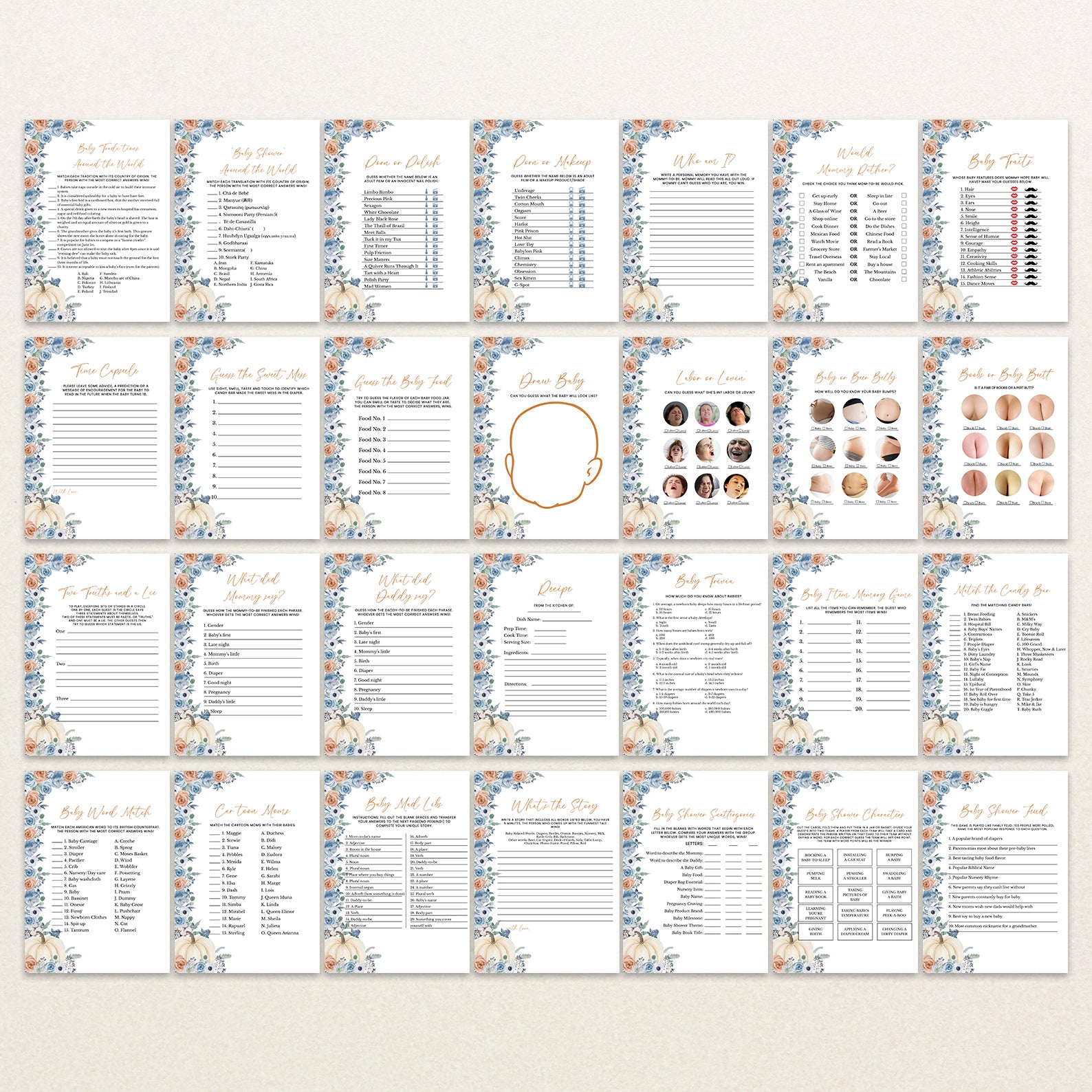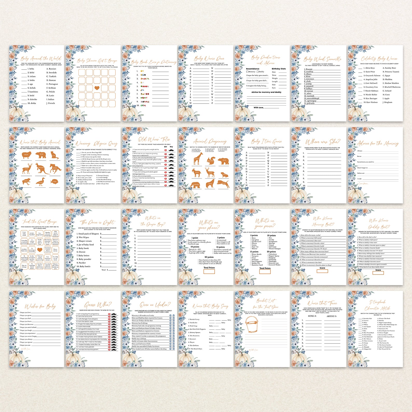 Bring the fun with this 60-game editable bundle, perfect for an autumn baby shower. Each printable features fall-inspired illustrations, including charming pumpkins, delicate blue and orange roses, and soft watercolor accents. From trivia to guessing games, guests will love these engaging activities that match your cozy, seasonal theme. Ideal for keeping everyone entertained while celebrating your little one.