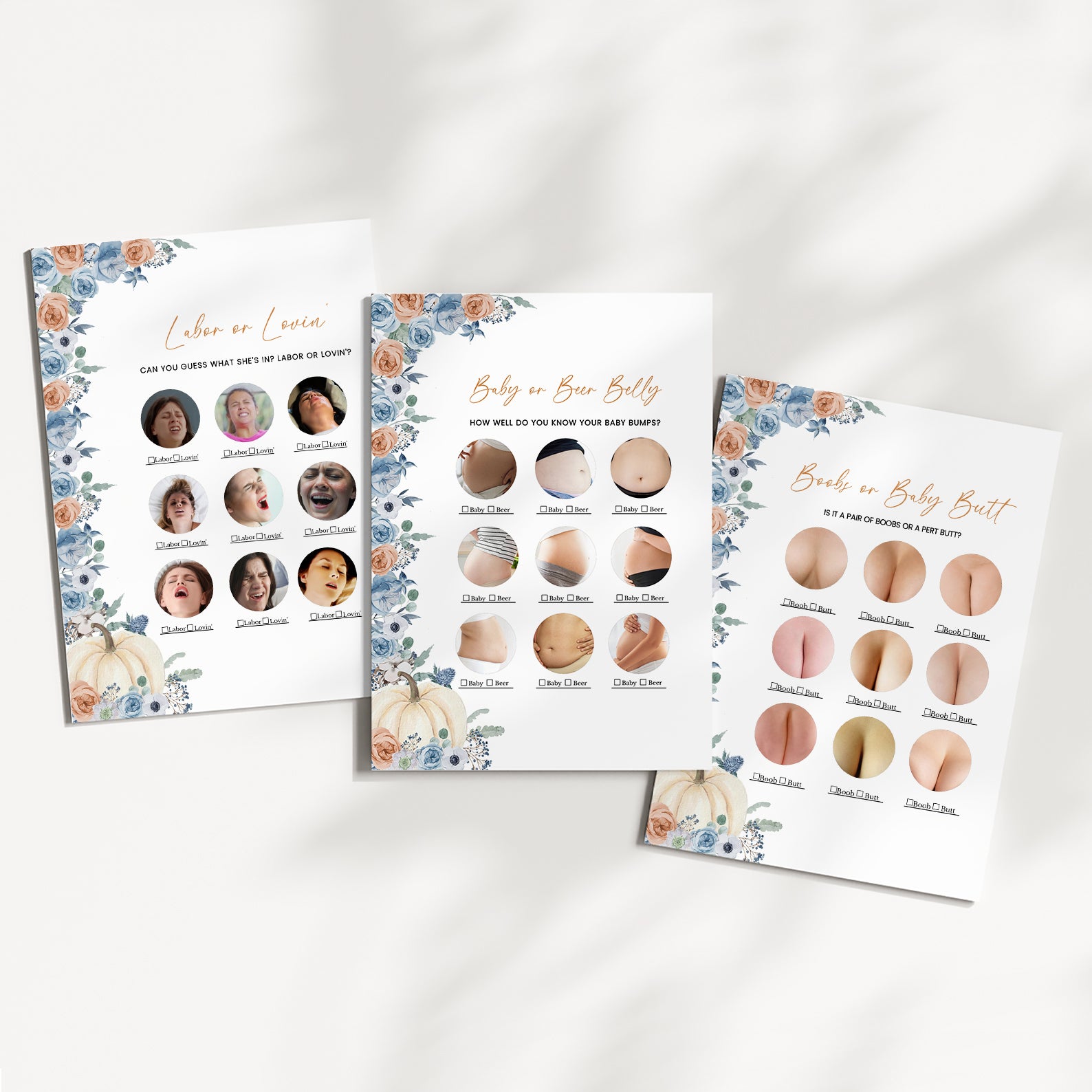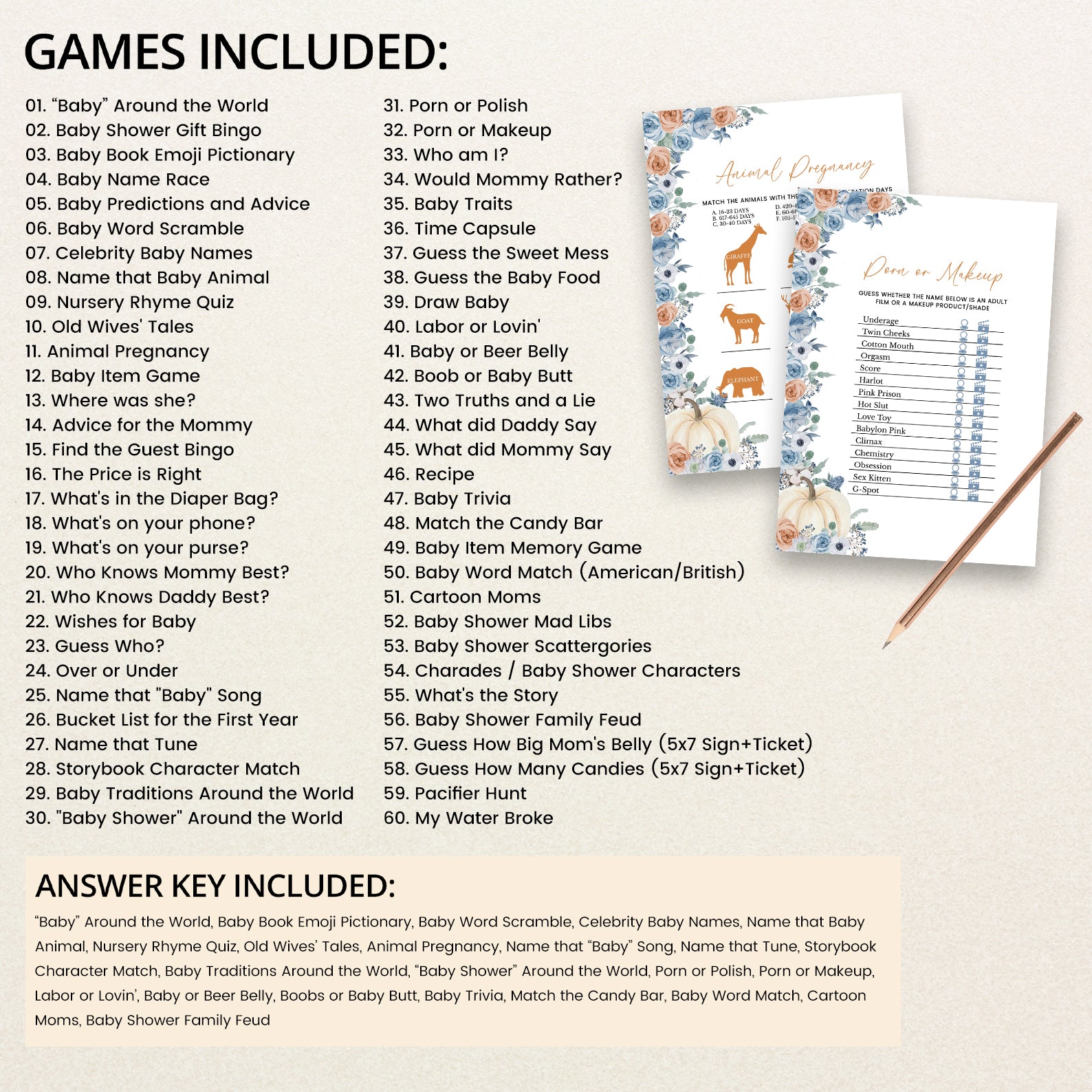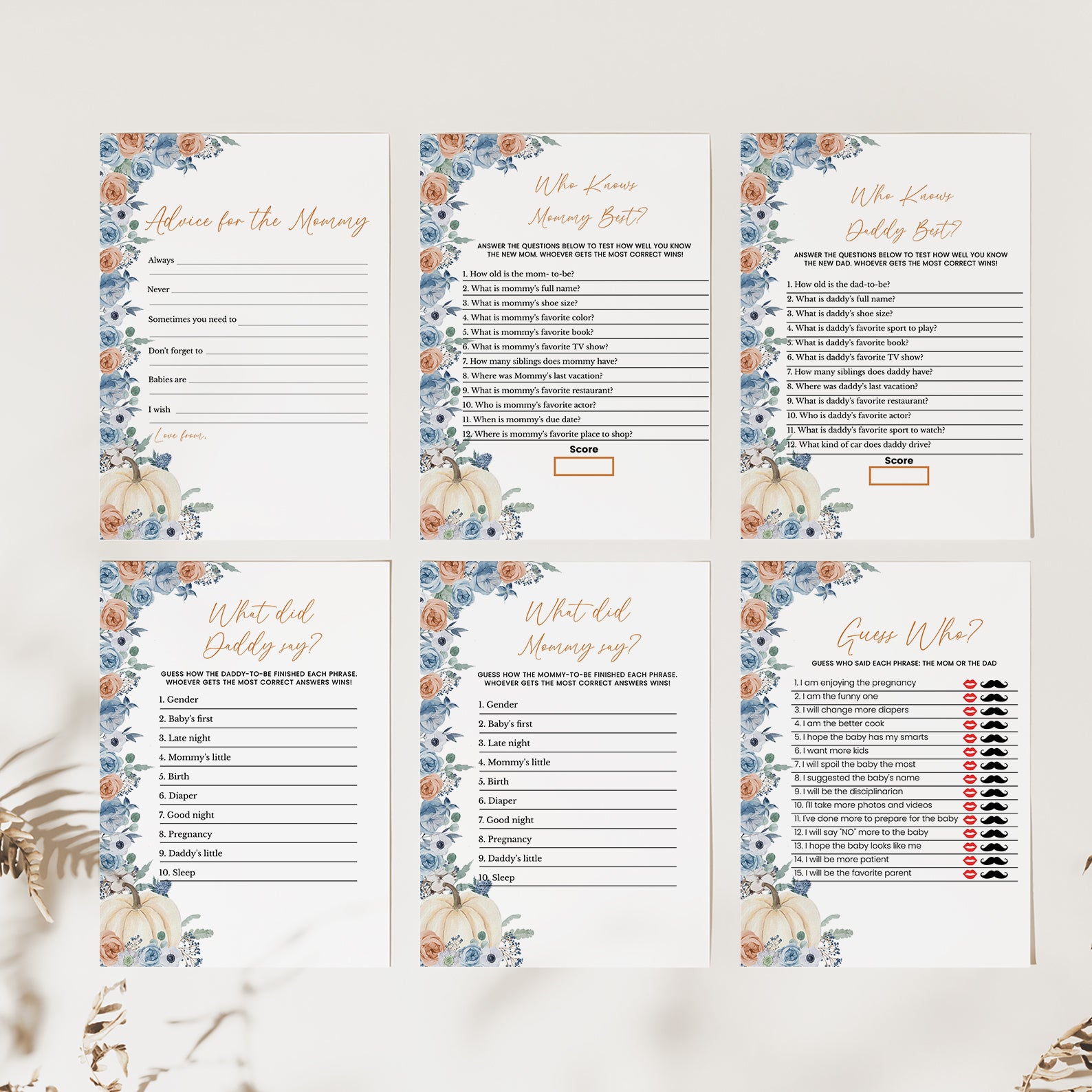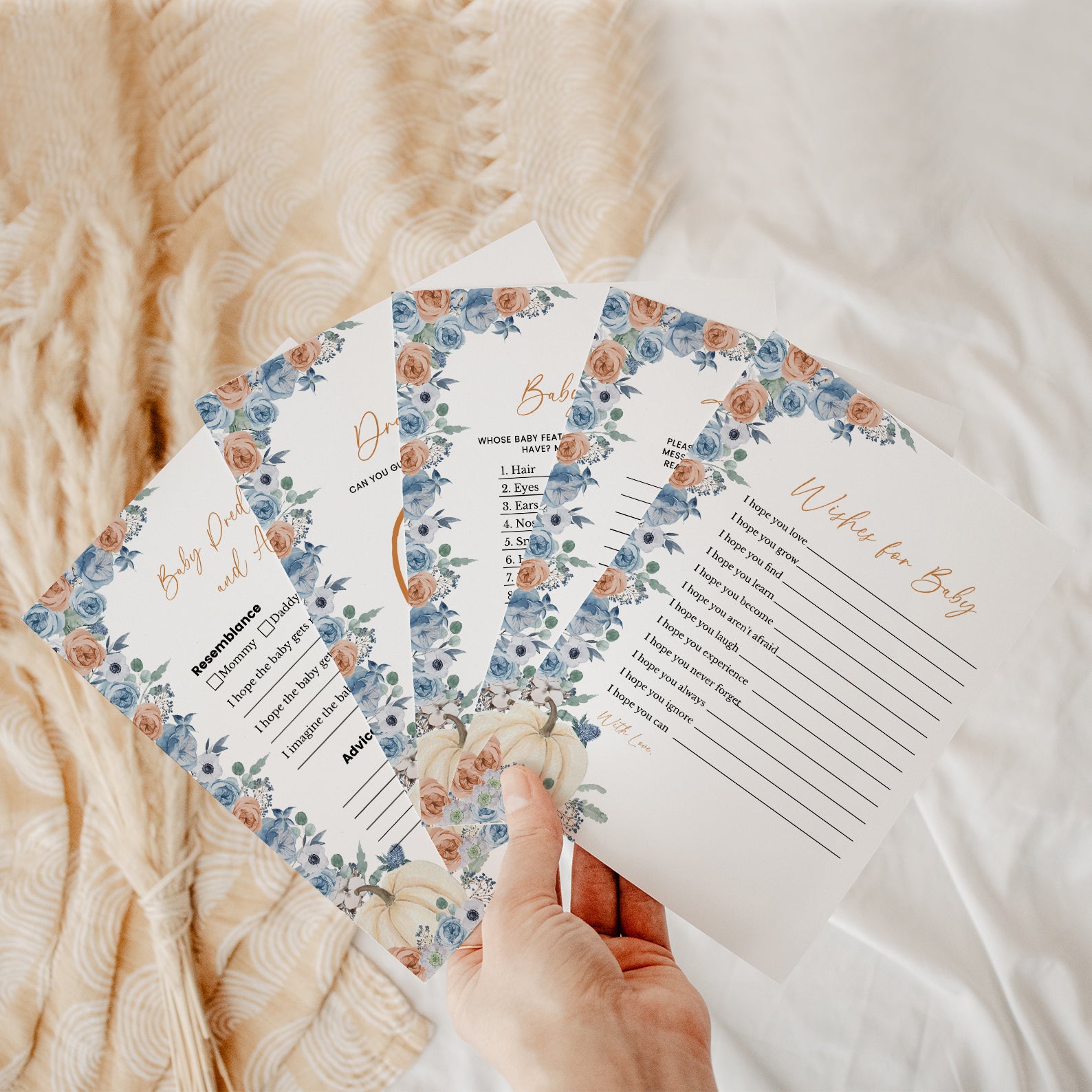 Bring the fun with this 60-game editable bundle, perfect for an autumn baby shower. Each printable features fall-inspired illustrations, including charming pumpkins, delicate blue and orange roses, and soft watercolor accents. From trivia to guessing games, guests will love these engaging activities that match your cozy, seasonal theme. Ideal for keeping everyone entertained while celebrating your little one.