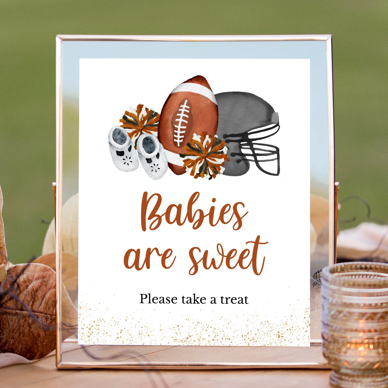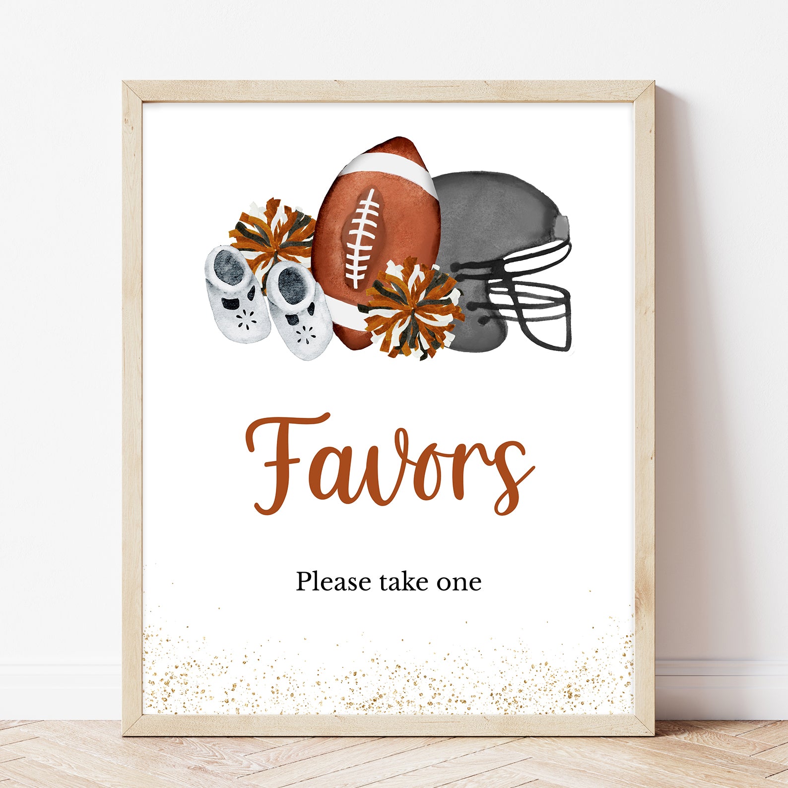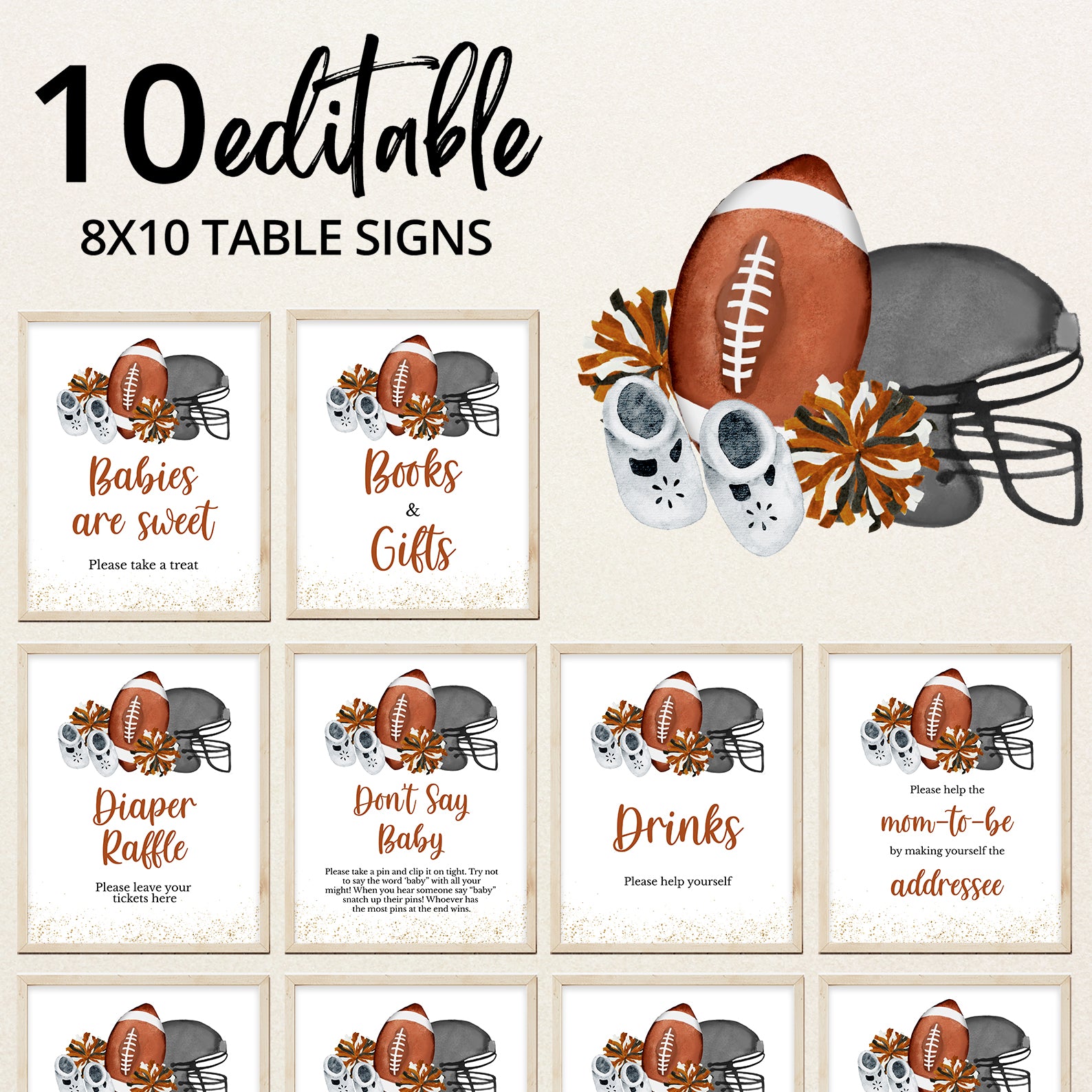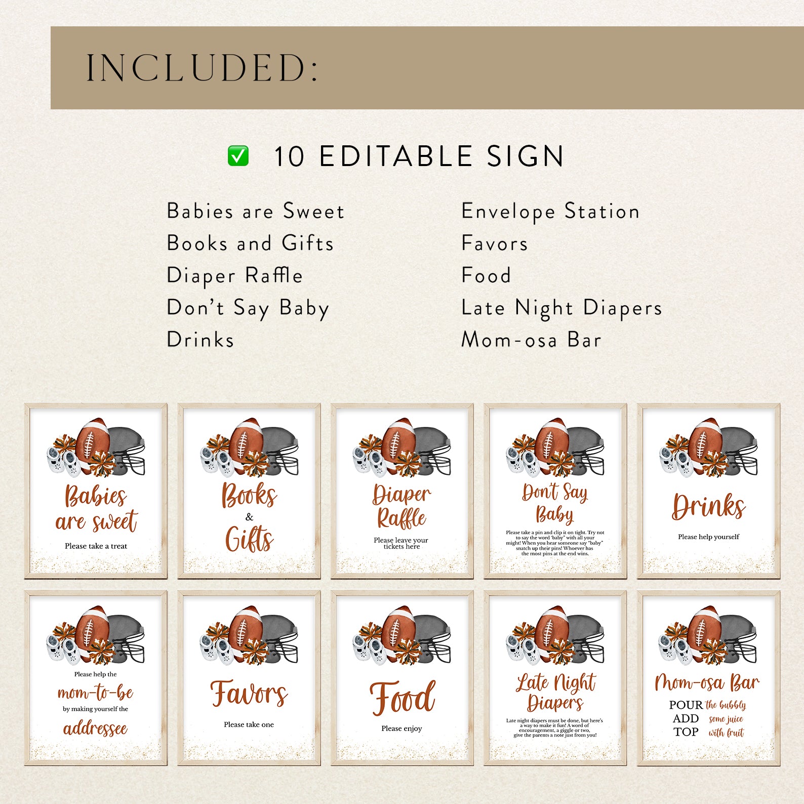 Score big with our football-themed baby shower table signs! This set includes ten editable signs like Babies Are Sweet, Drinks, Favors, Mom-osa Bar, and more. Each sign features playful touchdown elements mini footballs, goal posts, and warm autumn tones adding sporty charm to your celebration. Perfectly coordinated and easy to edit, these signs guide guests and enhance your event’s festive, game-day vibe.