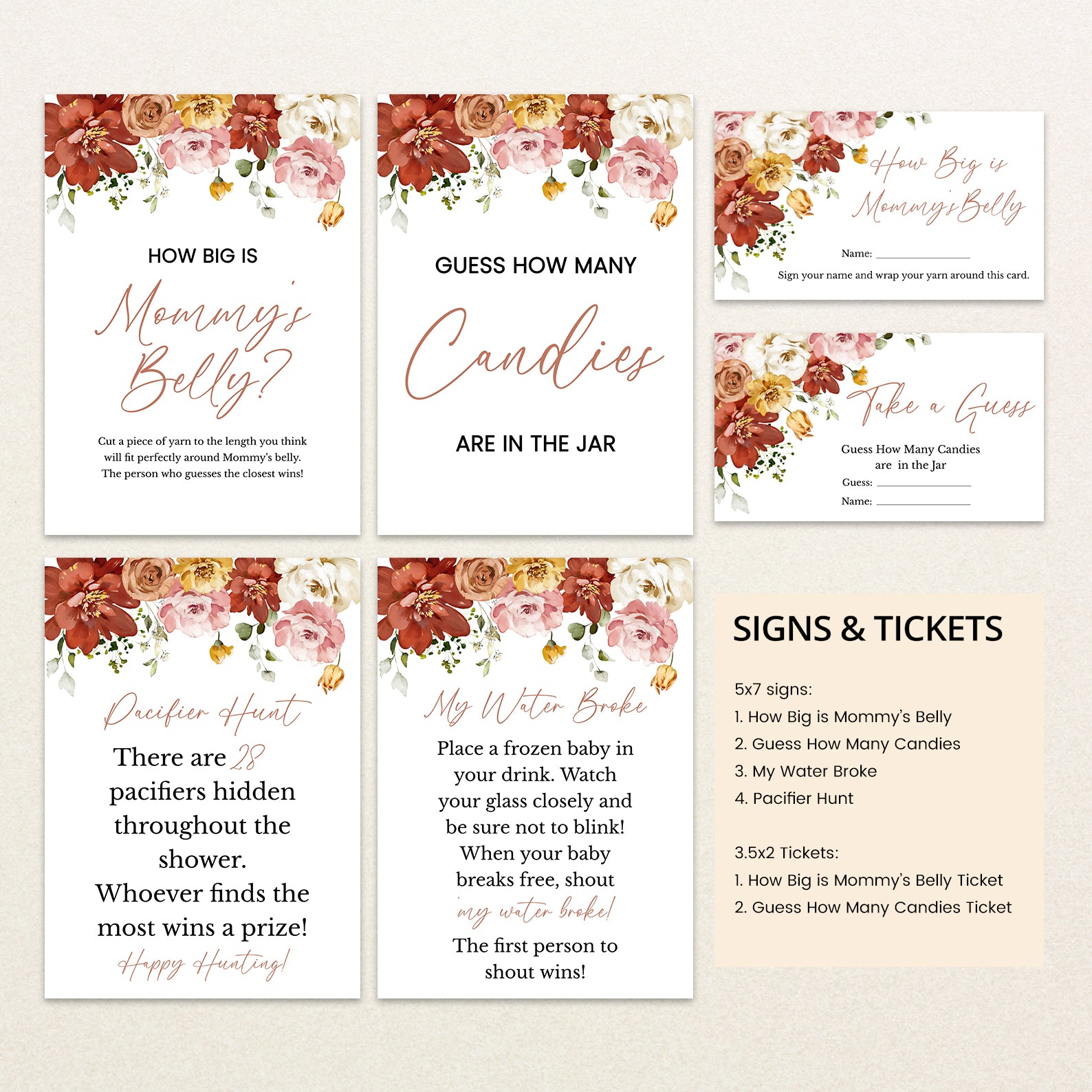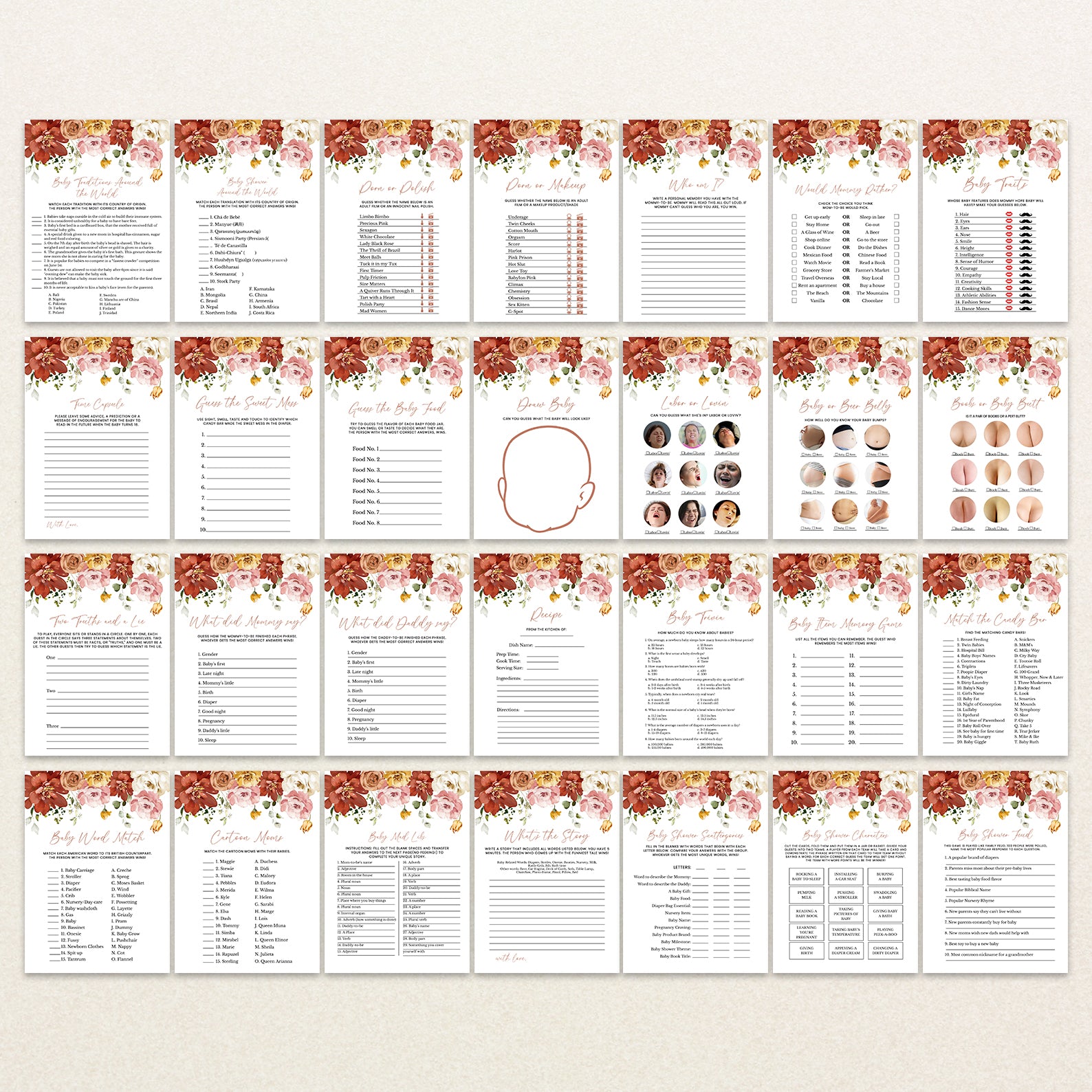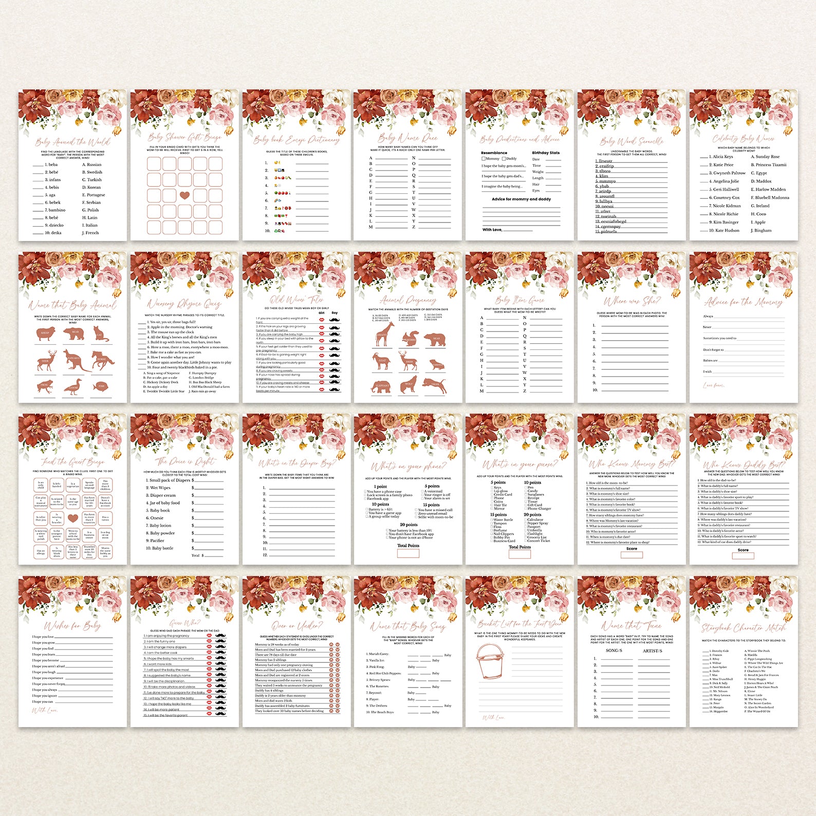 Keep guests entertained with this fall-themed bundle of 60 editable baby shower games, each adorned with floral watercolor details and soft autumn greenery. From classics like Baby Bingo and Word Scramble to fun icebreakers, these games are easy to customize and print. Whether you're hosting a large gathering or an intimate event, this collection adds interactive charm to your seasonal baby shower.