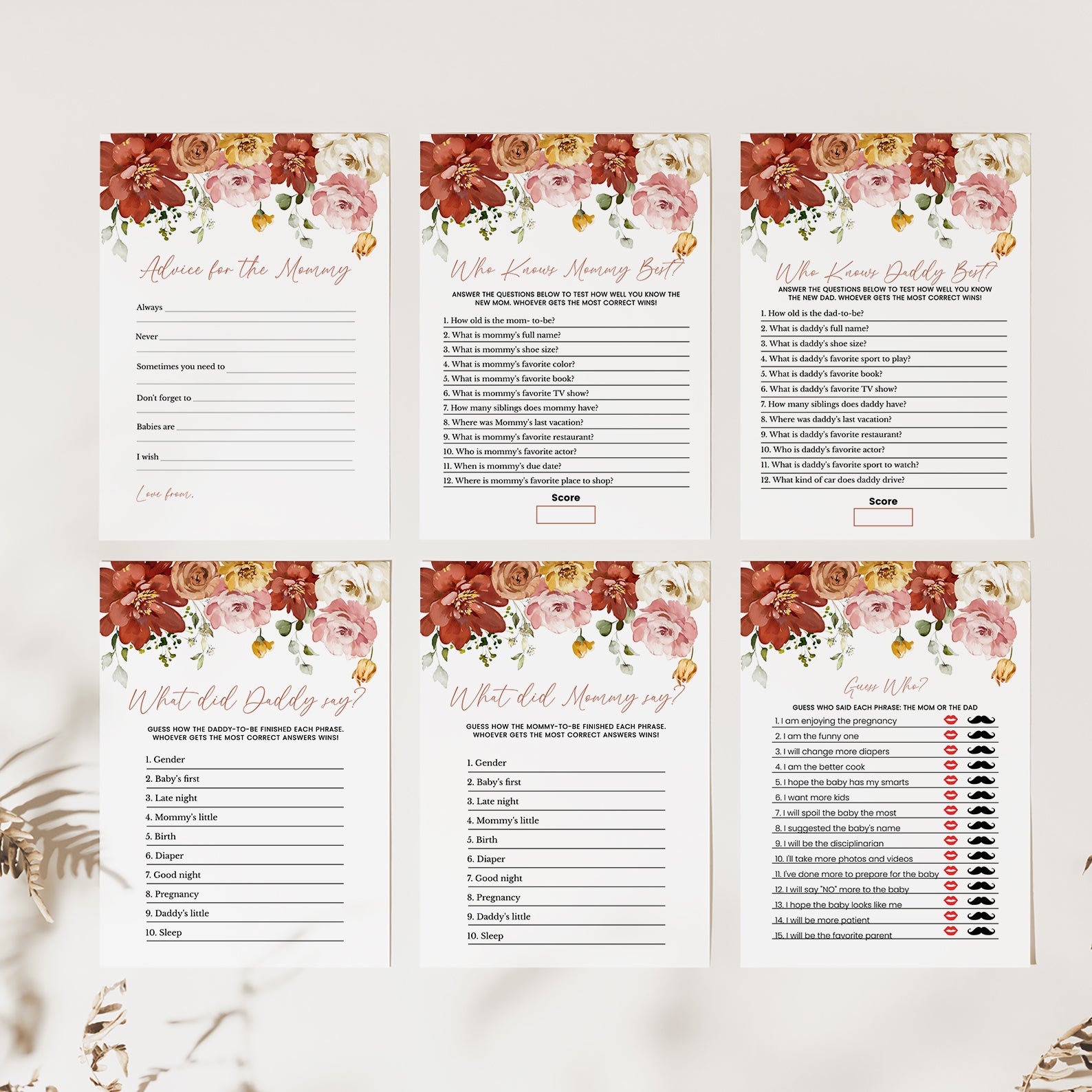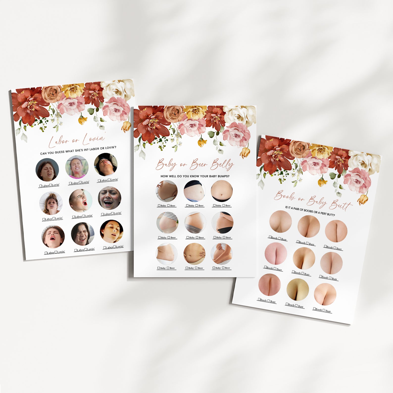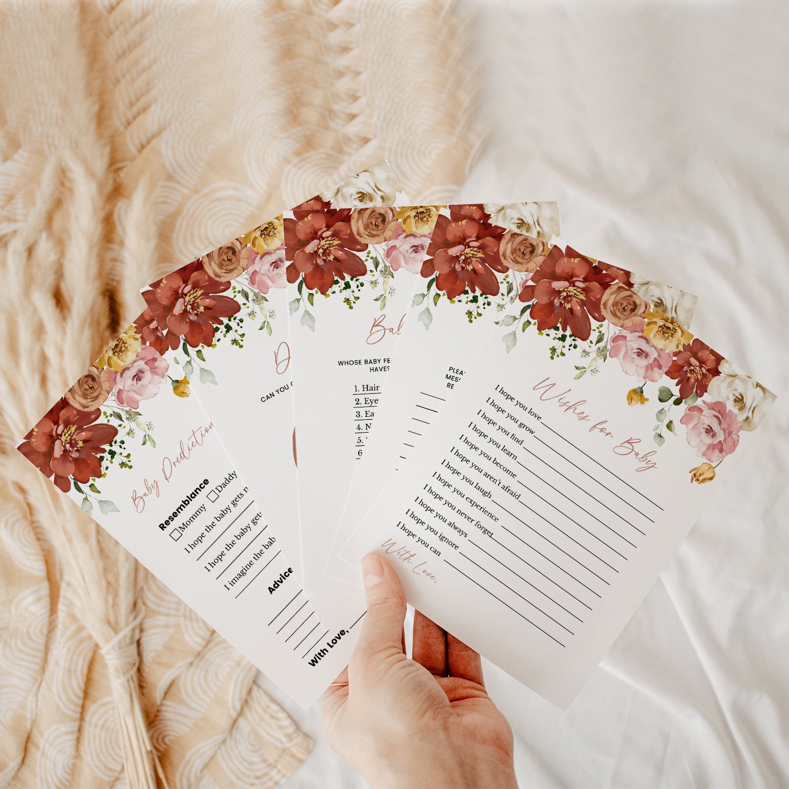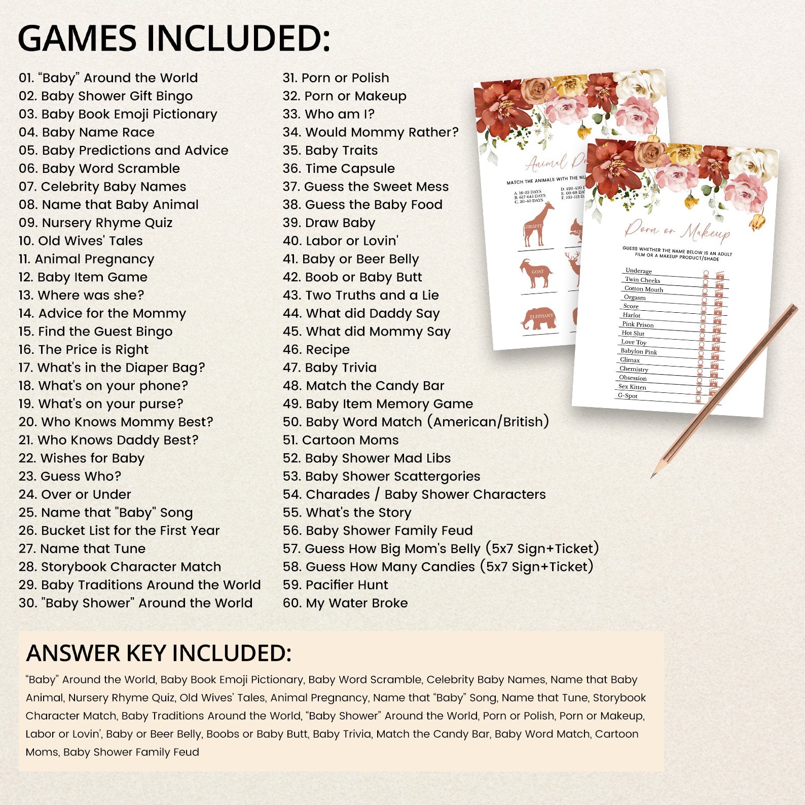 Keep guests entertained with this fall-themed bundle of 60 editable baby shower games, each adorned with floral watercolor details and soft autumn greenery. From classics like Baby Bingo and Word Scramble to fun icebreakers, these games are easy to customize and print. Whether you're hosting a large gathering or an intimate event, this collection adds interactive charm to your seasonal baby shower.