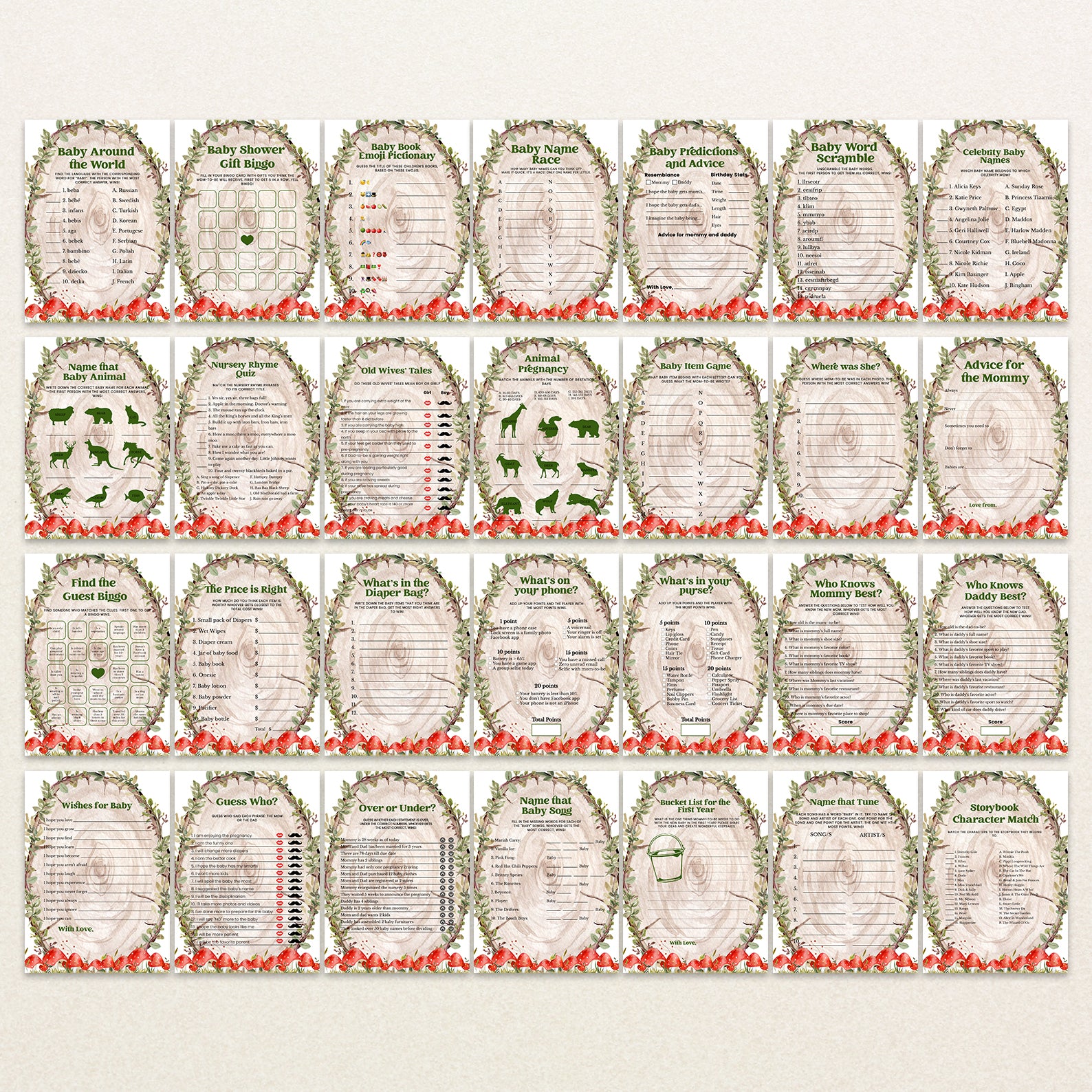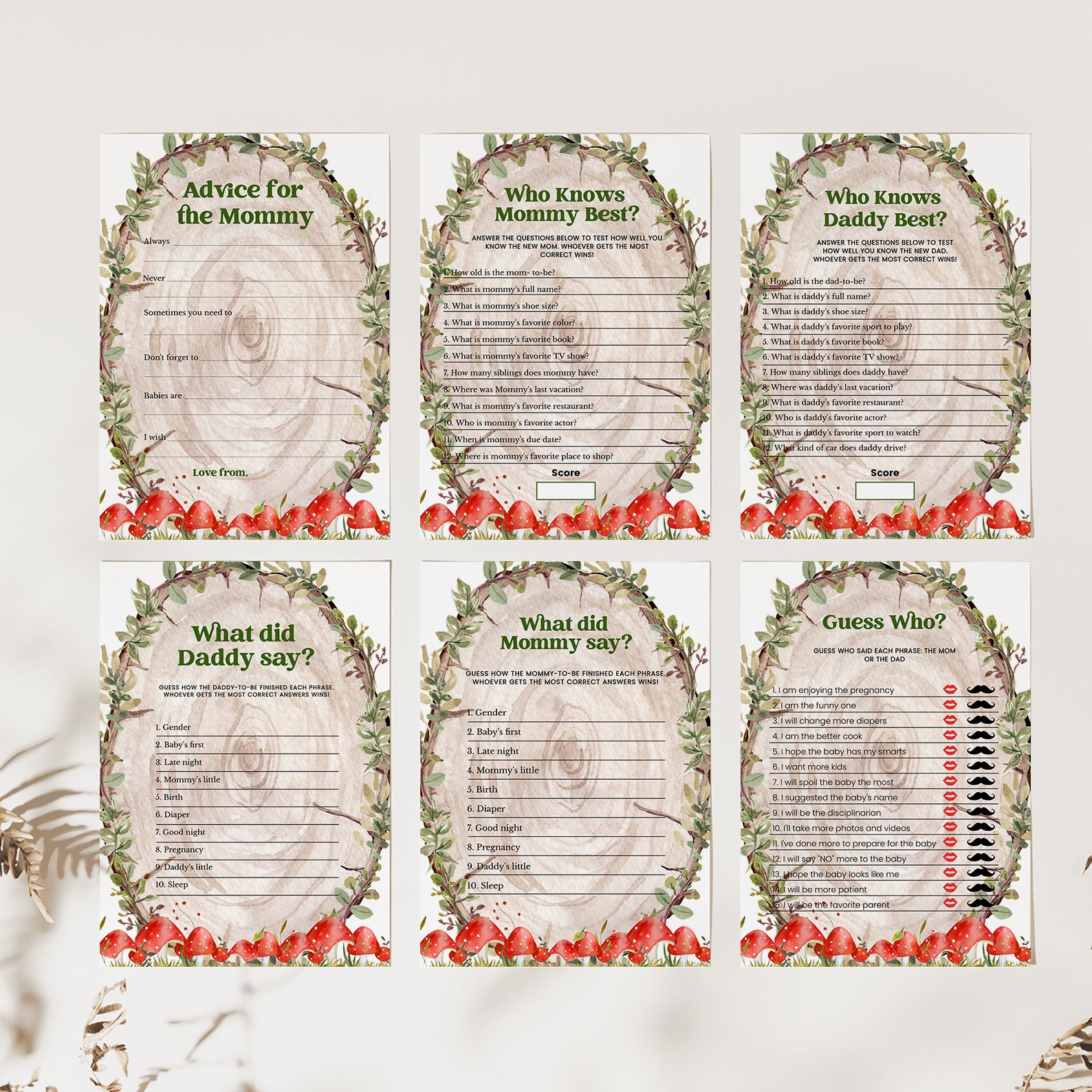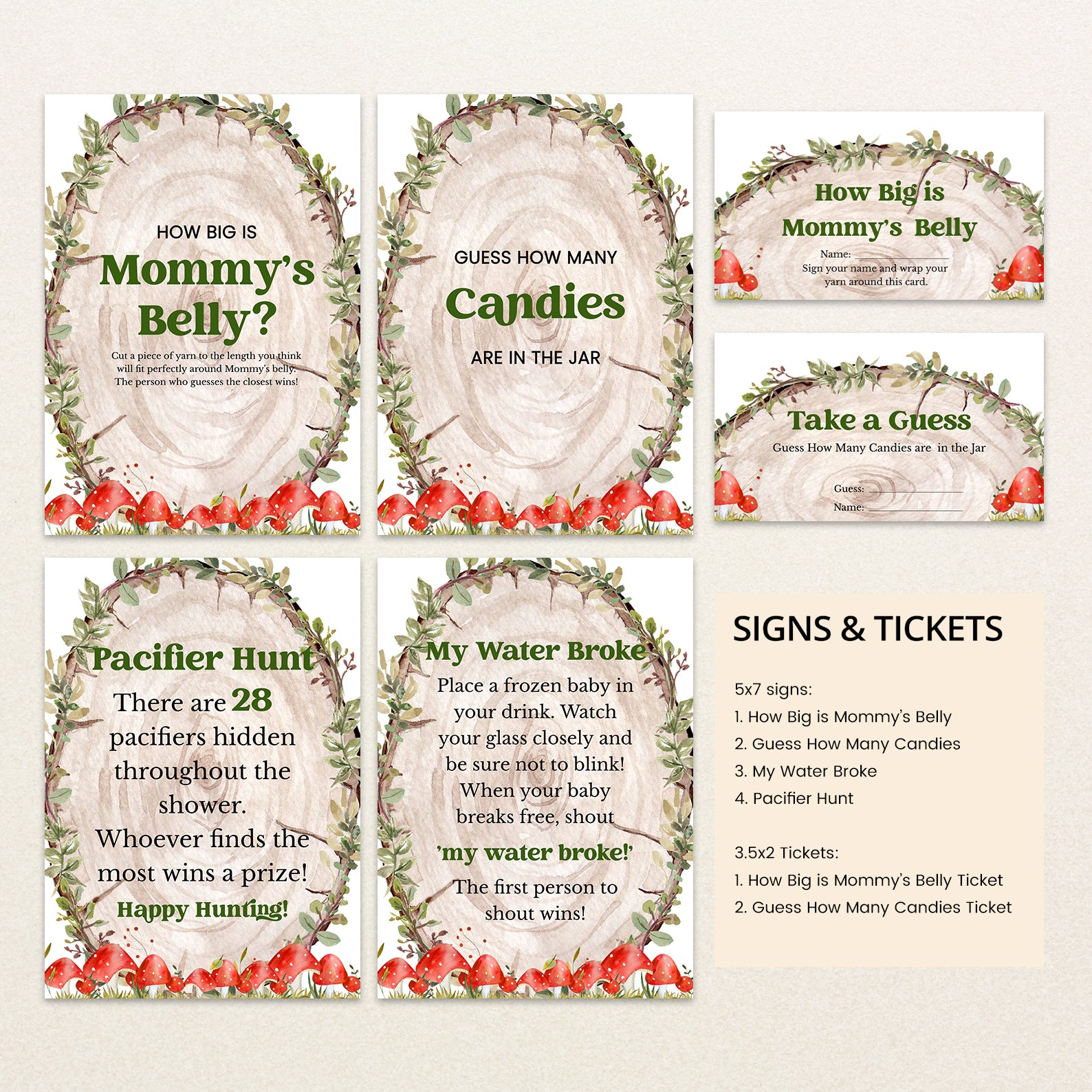 - Purchase this Rustic Log Slice Fall Baby Shower Game Bundle with Mushrooms template