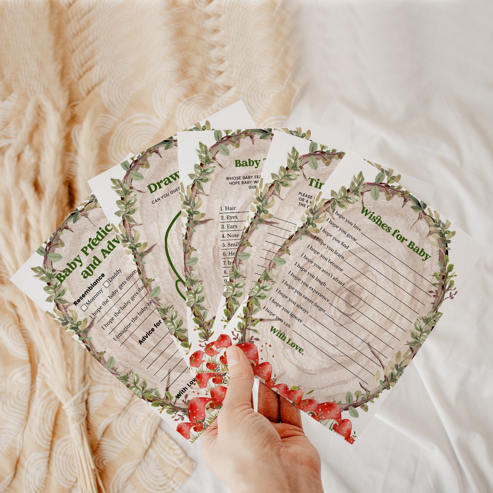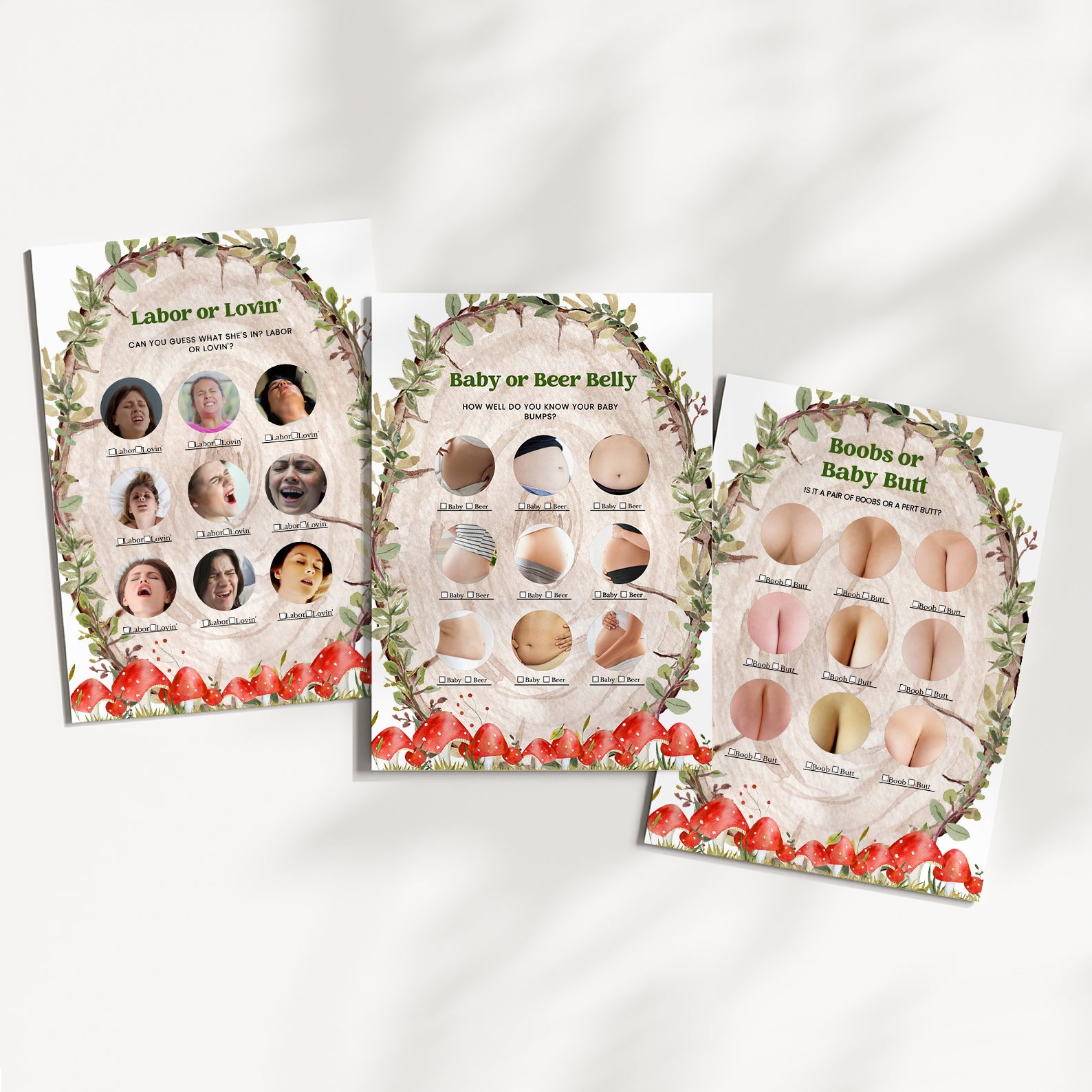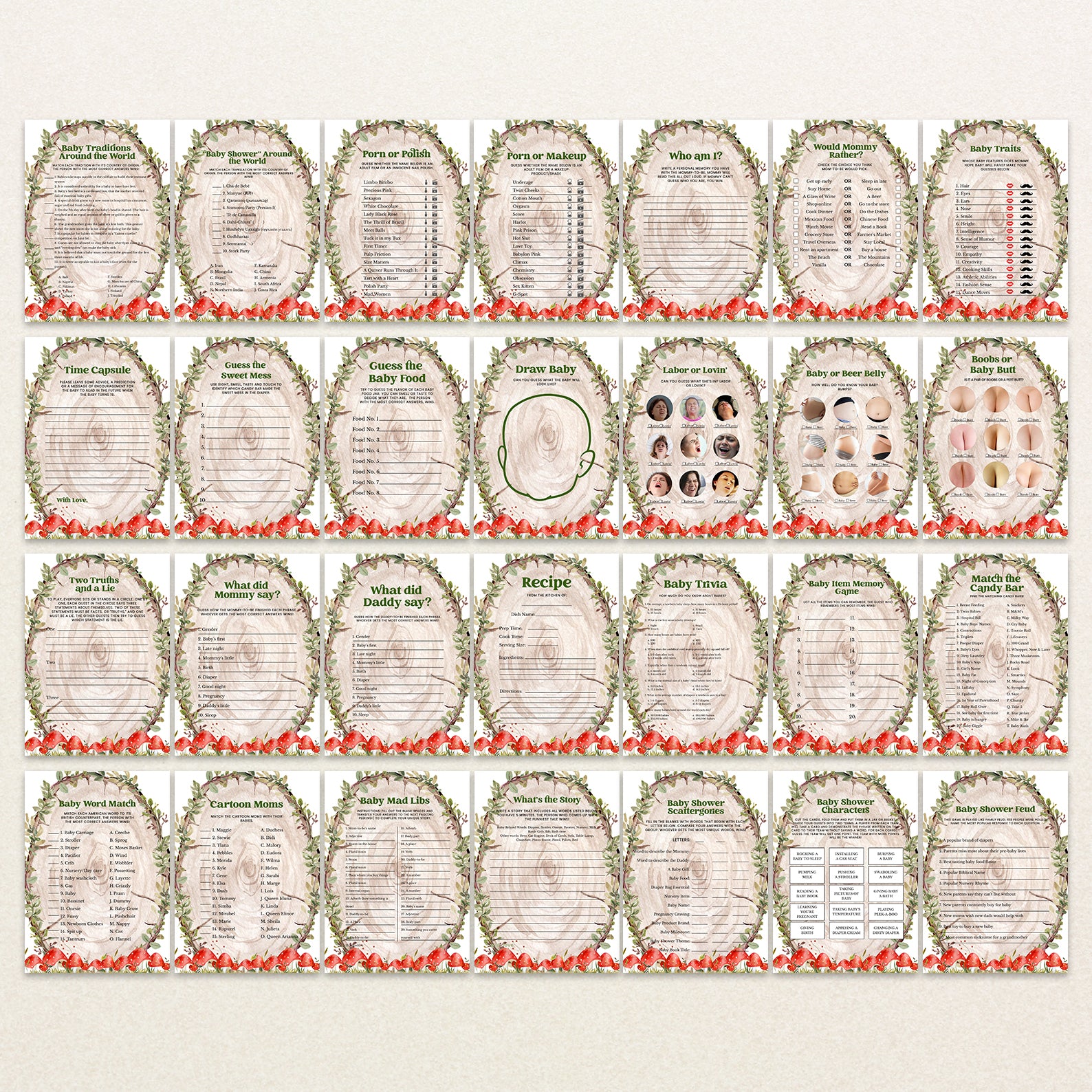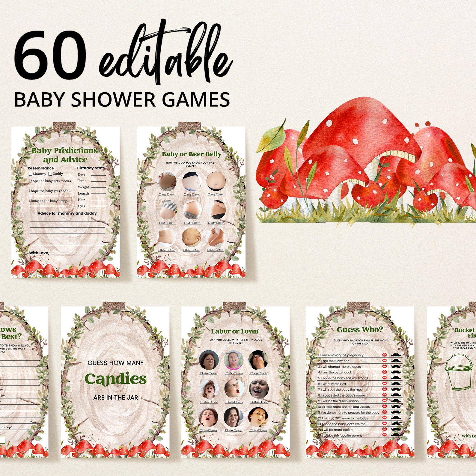 - Purchase this Rustic Log Slice Fall Baby Shower Game Bundle with Mushrooms template