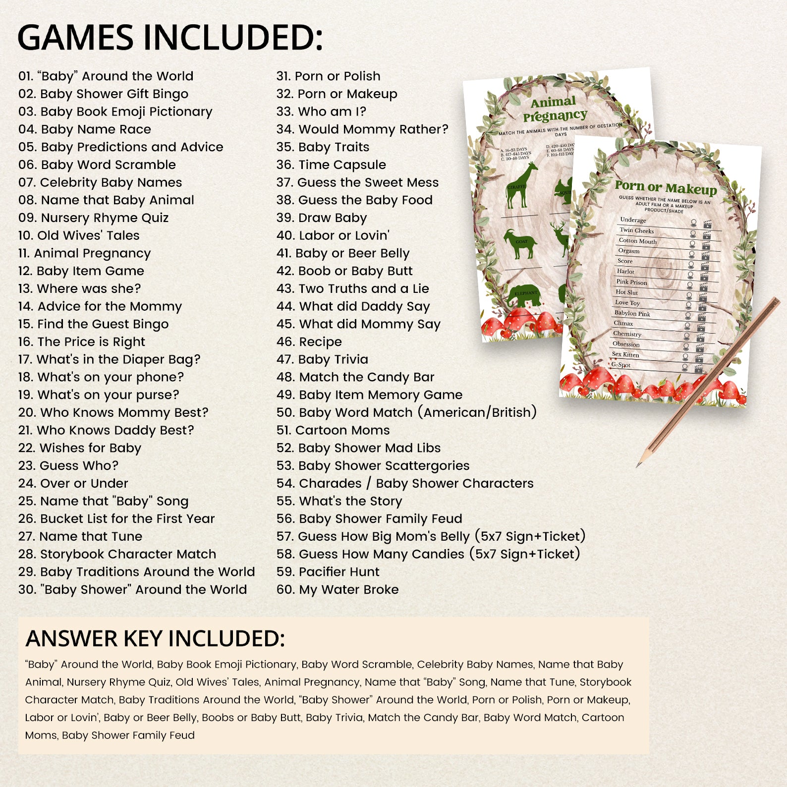 Make your baby shower extra fun with our editable game bundle featuring 60 entertaining and beautifully designed activities! Inspired by the cozy charm of fall, each game includes warm autumn elements like playful red mushrooms, rustic wood textures, and forest leaves. With a wide variety of interactive options from word scrambles to trivia this bundle is fully customizable, making it easy to match your theme and keep guests laughing, bonding, and engaged throughout your celebration.