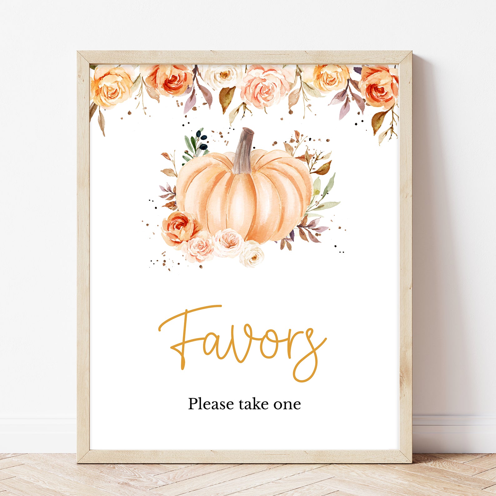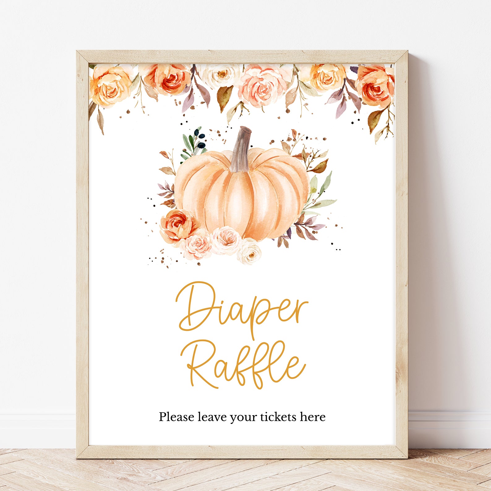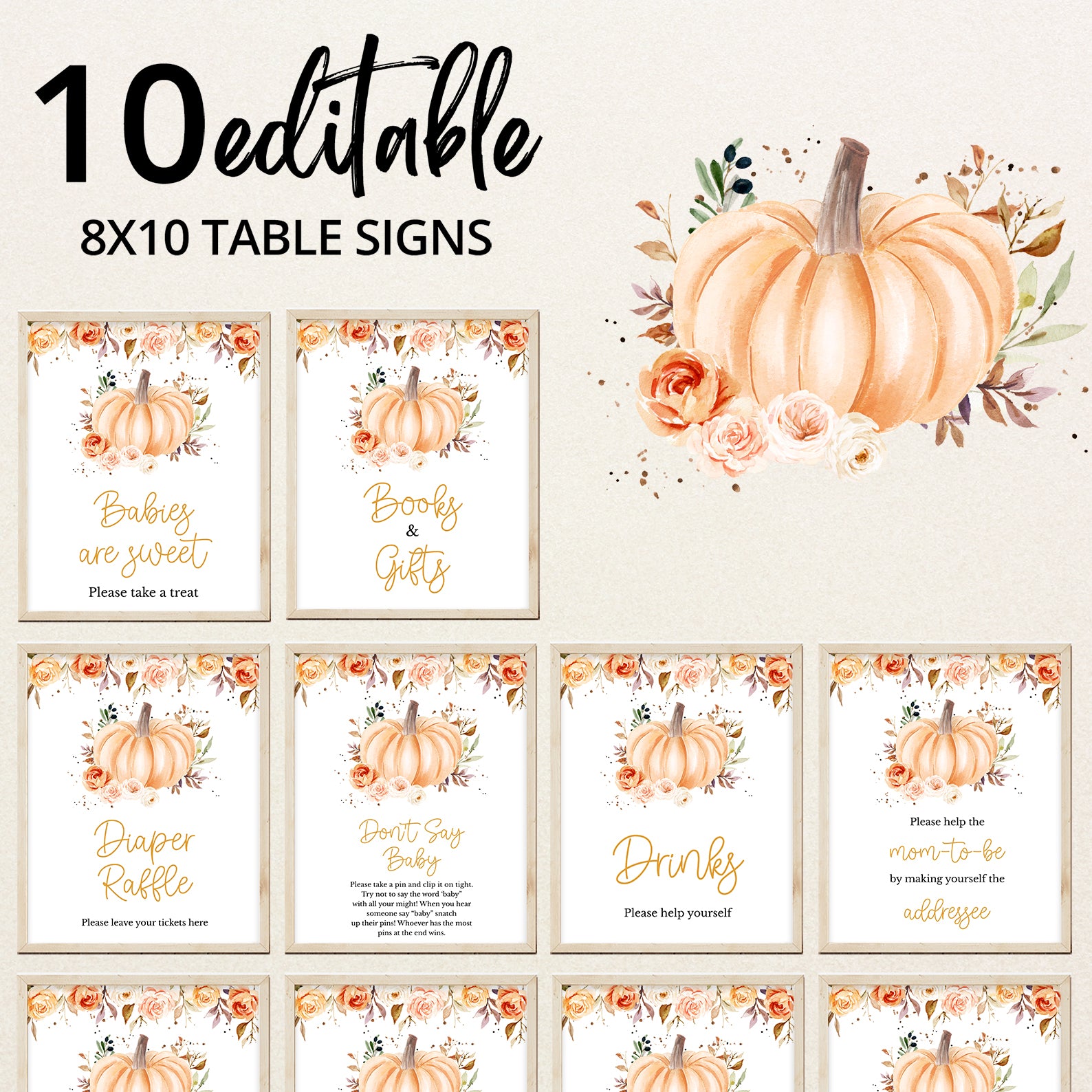 Add a cozy autumn touch to your celebration with this set of ten editable baby shower table signs. Each sign features soft watercolor florals in rich orange hues, paired with delicate fall leaves and a sweet baby pumpkin illustration. Designed to match your seasonal theme, this charming set includes signs for Babies Are Sweet, Books and Gifts, Diaper Raffle, Don't Say Baby, Drinks, Envelope Station, Favors, Food, Late Night Diapers, and Mom-osa Bar.