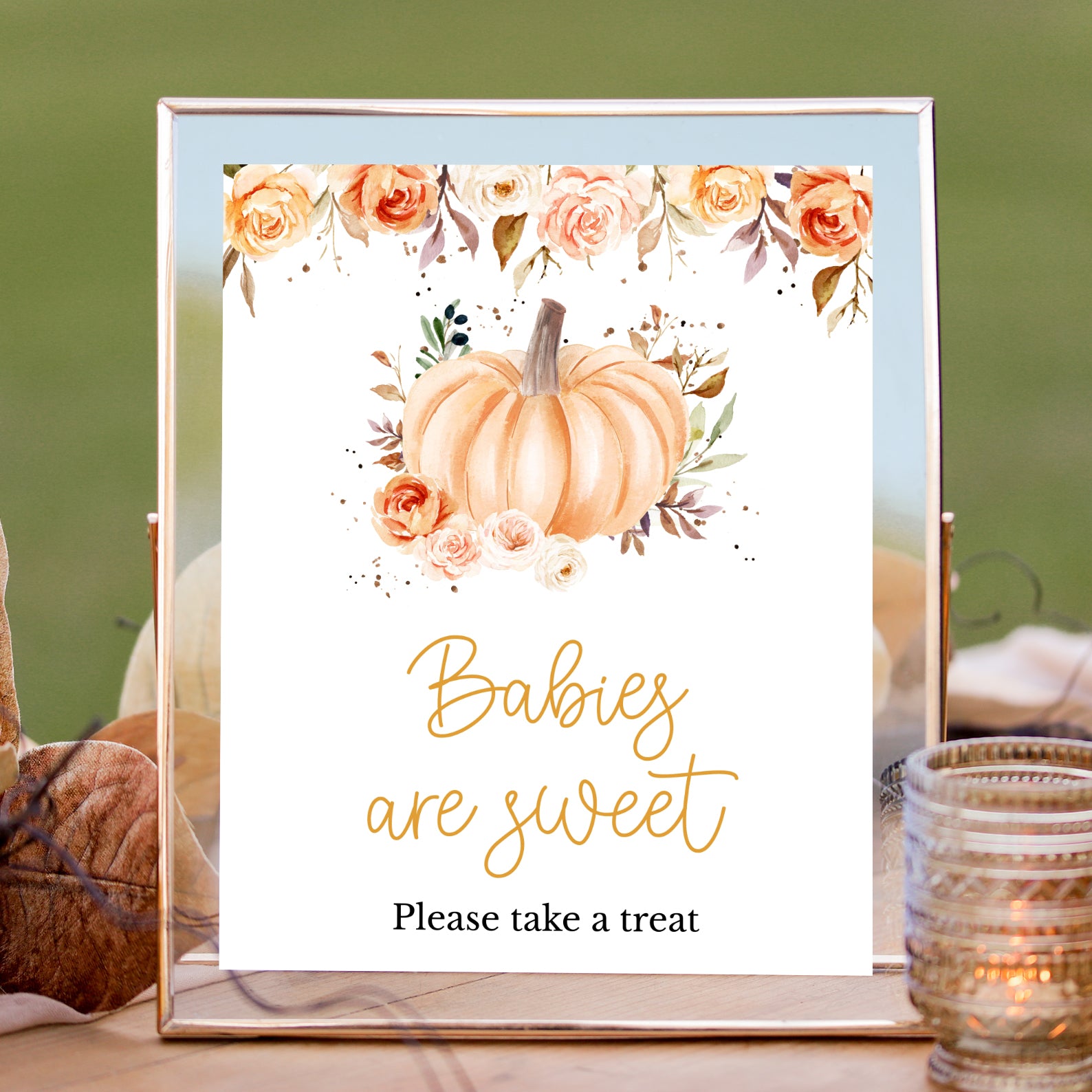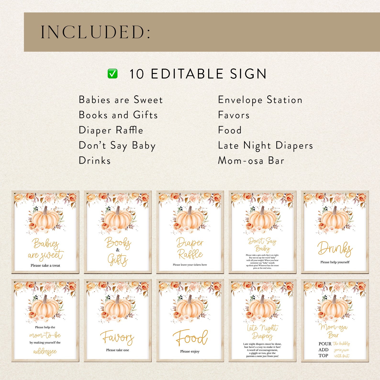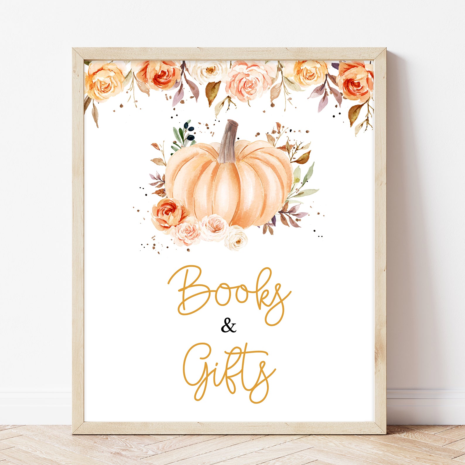 Add a cozy autumn touch to your celebration with this set of ten editable baby shower table signs. Each sign features soft watercolor florals in rich orange hues, paired with delicate fall leaves and a sweet baby pumpkin illustration. Designed to match your seasonal theme, this charming set includes signs for Babies Are Sweet, Books and Gifts, Diaper Raffle, Don't Say Baby, Drinks, Envelope Station, Favors, Food, Late Night Diapers, and Mom-osa Bar.