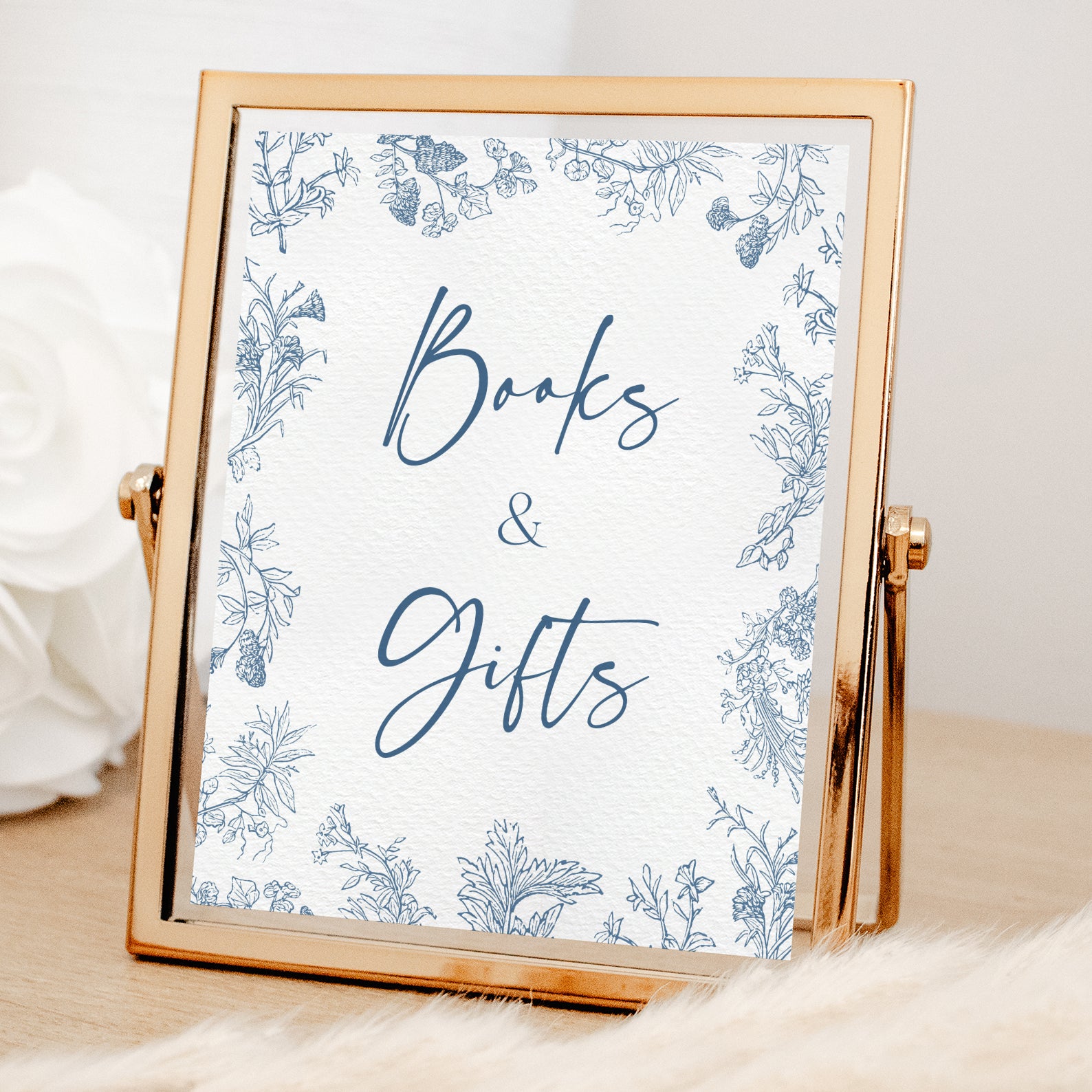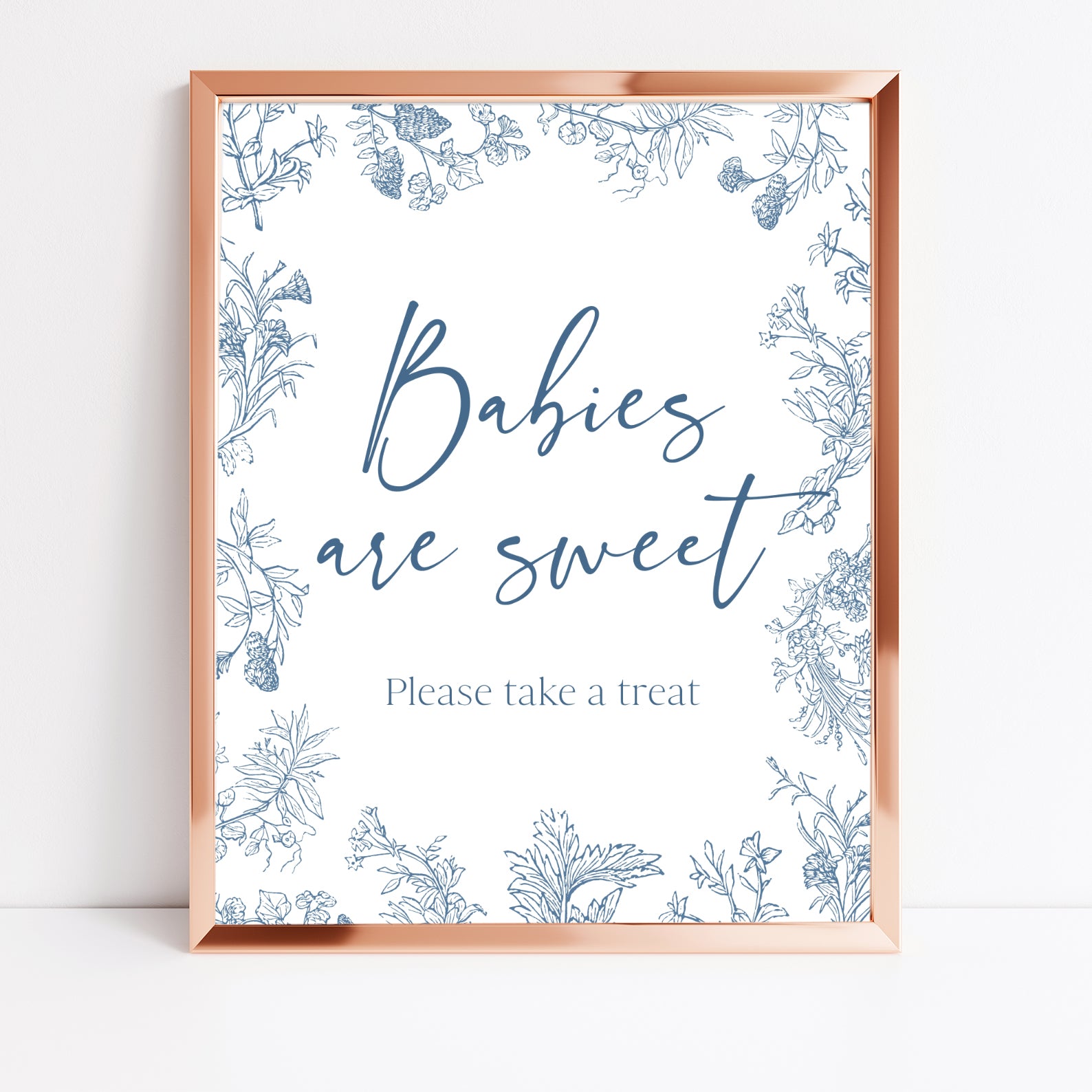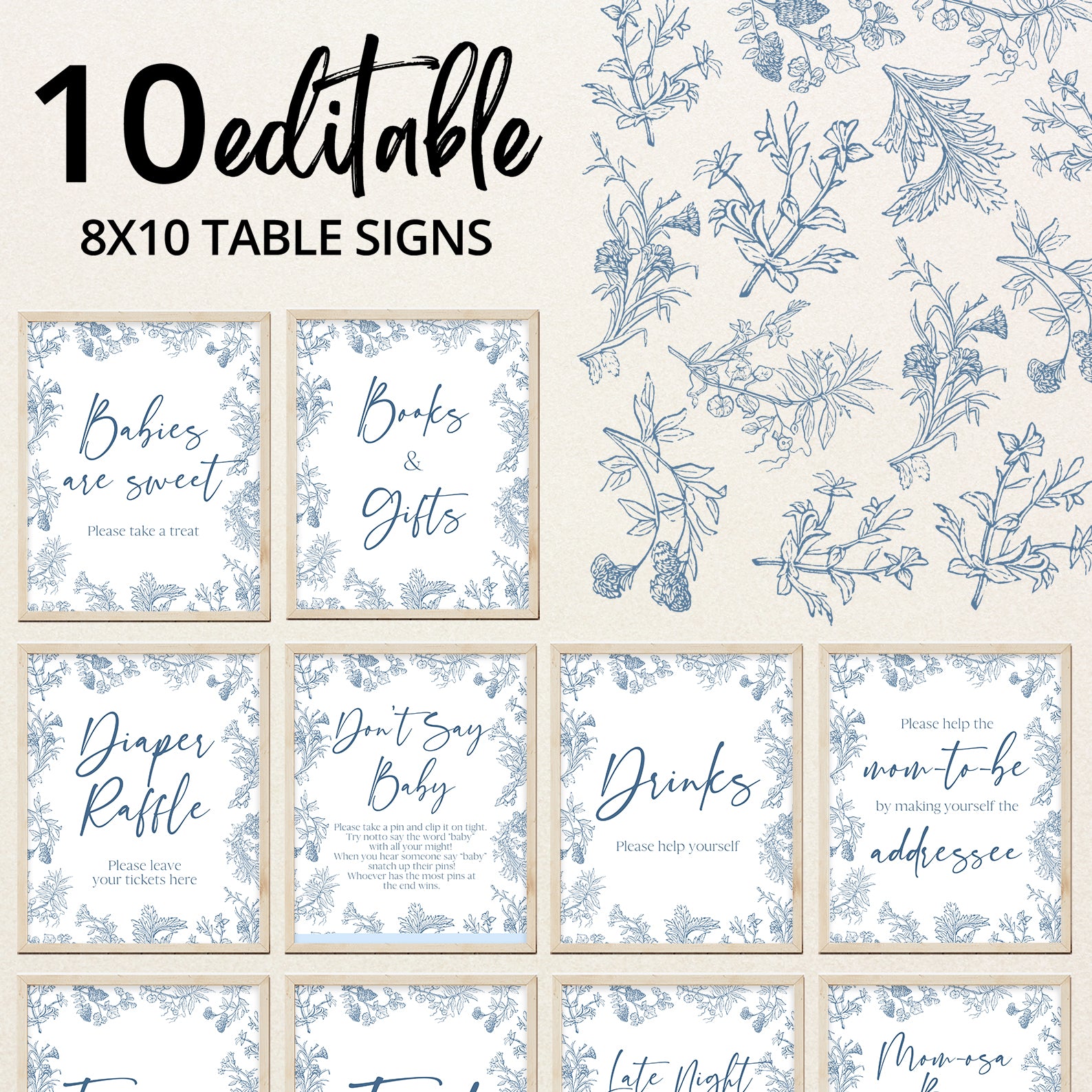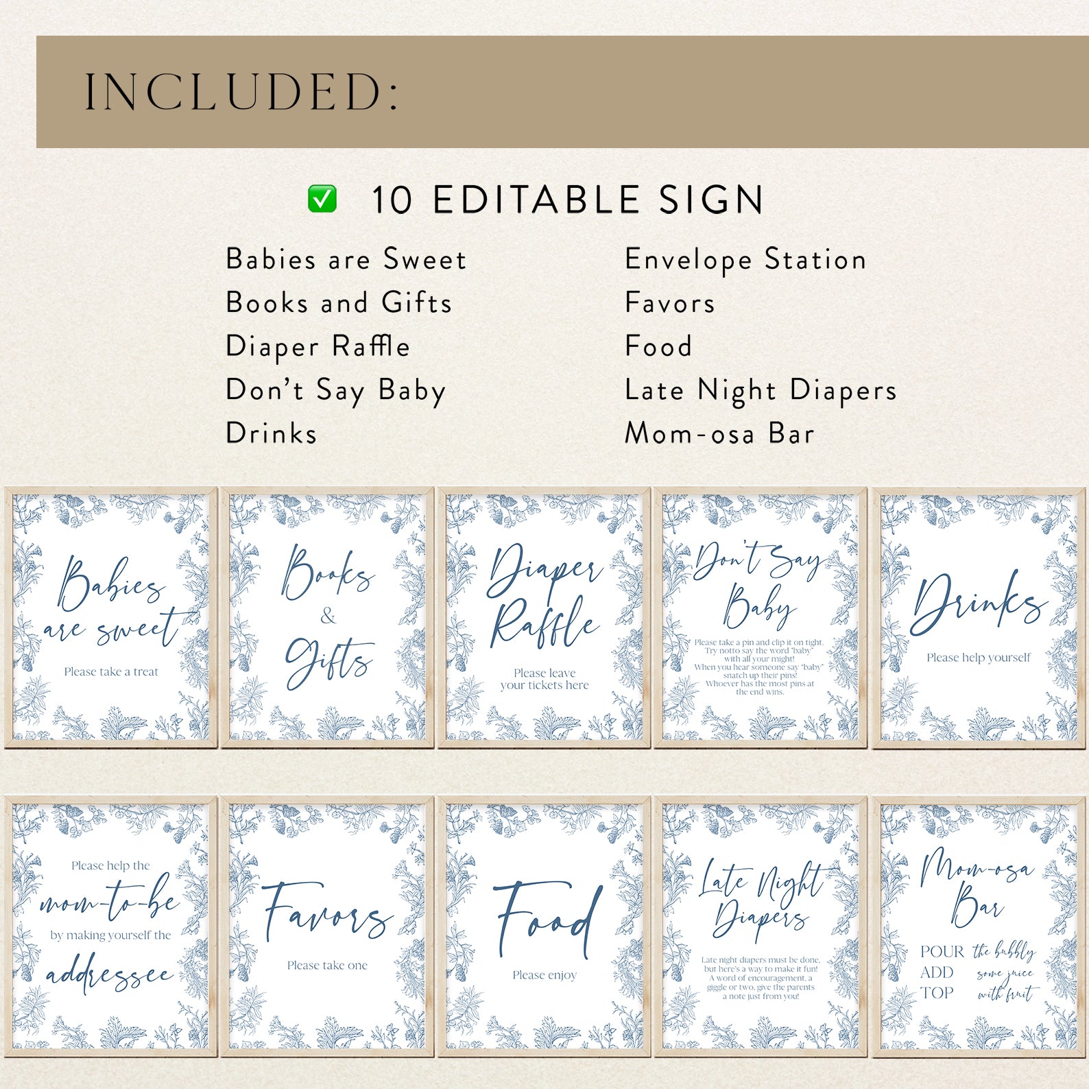 Add a touch of elegance to your baby shower with this set of ten editable table signs, featuring a minimalist design with a sophisticated blue floral pattern border. Perfectly complementing a charming blue-themed celebration, these signs bring both style and functionality to your event. The set includes: Babies Are Sweet, Books and Gifts, Diaper Raffle, Don't Say Baby, Drinks, Envelope Station, Favors, Food, Late Night Diapers, and Mom-osa Bar—ideal for organizing your special day with ease and grace!
