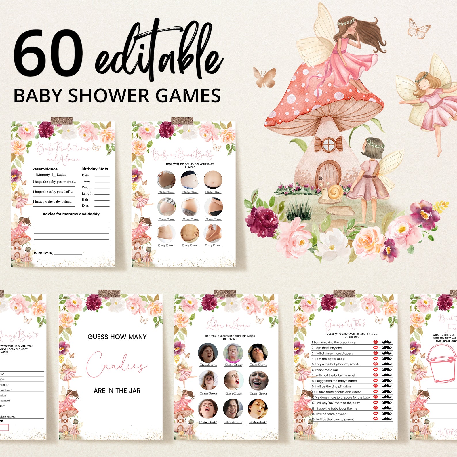 Get ready for fun and laughter with our extensive bundle of 60 editable baby shower games! Featuring charming fall-themed designs inspired by delicate watercolor flowers, playful fairies, fluttering butterflies, and a whimsical red mushroom house, this collection brings a magical touch to your celebration. Easy to customize and share, these games promise to keep your guests entertained while creating joyful memories during your special autumn gathering.